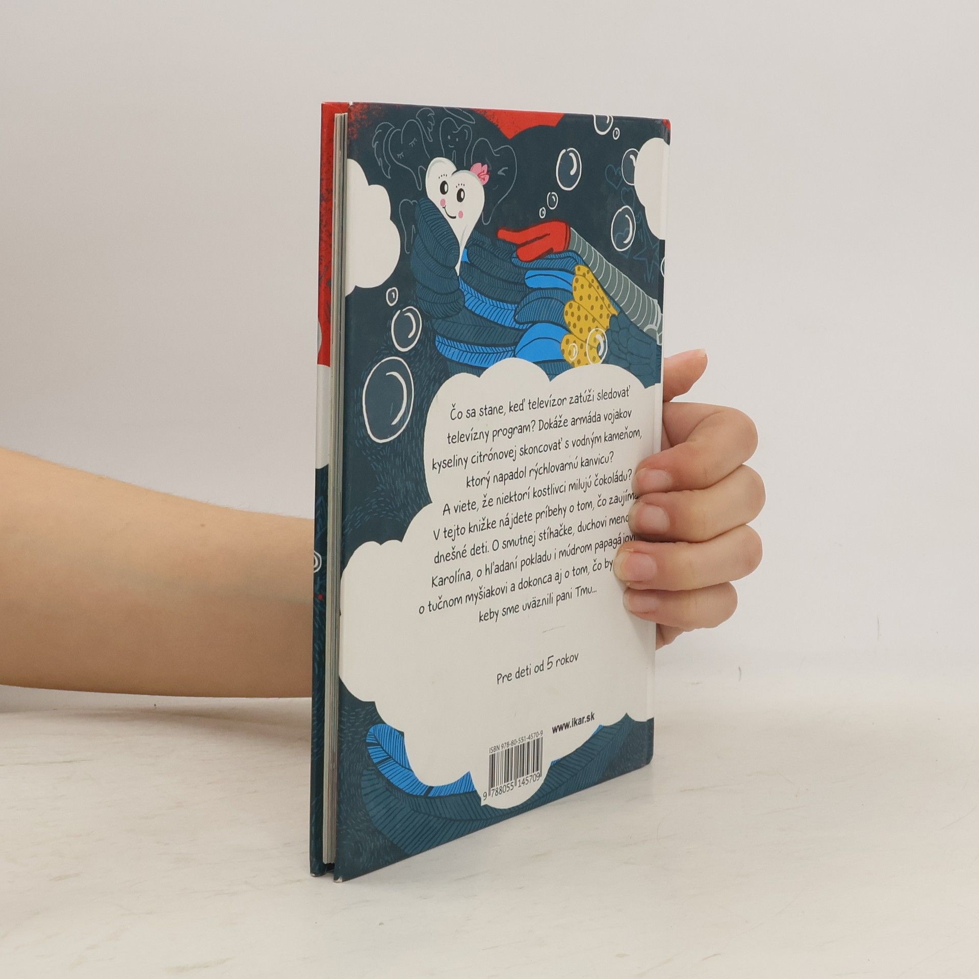 Čo sa stane, keď televízor zatúži sledovať televízny program? Dokáže armáda vojakov kyseliny citrónovej skoncovať s vodným kameňom, ktorý napadol rýchlovarnú kanvicu? A viete, že niektorí kostlivci milujú čokoládu? V tejto knižke nájdete príbehy o tom, čo zaujíma dnešné deti. O smutnej stíhačke, duchovi menom Karolína, hľadaní pokladu, múdrom papagájovi aj o tučnom myšiakovi a dokonca aj o tom, čo by sa stalo, keby sme uväznili pani Tmu...