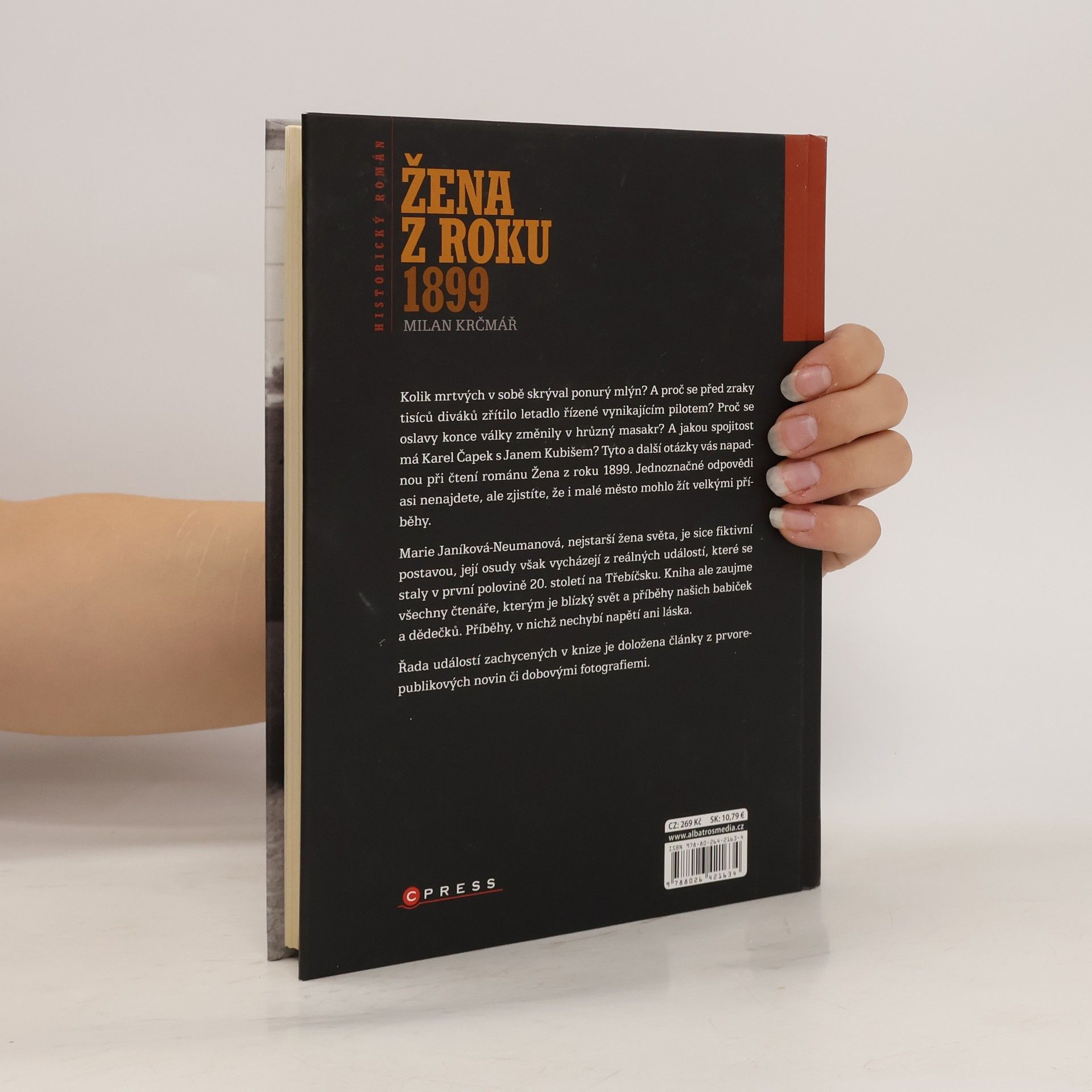 Vyprávění doložené články z provorepublikových novin a dobovými fotografiemi Kolik mrtvých v sobě skrýval ponurý mlýn? A proč se před zraky tisíců diváků zřítilo letadlo řízené vynikajícím pilotem? Proč se oslavy konce války změnily v hrůzný masakr? A jakou spojitost má Karel Čapek s Janem Kubišem? Tyto a další otázky vás napadnou při čtení románu Žena z roku 1899. Jednoznačné odpovědi asi nenajdete, ale zjistíte, že i malé město mohlo žít velkými příběhy. Marie Janíková-Neumanová, nejstarší žena světa, je sice fiktivní postavou, její osudy však vycházejí z reálných událostí, které se staly v první polovině 20. století na Třebíčsku. Kniha ale zaujme všechny čtenáře, kterým je blízký svět a příběhy našich babiček a dědečků. Příběhy, v nichž nechybí napětí ani láska. Řada událostí zachycených v knize je doložena články z prvorepublikových novin či dobovými fotografiemi.
