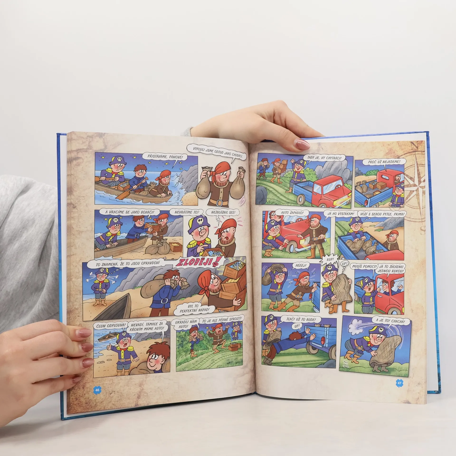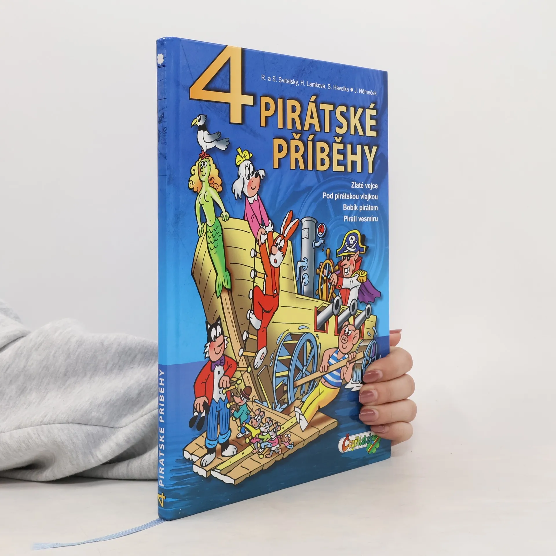 Kniha obsahuje příběhy: Zlaté vejce – Čtyřlístek na dovolené náhodou objeví poklad a podaří se mu zachránit dvě zakleté bytosti. Pod pirátskou vlajkou – Setkání s pravými středověkými piráty v časové smyčce Bermudského trojúhelníku. Bobík pirátem – Neopatrní piráti zamění Bobíka za jednoho ze svých kumpánů, a to se jim šeredně vymstí. Vesmírní piráti – Čtyřlístek se utká s novodobými piráty, které přesvědčí, že je lépe pomáhat, než škodit