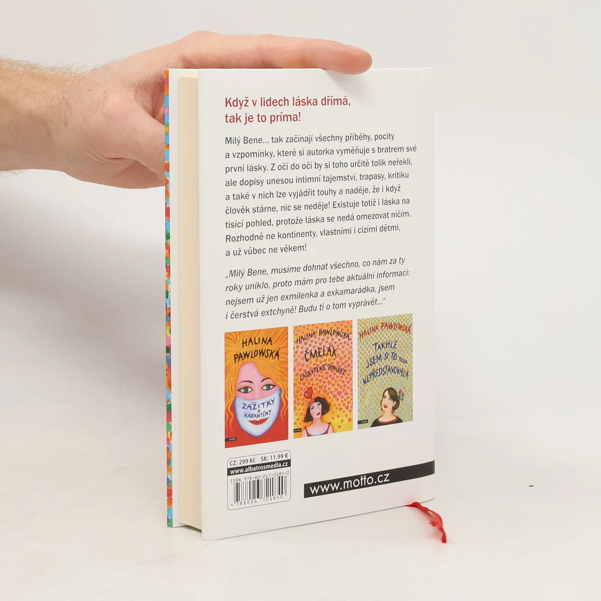 Nová kniha Haliny Pawlowské! Milý Bene… tak začínají všechny příběhy, pocity a vzpomínky, které si autorka vyměňuje s bratrem své první lásky. Z očí do očí by si toho určitě tolik neřekli, ale dopisy unesou intimní tajemství, trapasy, kritiku a také v nich lze vyjádřit touhy a naděje, že i když člověk stárne, nic se neděje! Existuje totiž i láska na tisící pohled, protože láska se nedá omezovat ničím. Rozhodně ne kontinenty, vlastními i cizími dětmi, a už vůbec ne věkem!