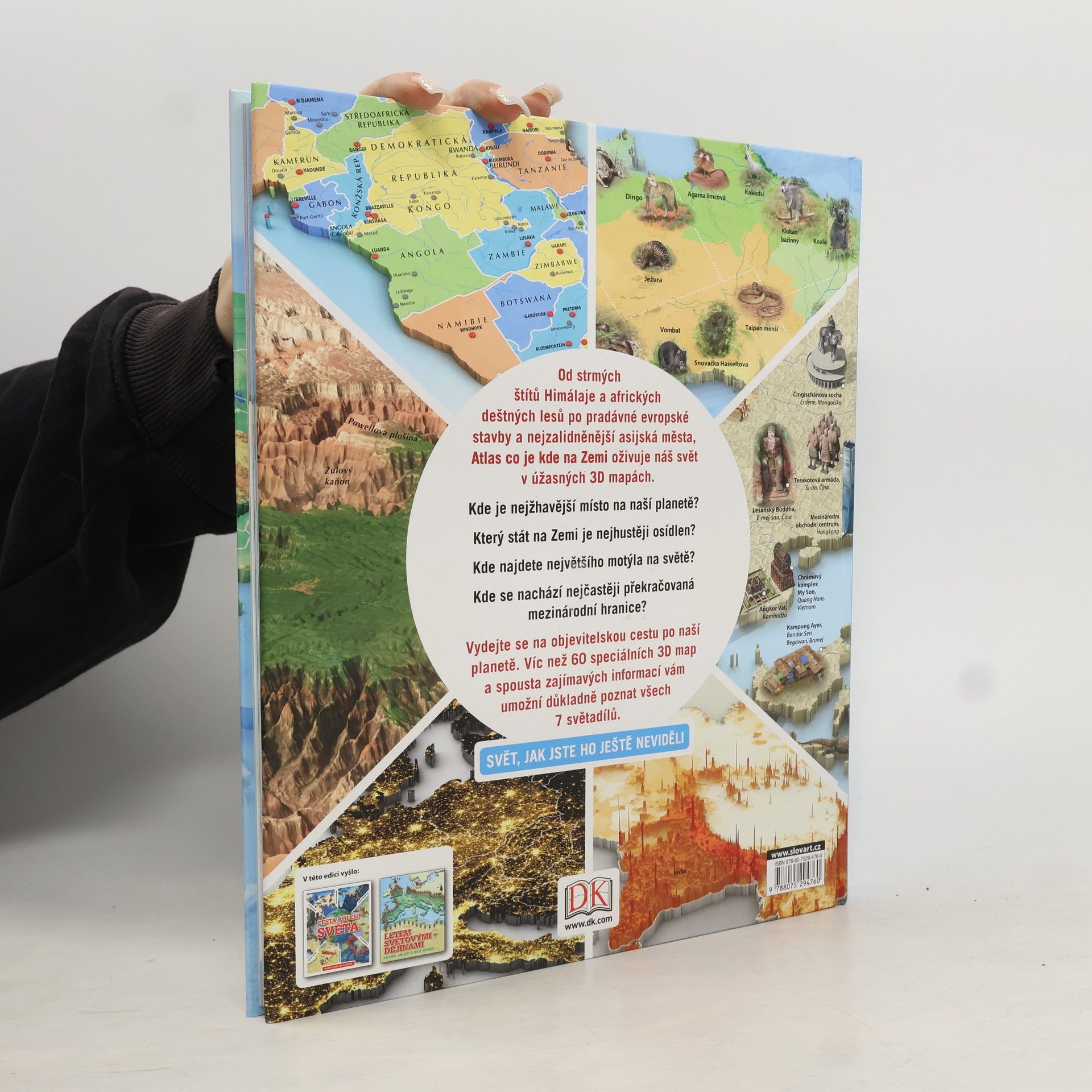 První dětský atlas, který předvádí náš svět ve 3D zobrazení. Díky jeho více než 60 speciálně vytvořeným trojrozměrným mapám a ilustracím se malí čtenáři seznámí se všemi světadíly Země. V úvodu Atlas navíc přináší i obrazové vysvětlení jejího vývoje. Každý světadíl doprovázejí 3D mapy, které rozebírají jeho zeměpisnou charakteristiku, podnebí, města, pamětihodnosti, obyvatelstvo, zvířenu a přinášejí další informace. To vše doprovázejí i přehledné vysvětlující legendy a řada nejrůznějších zajímavostí. Nechybí ani slovníček s vysvětlivkami a seznamem států světa s krátkými charakteristikami.