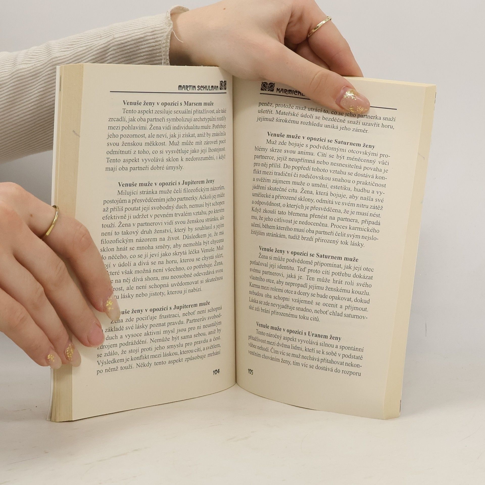 Jak často se nacházíme ve vztazích, které odrážejí minulost a opakují důvěrně známé, ale ničivé vzory? Jak často jsme se snažili analyzovat nezdravý nebo nešťastný vztah z psychologického hlediska, jen abychom zjistili, že tento výklad „nesedí“? Martin Schulman naznačuje, že můžeme dosáhnout hlubšího a konstruktivnějšího porozumění, pokud ve vztazích zkoumáme karmické vrstvy – takové postoje, chování a víry, které jsou pozůstatkem minulých životů a které stojí v cestě tomu, abychom dosáhli harmonie a rovnováhy, dvou nezbytných předpokladů pro dlouhotrvající vztah. Schulman interpretuje aspekty každé planety, a to z toho hlediska, jak se ve vztazích odráží vliv karmy. Srovnává všechny možné kombinace hlavních aspektů a ukazuje čtenáři, jak se jedna stránka osobnosti (představována planetou) srovnává s planetami v horoskopu vašeho partnera. Co způsobuje v našem vztahu stres a co naopak pohodu? Jaké lekce nám může daný vztah udělit a co můžeme udělat pro to, abychom se z nich poučili? Na základě karmického pohledu na naše vztahy můžeme růst jak duchovně, tak citově.