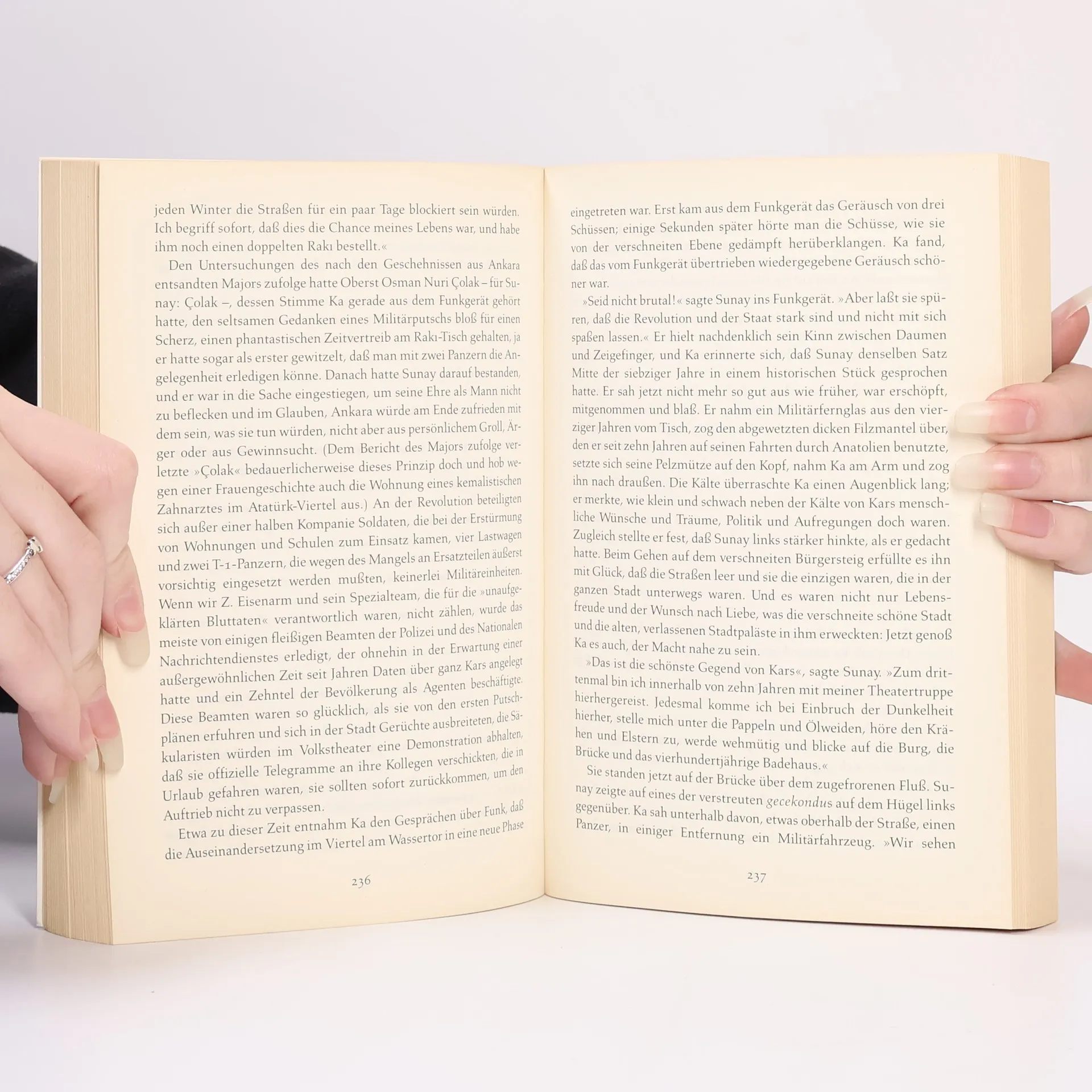 Ka soll für eine Istanbuler Zeitung eine merkwürdige Serie von Selbstmorden untersuchen: Junge Mädchen haben sich umgebracht, weil man sie zwang, das Kopftuch abzulegen. Eingebettet in eine raffinierte und spannende Kriminalgeschichte steht der Konflikt zwischen Verwestlichung und Islamismus -
