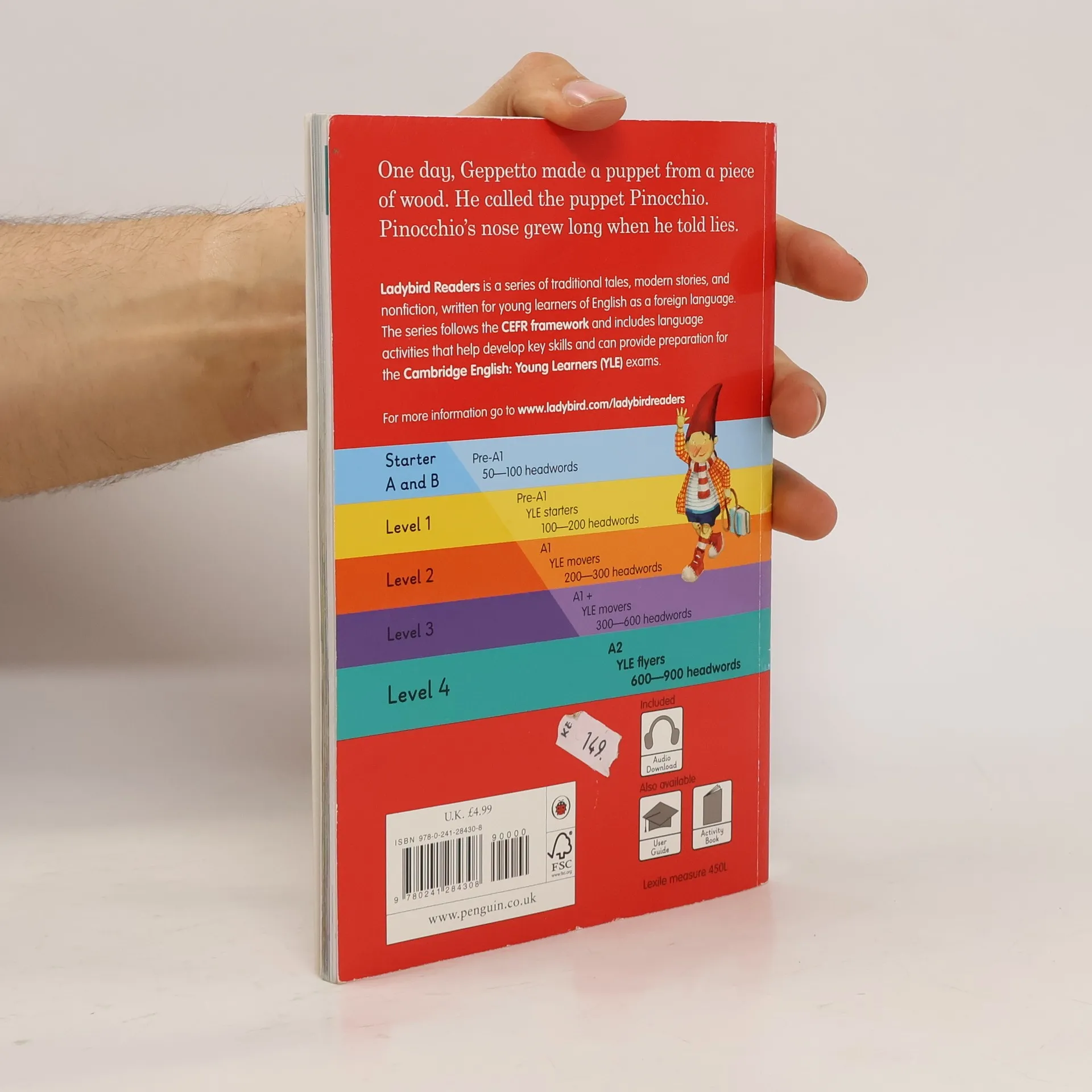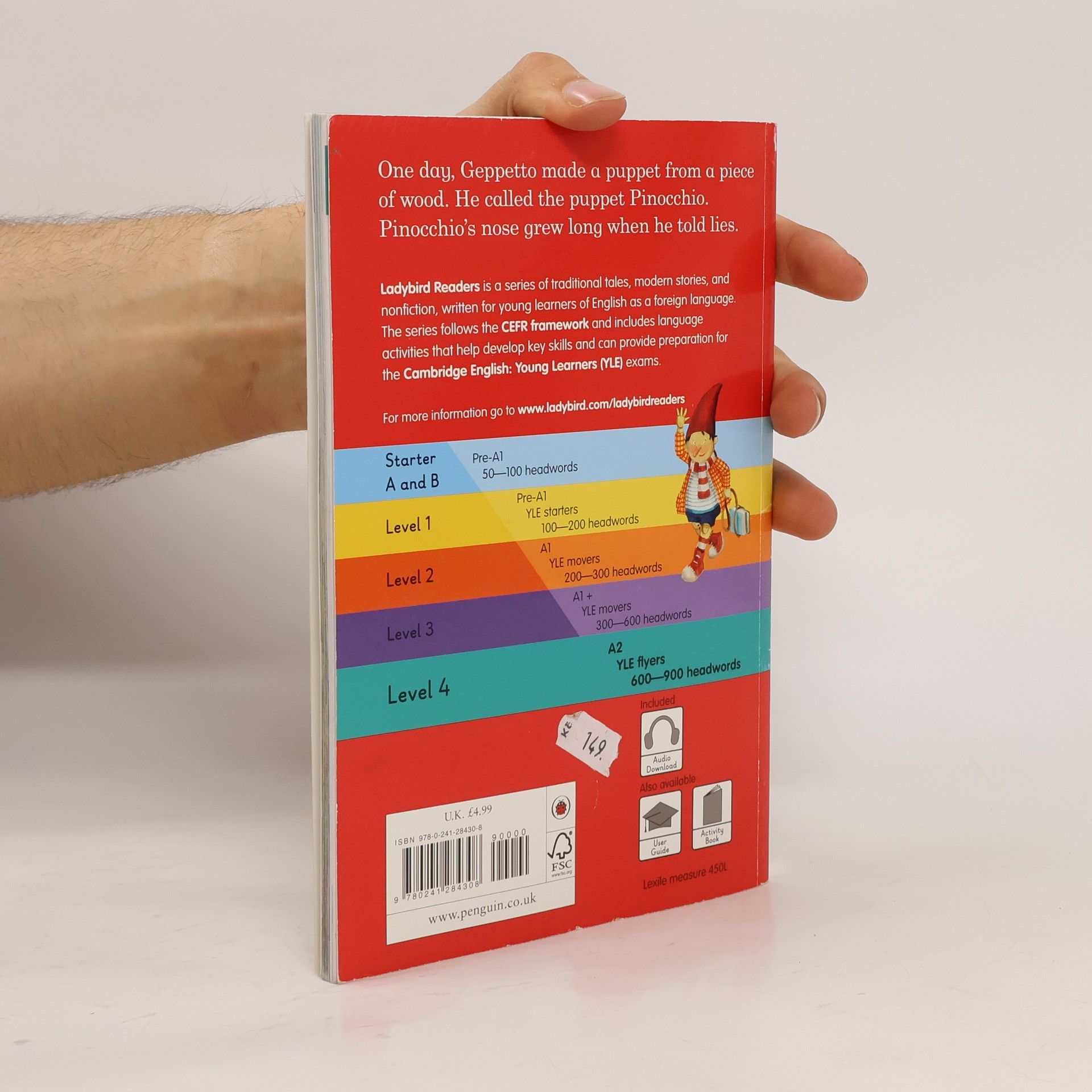 Ladybird Readers is an ELT graded reader series for children aged 3-11 learning English as a foreign or second language. The series includes traditional tales, popular characters, modern stories, and non-fiction. - Beautifully illustrated books, carefully written by language learning experts. - Structured language progression to develop children's reading, writing, speaking, listening and critical thinking skills. - Eight levels follow the Common European Framework of Reference for language learning (CEFR). - Language activities provide preparation for the Cambridge English Pre-A1 to A2 (YLE) tests. - A unique code in each printed book provides access to online audio, extra activities and learning resources. Pinocchio, a Level 4 Reader, is A2 in the CEFR framework and includes practice for the Cambridge English A2 Flyers tests. The longer text is made up of sentences with up to three clauses, more past and future tense structures, modal verbs and a wider variety of conjunctions. One day, Geppetto made a puppet from a piece of wood. He called the puppet Pinocchio. Pinocchio's nose grew long when he told lies. Visit the Ladybird Education website for more information.
