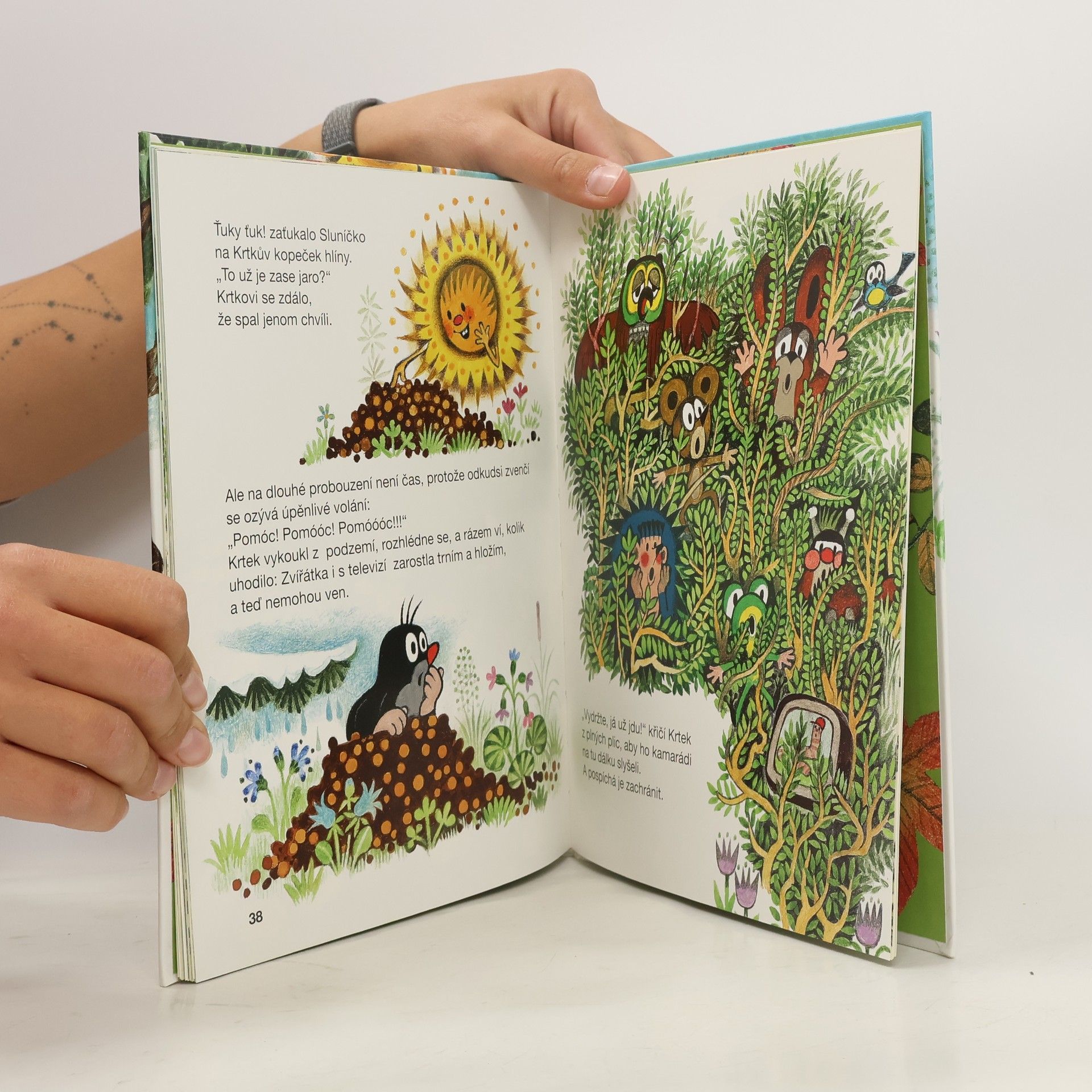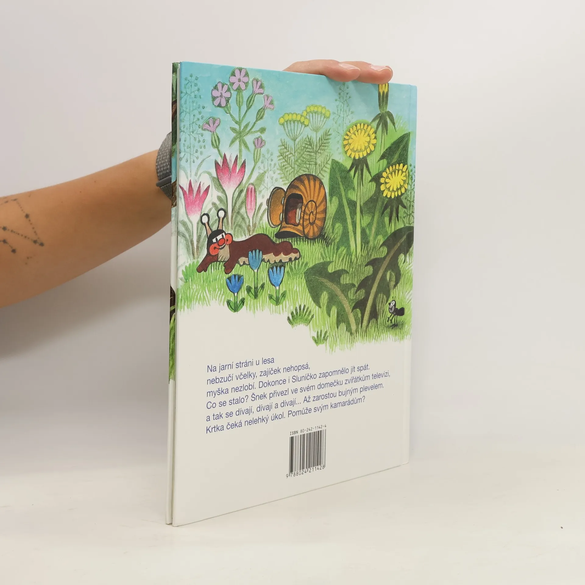 Na jarní stráni u lesa nebzučí včelky, zajíček nehopsá, myška nezlobí. Dokonce i Sluníčko zapomělo jít spát. Co se stalo? Šnek přivezl ve svém domečku zvířátkům televizi, a tak se dívají, dívají a dívají... Až zarostou bujným plevelem. Krtka čeká nelehký úkol. Pomůže svým kamarádům?