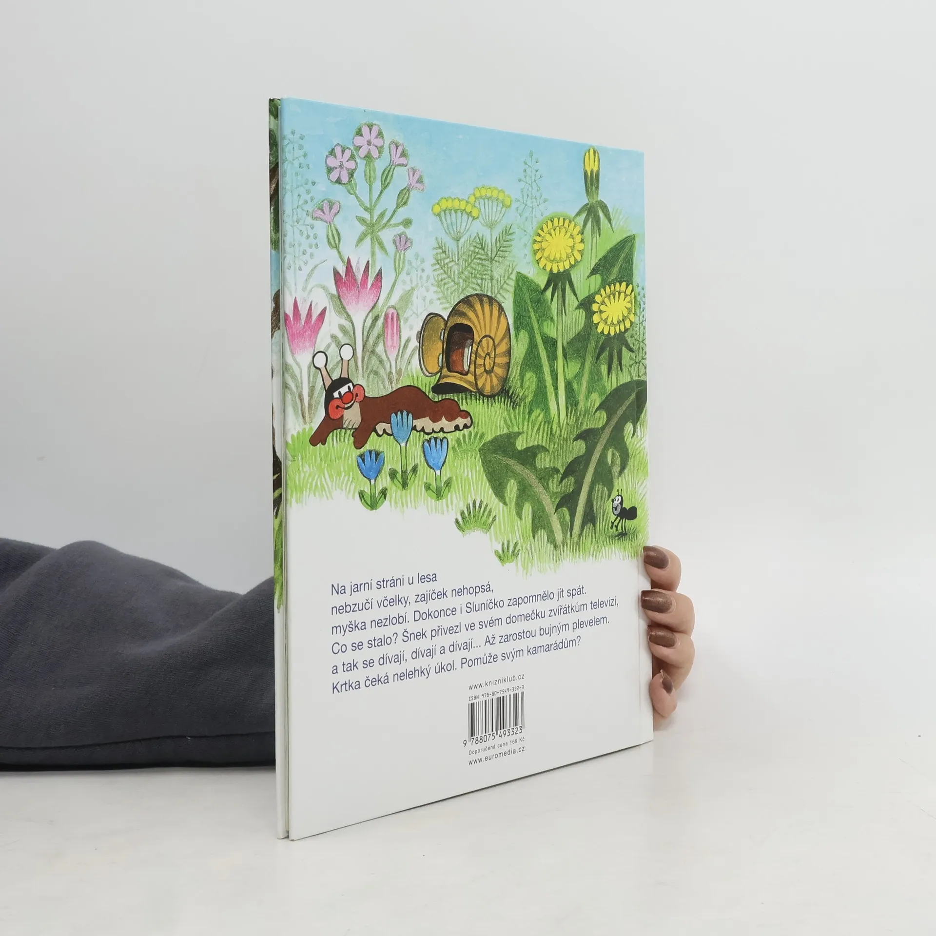 Na jarní stráni u lesa nebzučí včelky, zajíček nehopsá, myška nezlobí. Dokonce i Sluníčko zapomnělo jít spát. Co se stalo? Šnek přivezl ve svém domečku zvířátkům televizi, a tak se dívají, dívají a dívají... Až zarostou bujným plevelem. Krtka čeká nelehký úkol. Pomůže svým kamarádům?