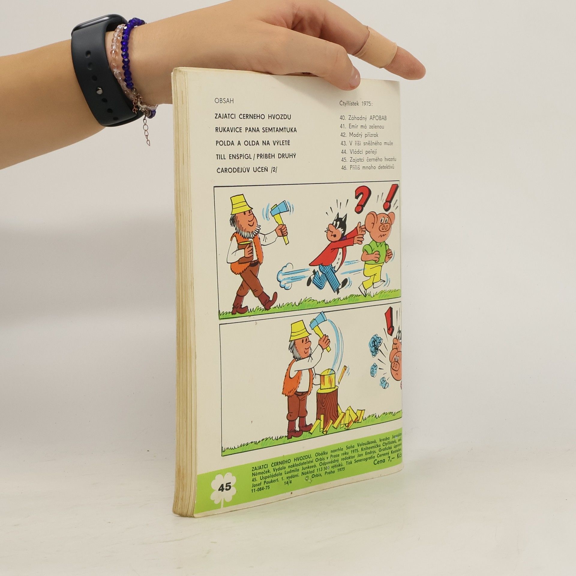 45. díl série. Čtyřlístek : Zajatci černého hvozdu - Ljuba Štíplová, Jaroslav Němeček. Rukavice pana Semtamťuka - Svatopluk Hrnčíř, Adolf Born. Polda a Olda na výletě - Petr Chvojka, Jaroslav Malák. Till Enšpígl - příběh druhý - Charles de Coster, Jan Matěják. Čarodějův učedník- Václav Junek, Ivo Šedivý.