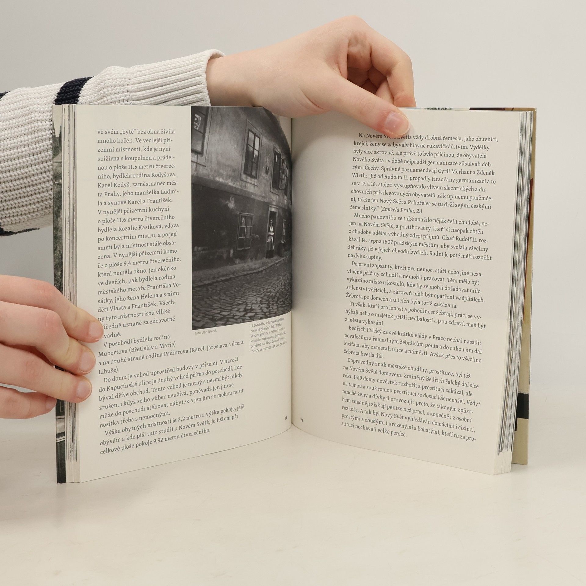 Jan Blesík (1909–1985) prožil na Novém Světě desítky let a podrobně zmapoval tuto kouzelnou lokalitu staré Prahy. Postupoval dům od domu, zaznamenal jejich historii, slavné i obyčejné postavy, které tu žily. Autorce konceptu knihy Heleně H. Zahrádecké se podařilo shromáždit bohatou – a hlavně zcela unikátní — fotografickou výbavu pocházející často ze soukromých archívů zdejších obyvatel. Doslovem opatřili knihu Alena Ježková (autorka cyklu Tichá srdce o životě v českých klášterech) a Dan Hrubý (Pražské příběhy). Jde o první svazek edice Praha soukromá, v níž budeme přinášet dosud nepublikované vzpomínky obyvatel starých pražských čtvrtí, neznámé nebo zapomenuté rukopisy nalezené v zasutých koutech soukromých archívů.