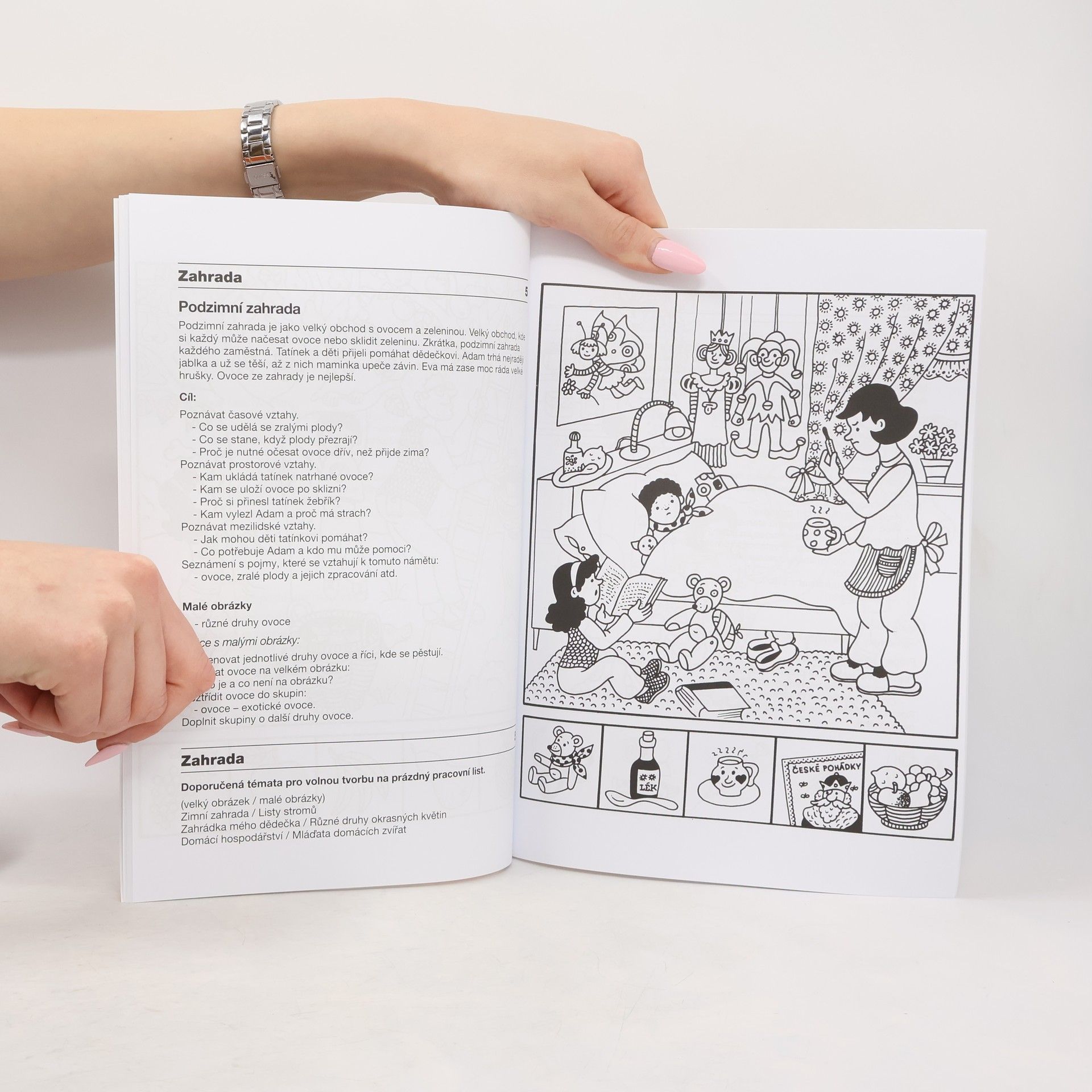 Pracovní listy jsou věnovány výše zmíněným deseti tématům, které respektují zkušenosti dětí a současně pomáhají rozvíjet jejich znalosti a dovednosti. Základní námět má vždy tři situace, které na sebe mohou, ale nemusí navazovat. Čtvrtá situace je určena vlastnímu řešení dítěte na prázdný pracovní list. Každý pracovní list obsahuje velký obrázek situace, která je tématem činnosti. Spodní část listu obsahuje pět malých obrázků, které umožňují rozvíjet slovní zásobu a jsou základem k řešení jednoduchých úkolů. Malé obrázky je možné vybarvit, vystřehnout a manipulovat s nimi podle pokynů. Text je psán velkým písmem, takže školáci mohou pracovní listy využívat samostatně.