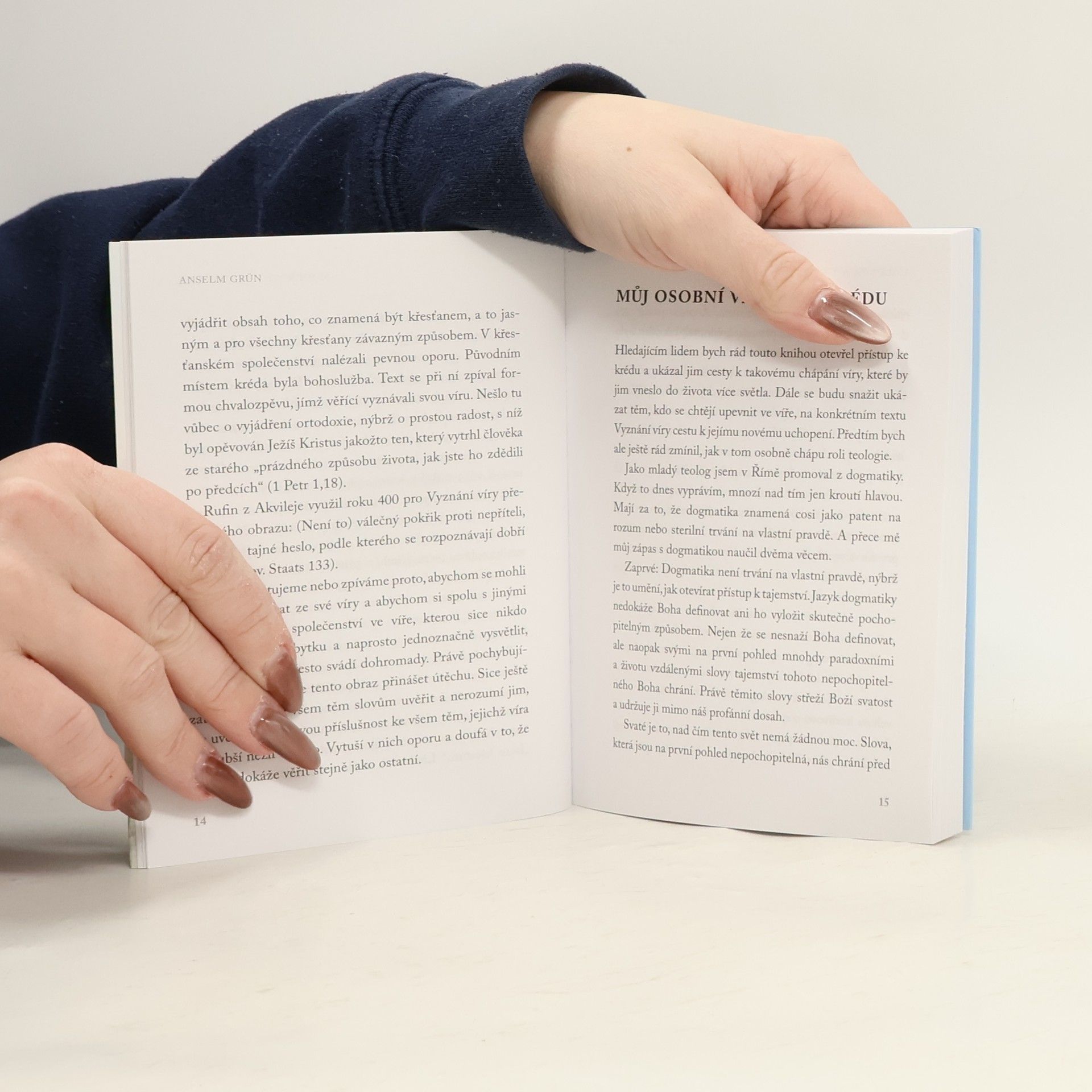 Nová kniha Anselma Grüna se věnuje výkladu křesťanského vyznání víry. Objasňuje slova, která stojí v základu křesťanského pohledu na svět. Díky srozumitelnému jazyku vede věřící i nevěřící k poznání toho, jaké věroučné, existenciální i terapeutické významy se skrývají za 1700 let starými formulacemi vyznání. Grün rozebírá každé slovo či verš kréda a velmi jasně a srozumitelně, přitom ale bez větších zjednodušování, vykládá historické souvislosti vzniku daného verše a jeho křesťanský teologický význam. Přidává ale vždy i určitý obraz, který daný verš obsahuje a jenž pak používá v terapeutickém smyslu. Pomocí slov vyznání vede čtenáře k ústředním tajemstvím křesťanské víry, která vztahuje ke zkušenosti člověka jako takového, a nechává ho, aby se tímto tajemstvím nechal oslovit. Vyznání pro něj není jen výpověď o Bohu, ale též výpověď o člověku obecně a jedinci zvlášť.