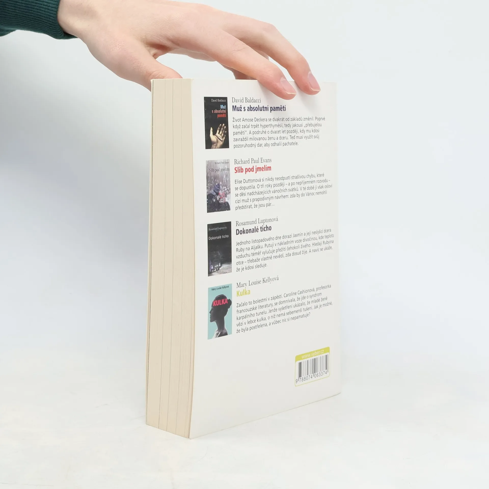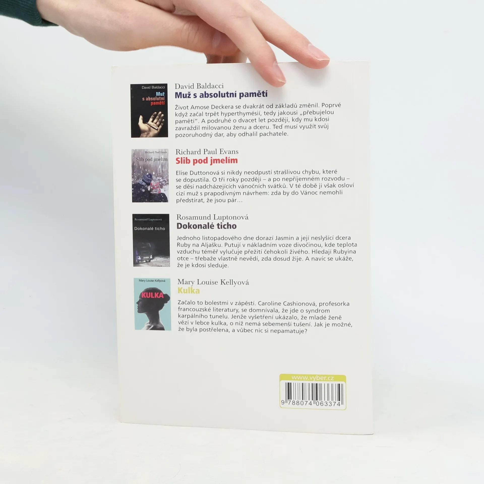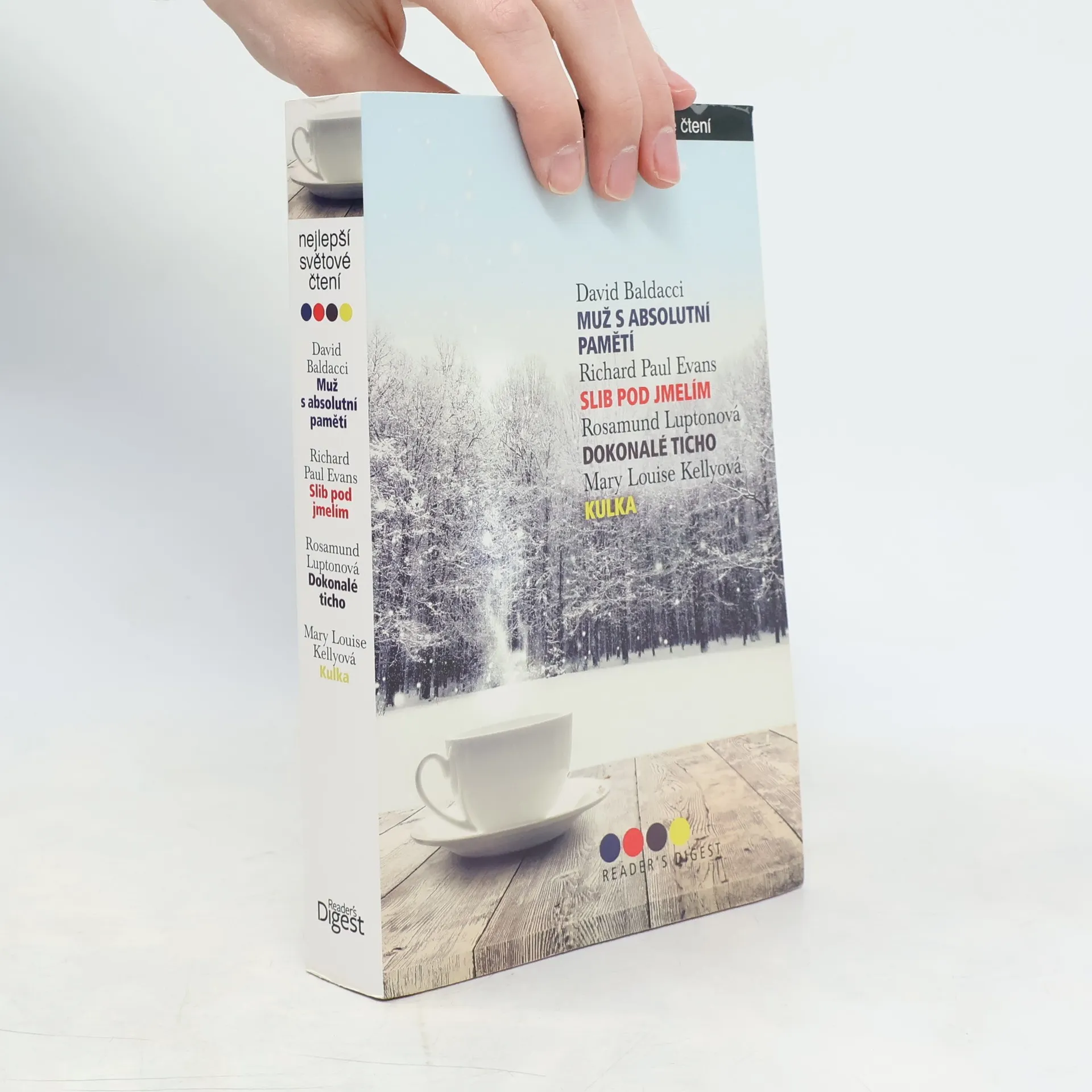 Svazek obsahuje zkrácené verze čtyř úspěšných románů oddychových žánrů od současných angloamerických autorů. Jednotlivé tituly jsou doplněny stručnými informacemi o jejich tvůrcích. Hrdinou thrilleru „Muž s absolutní pamětí“ Davida baldacciho je Amos Decker, jenž dostal do života danajský dar - hypertrofovanou paměť, schopnou uchovat neuvěřitelné množství informací. Když ho neznámý vrah připraví o ženu a dceru, možná se Amosova anomálie bude hodit. Romantický žánr zastupuje Richard Paul Evans románem „Slib pod jmelím“. Čerstvě rozvedená, osamělá hrdinka je v něm překvapena návrhem neznámého muže předstírat v předvánoční době, že je jeho partnerkou. Kdo ví, k čemu takové předstírání může nakonec vést... „Dokonalé ticho“ anglické autorky Rosamund Luptonové je thriller o putování matky s hluchou dcerou polární krajinou za otcem, který se ztratil při požáru inuitské vesnice na severu Aljašky. Detektivní thriller „Kulka“ od Mary Louise Kellyové pracuje s motivem postupného odhalování doposud skryté záhadné minulosti hlavní hrdinky Caroline Cashionové, ve které se skrývá nevyřešený zločin.
