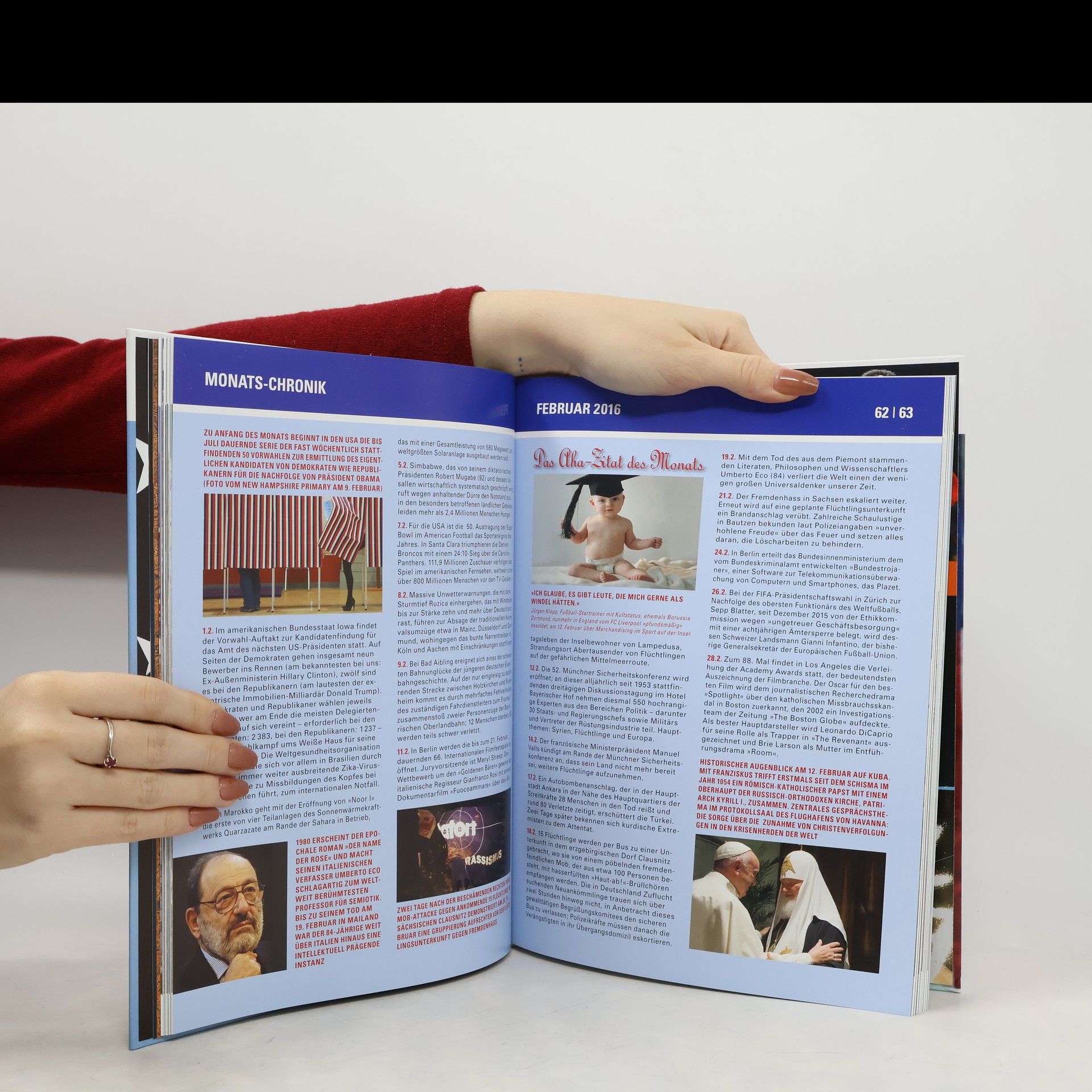 Sportlich werden 2016 zwei Großereignisse im Mittelpunkt des Jahres stehen: die Fußball-Europameisterschaft der Männer im Juni in Frankreich sowie die XXXI. Olympischen Sommerspiele in Rio de Janeiro im August, die mit einigen Sonderseiten gewürdigt werden. In Stockholm wird der 61. Eurovision Song Contest ausgetragen. Politisch werden wir in Deutschland im März einen Super-Wahlsonntag mit Urnengängen in Baden-Württemberg, Sachsen-Anhalt und Rheinland-Pfalz haben. Im September wird dann auch in Mecklenburg-Vorpommern und Berlin gewählt. Im November steht dann auch noch die amerikanischen Präsidentenwahl an. Was auch immer wo auch immer passiert: Der attraktive Erinnerungsband Das Jahr im Bild 2016 hält es für Sie fest
