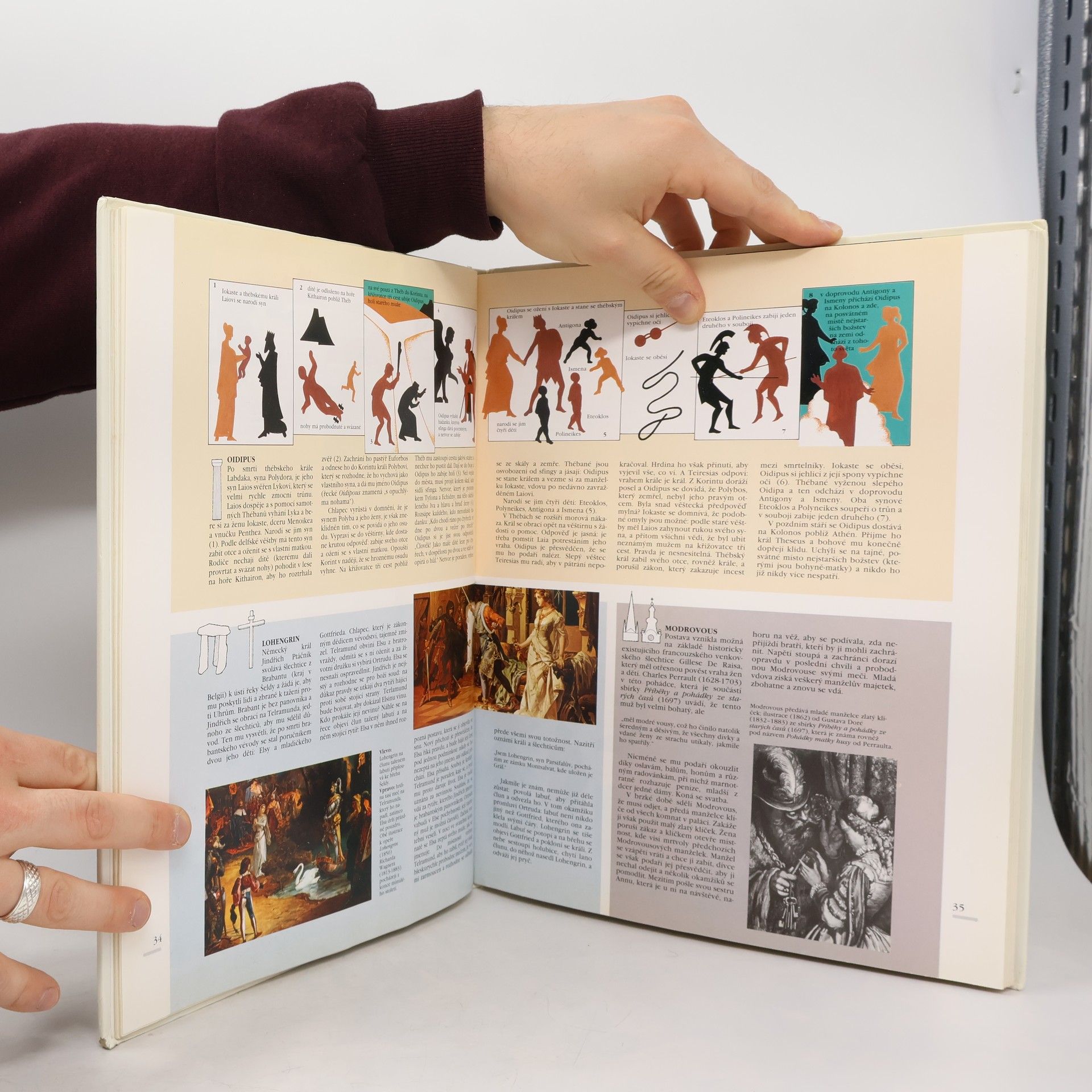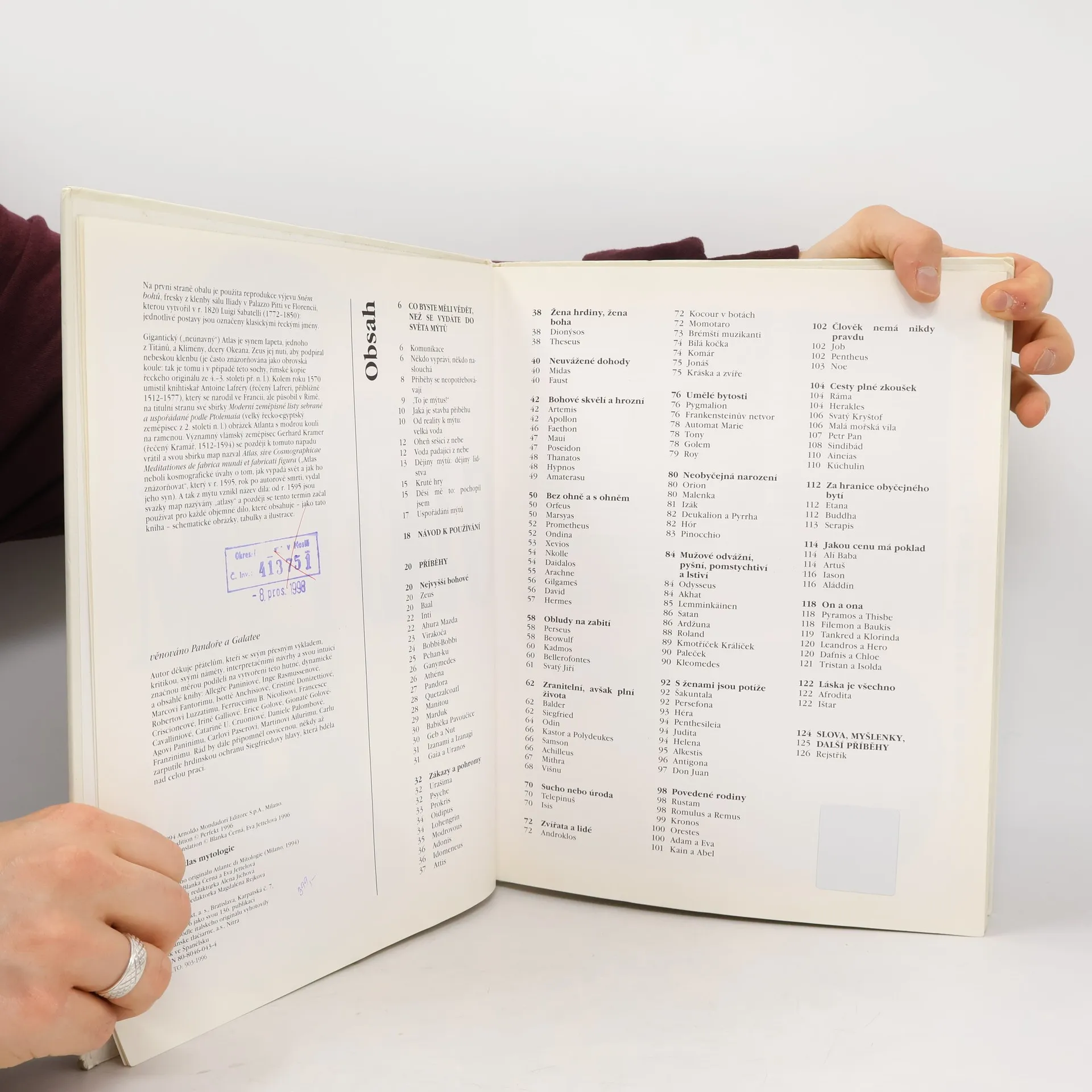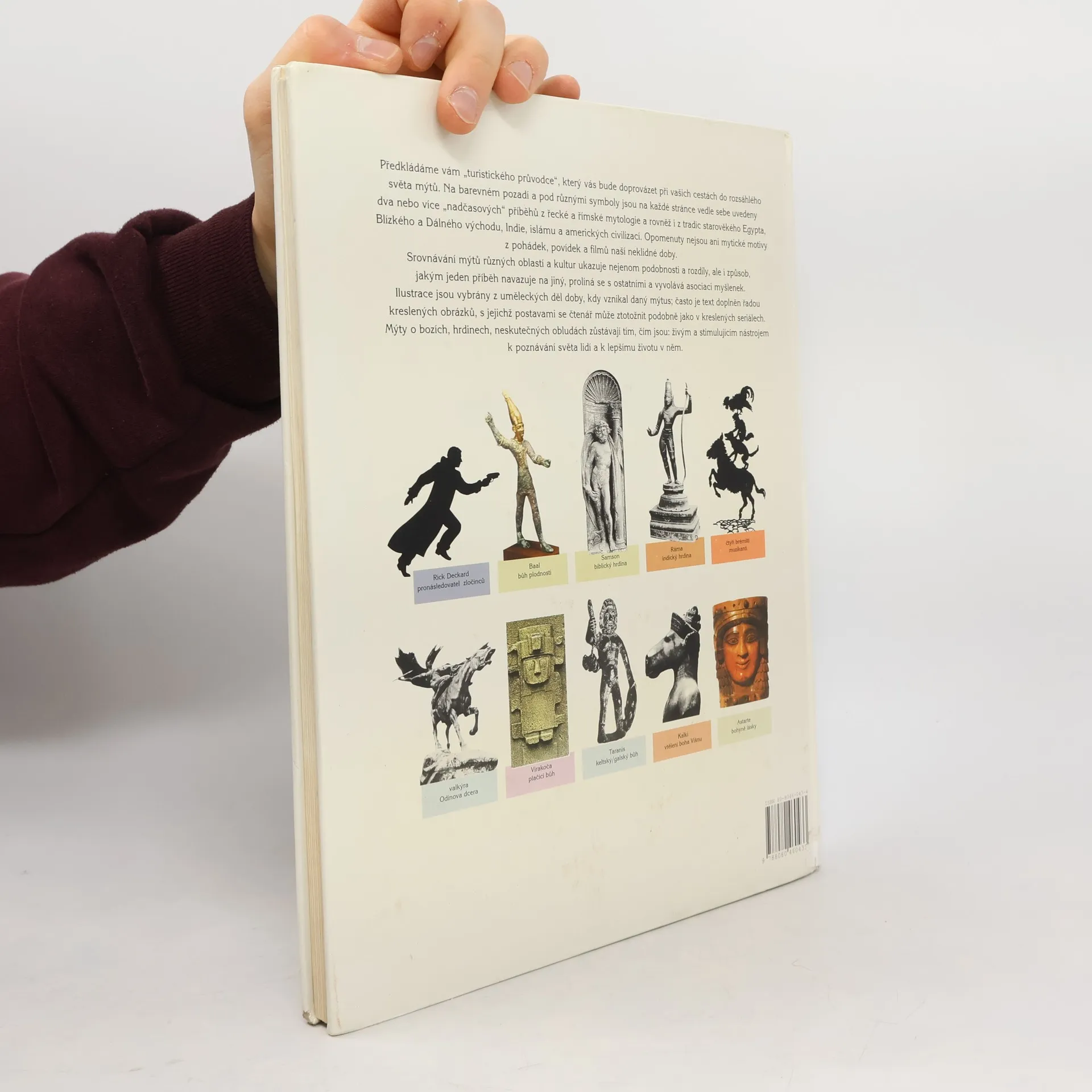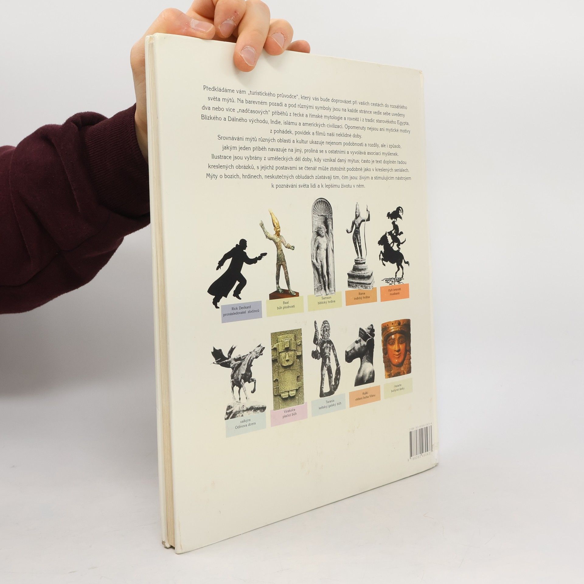 Předkládáme vám "turistického průvodce", který vás bude doprovázet při vašich cestách do rozsáhlého světa mýtů. Na barevném pozadí a pod různými symboly jsou na každé stránce vede sebe uvedeny dva nebo více "nadčasových" příběhů z řecké a římské mytologie a rovněž i z tradic starověkého Egypta, Blízkého a Dálného východu, Indie, islám a amerických civilizací. Opomenuty nejsou ani mytické motivy z pohádek, povídek a filmů naší neklidné doby. Srovnávání mýtů různých oblastí a kultur ukazuje nejenom podobnosti a rozdíly, ale i způsob, jakým jeden příběh navazuje na jiný, prolíná se s ostatními a vyvolává asociaci myšlenek. Ilustrace jsou vybrány z uměleckých děl doby, kdy vznikal daný mýtus; často je text doplněn řadou kreslených obrázky, s jejichž postavami se čtenář může ztotožnit podobně jako v kreslených seriálech. Mýty o bozích, hrdinech, neskutečných obludách zůstávají tím, čím jsou: živým a stimulujícím nástrojem k poznávání světa lidí a k lepšímu životu v něm.