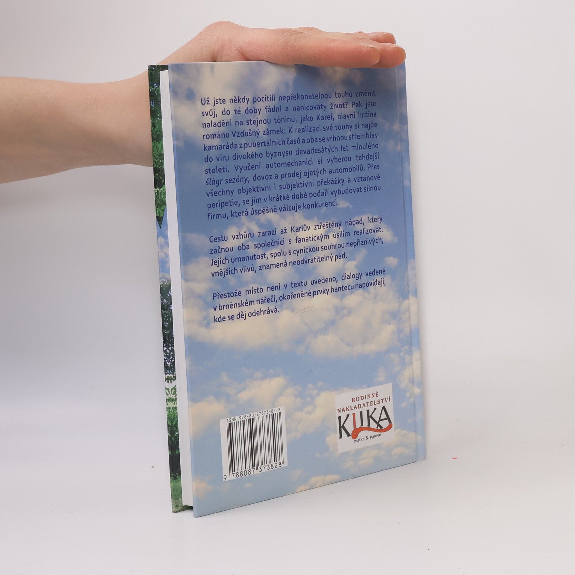 Už jste někdy pocítili nepřekonatelnou touhu změnit svůj, do té doby fádní a nanicovatý život? Pak jste naladěni na stejnou tóninu, jako Karel, hlavní hrdina románu Vzdušný zámek. K realizaci své touhy si najde kamaráda z pubertálních časů a oba se vrhnou střemhlav do víru divokého byznysu devadesátých let minulého století. Vyučení automechanici si vyberou tehdejší šlágr sezóny, dovoz a prodej ojetých automobilů. Přes všechny objektivní i subjektivní překážky a vztahové peripetie, se jim v krátké době podaří vybudovat silnou firmu, která úspěšně válcuje konkurenci. Cestu vzhůru zarazí až Karlův ztřeštěný nápad, který začnou oba společníci s fanatickým úsilím realizovat. Jejich umanutost, spolu s cynickou souhrou nepříznivých, vnějších vlivů, znamená neodvratitelný pád. Přestože místo není v textu uvedeno, dialogy vedené v brněnském nářečí, okořeněné prvky hantecu napovídají, kde se děj odehrává.