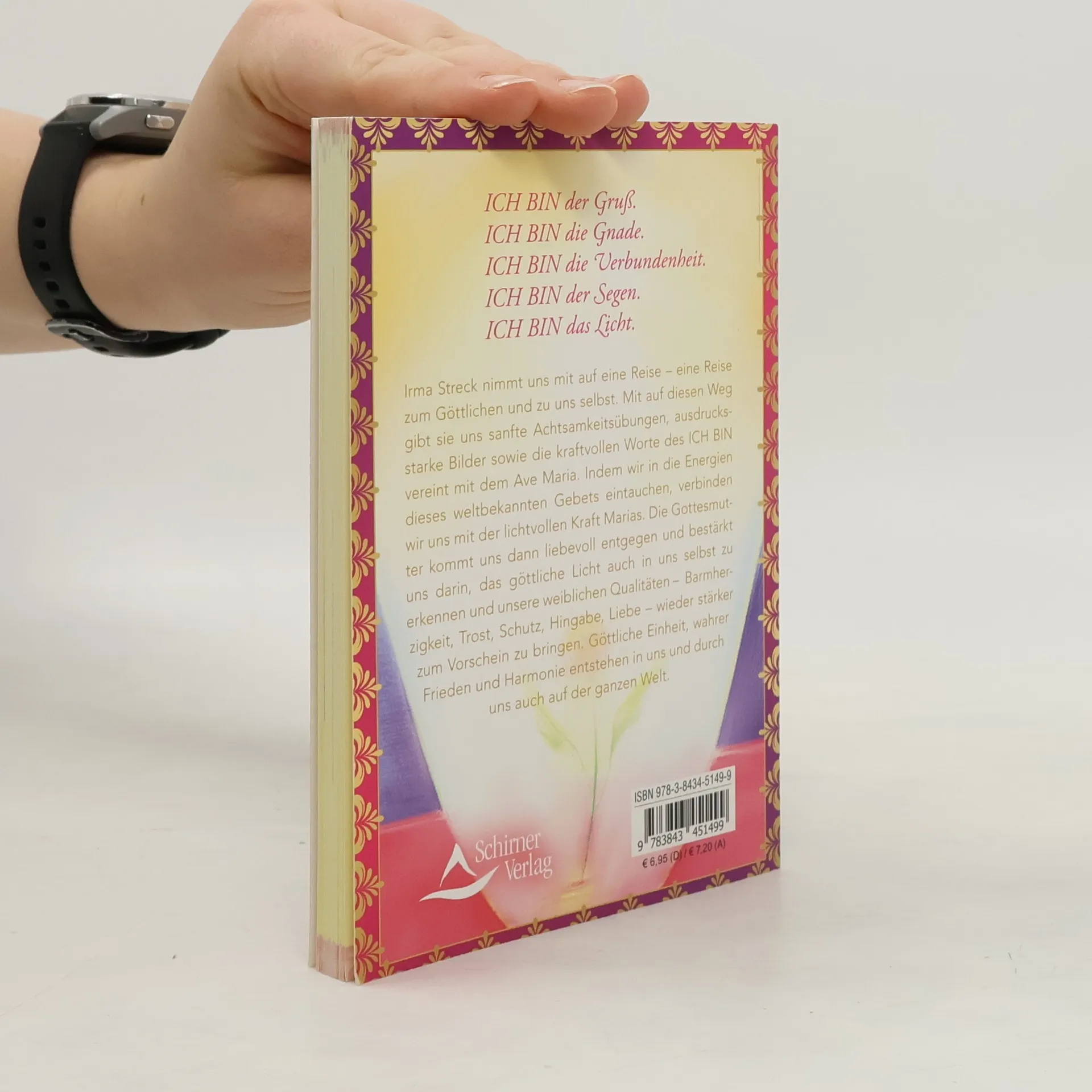 ICH BIN der Gruß. ICH BIN die Gnade. ICH BIN die Verbundenheit. ICH BIN der Segen. ICH BIN das Licht. Irma Streck nimmt uns mit auf eine Reise – eine Reise zum Göttlichen und zu uns selbst. Mit auf diesen Weg gibt sie uns sanfte Achtsamkeitsübungen, ausdrucksstarke Bilder sowie die kraftvollen Worte des ICH BIN vereint mit dem Ave Maria. Indem wir in die Energien dieses weltbekannten Gebets eintauchen, verbinden wir uns mit der lichtvollen Kraft Marias. Die Gottesmutter kommt uns dann liebevoll entgegen und bestärkt uns darin, das göttliche Licht auch in uns selbst zu erkennen und unsere weiblichen Qualitäten – Barmherzigkeit, Trost, Schutz, Hingabe, Liebe – wieder stärker zum Vorschein zu bringen. Göttliche Einheit, wahrer Frieden und Harmonie entstehen in uns und durch uns auch auf der ganzen Welt. Irma Streck ist spirituelle Künstlerin. Ihre besondere Art zu zeichnen nennt sie »LICHTmalerei«. Heute arbeitet sie freischaffend als Künstlerin, Maltherapeutin, Dozentin sowie Autorin. In Kursen und Seminaren begleitet sie Teilnehmer dabei, ihre Kreativität zu entdecken und ihre Bewusstheit zu entfalten.