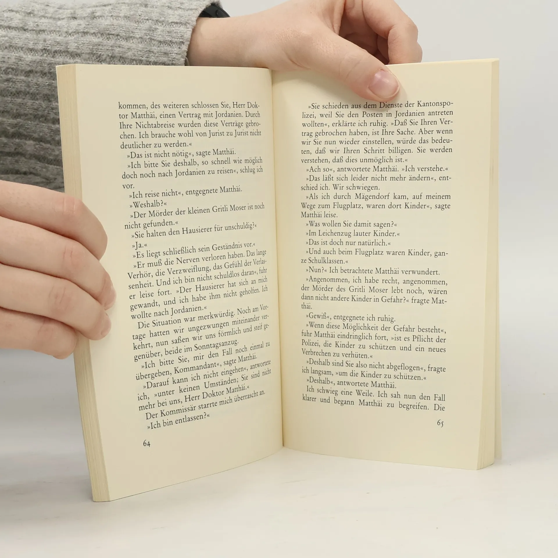 Es geschah am hellichten Tag ... Eigentlich sollte sich Kommissar Matthai, der auf der Höhe seiner Karriere angelangt ist, zum Flug nach Jordanien fertigmachen, um dort ein ehrenvolles Amt zu übernehmen. Da erreicht ihn ein Anruf aus Mägendorf, einem kleinen Ort bei Zürich. Ein ihm unbekannter Hausierer teilt ihm mit, er habe im Wald die Leiche eines grausam verstümmelten Mädchens gefunden. Obwohl Matthais Abflug kurz bevor steht, fährt er nach Mägendorf und verspricht den Eltern des Kindes nicht zu rasten, bis er den Täter entlarvt hat.