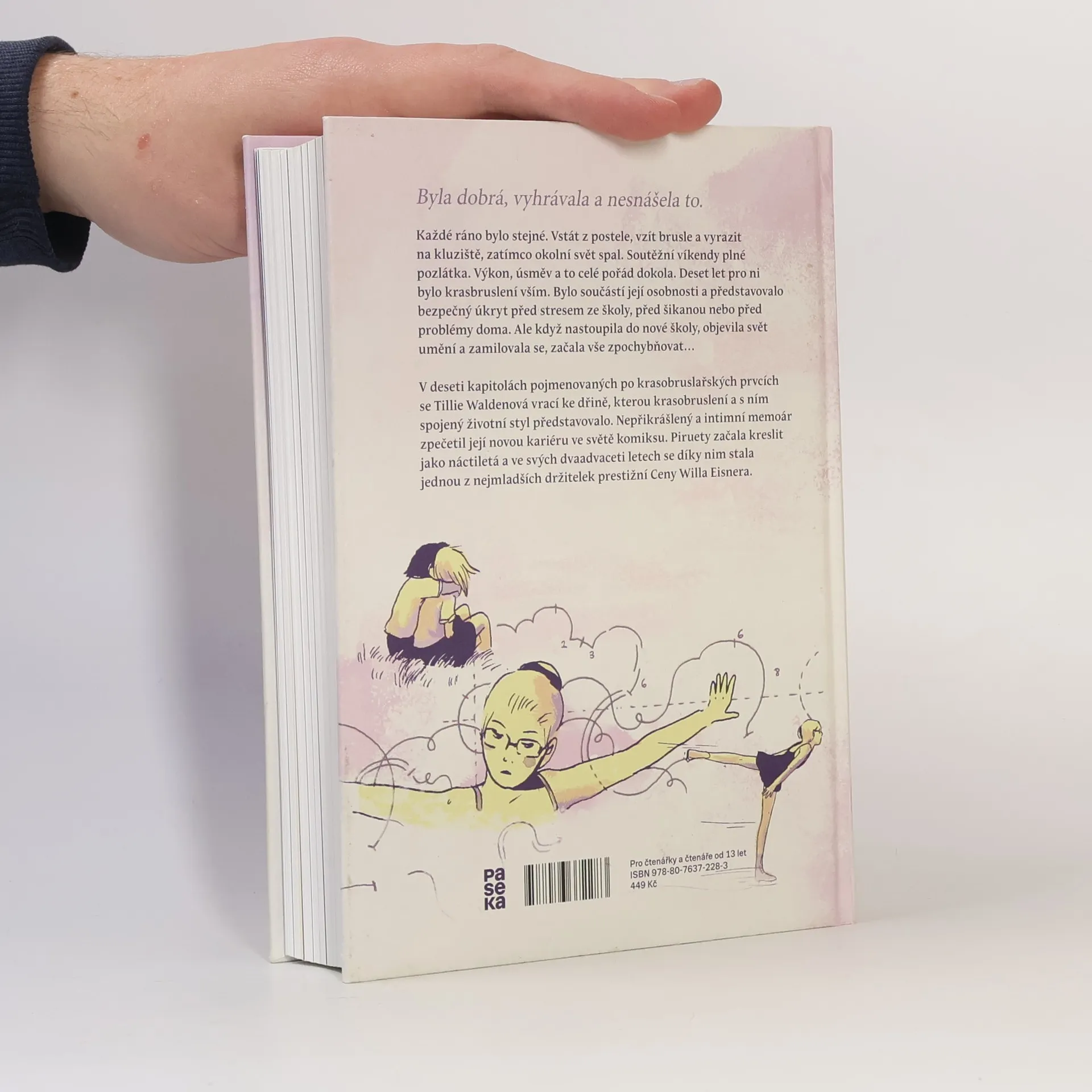 Byla dobrá, vyhrávala a nesnášela to. Každé ráno bylo stejné. Vstát z postele, vzít brusle a vyrazit na kluziště, zatímco okolní svět spal. Soutěžní víkendy plné pozlátka. Výkon, úsměv a to celé pořád dokola. Deset let pro ni bylo krasobruslení vším. Bylo součástí její osobnosti a představovalo bezpečný úkryt před stresem ze školy, před šikanou nebo před problémy doma. Ale když nastoupila do nové školy, objevila svět umění a zamilovala se, začala vše zpochybňovat… V deseti kapitolách pojmenovaných po krasobruslařských prvcích se Tillie Waldenová vrací ke dřině, kterou krasobruslení a s ním spojený životní styl představovalo. Nepřikrášlený a intimní memoár o dospívání, osamělosti a objevování vlastní sexuality zpečetil její novou kariéru ve světě komiksu. Piruety začala kreslit jako náctiletá a ve svých dvaadvaceti letech se díky nim stala jednou z nejmladších držitelek prestižní Ceny Willa Eisnera.