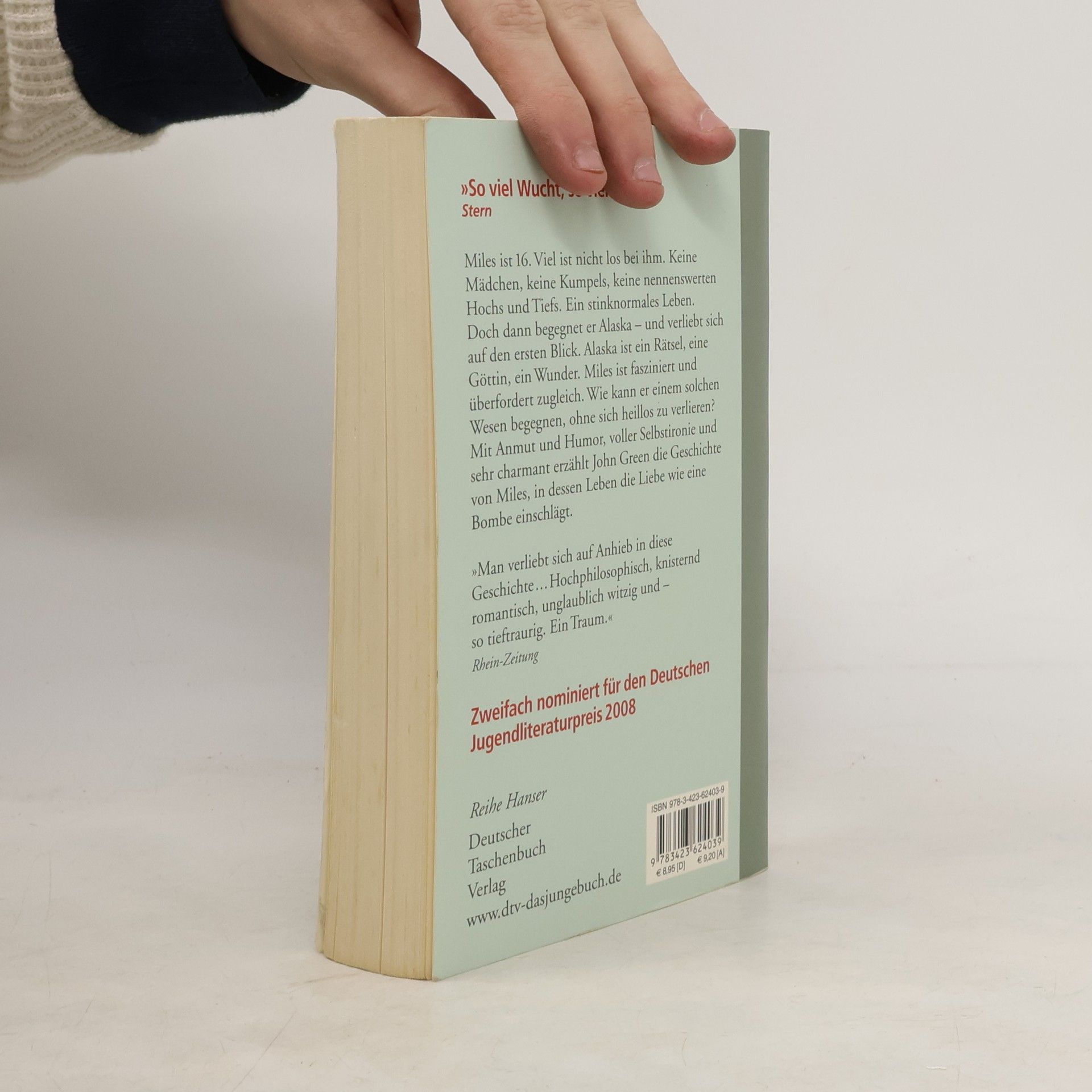 Zweifach nominiert für den Deutschen Jugendliteraturpreis 2008. Miles hat die Schule gewechselt. Auf dem Internat verknallt er sich in die schöne Alaska. Sie ist das Zentrum ihres Sonnensystems, der magische Anziehungspunkt des Internats. Wer um sie kreist, ist glücklich und verletzlich gleichermaßen, euphorisch und immer nah am Schulverweis. Alaska mag Lyrik, nächtliche Diskussionen über philosophische Absurditäten, heimliche Glimmstängel im Wald und die echte wahre Liebe. Miles ist fasziniert und überfordert zugleich. Dass hinter dieser verrückten, aufgekratzten Schale etwas Weiches und Verletzliches steckt, ist offensichtlich. Wer ist Alaska wirklich? Mit Anmut und Humor, voller Selbstironie und sehr charmant erzählt Green die zu Tränen rührende Geschichte von Miles, in dessen Leben die Liebe wie eine Bombe einschlägt.