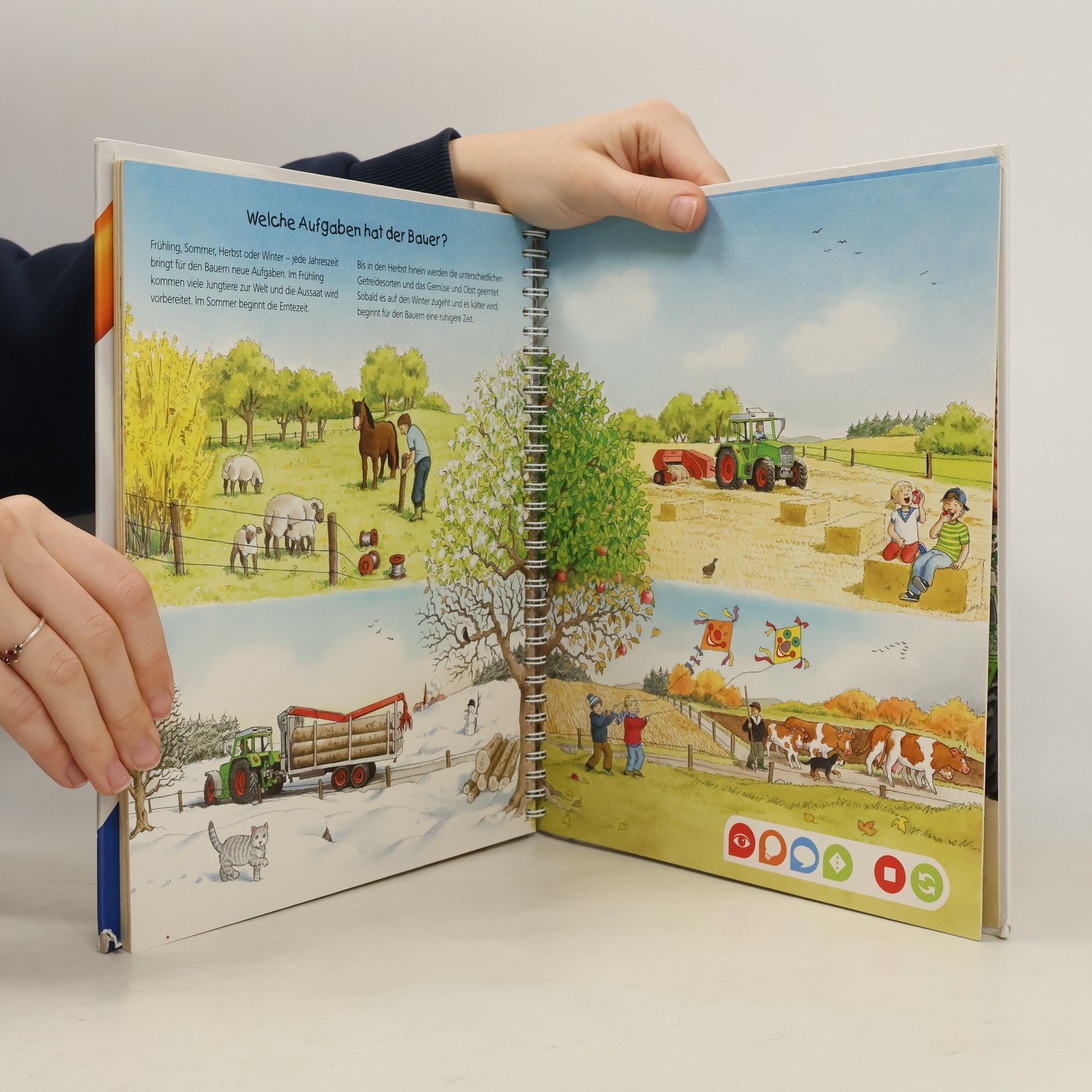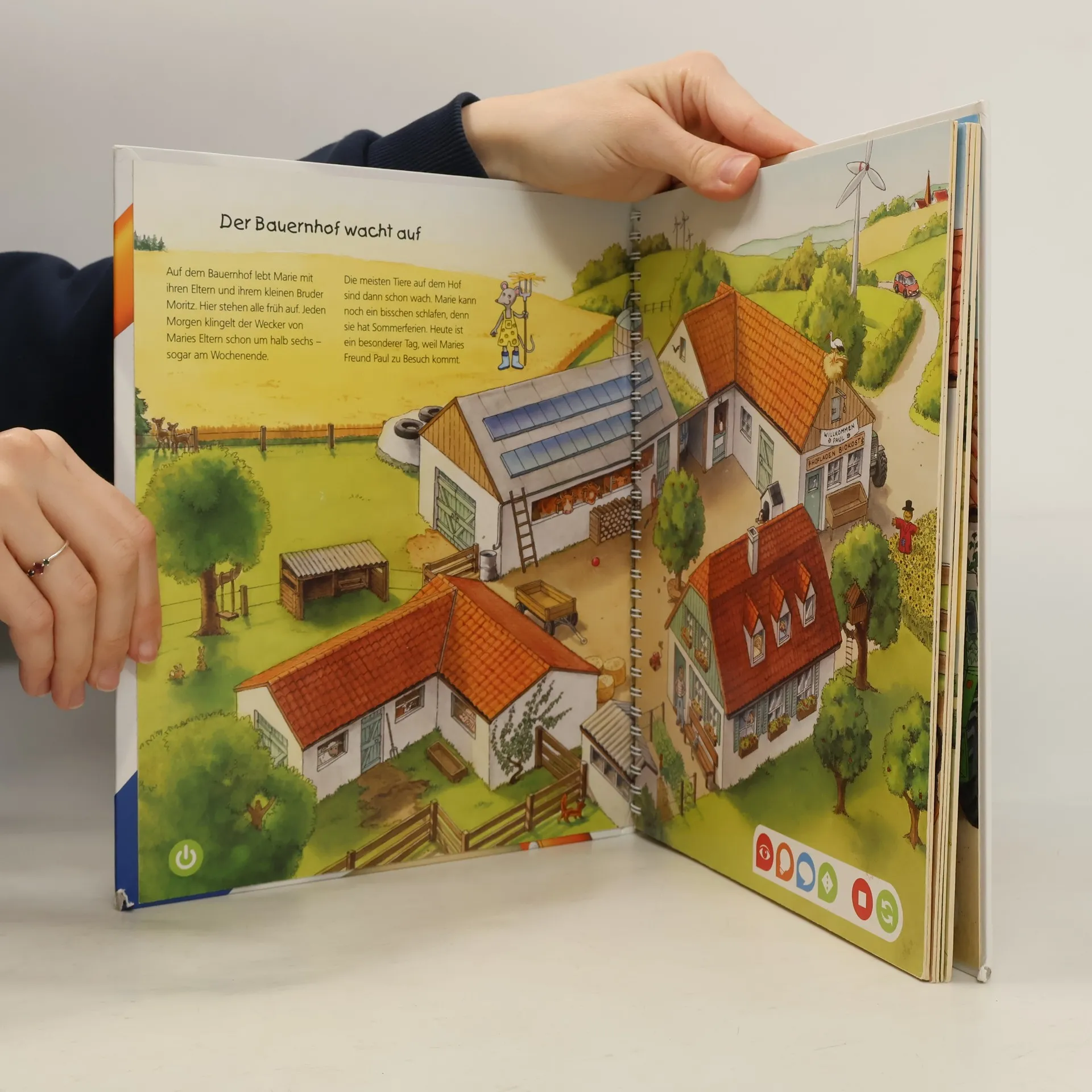 Willkommen auf dem Bauernhof! Hier kommen Tierliebhaber und Technikfans gleichermaßen auf ihre Kosten. Lebensechte Geräusche und faszinierende Bilder vermitteln spielerisch Grundwissen über Tiere, Pflanzen und Maschinen auf dem Bauernhof. Suchspiele, Kinderlieder und eine kunterbunte Wimmelseite laden zum Entdecken und Ausprobieren ein. tiptoi-Stift nicht enthalten.