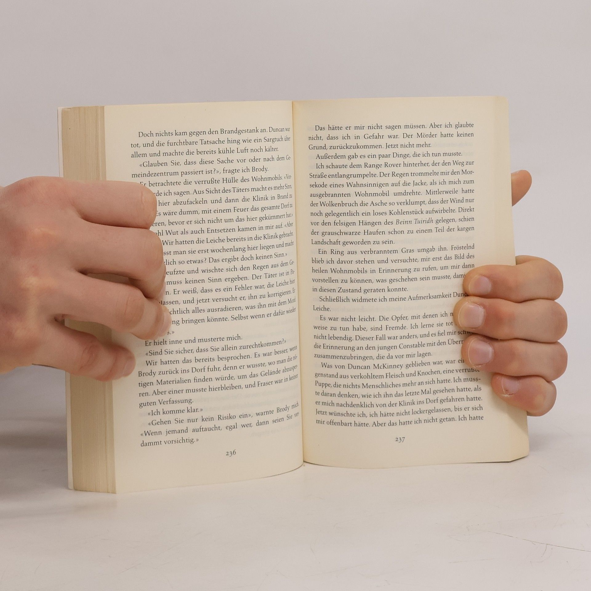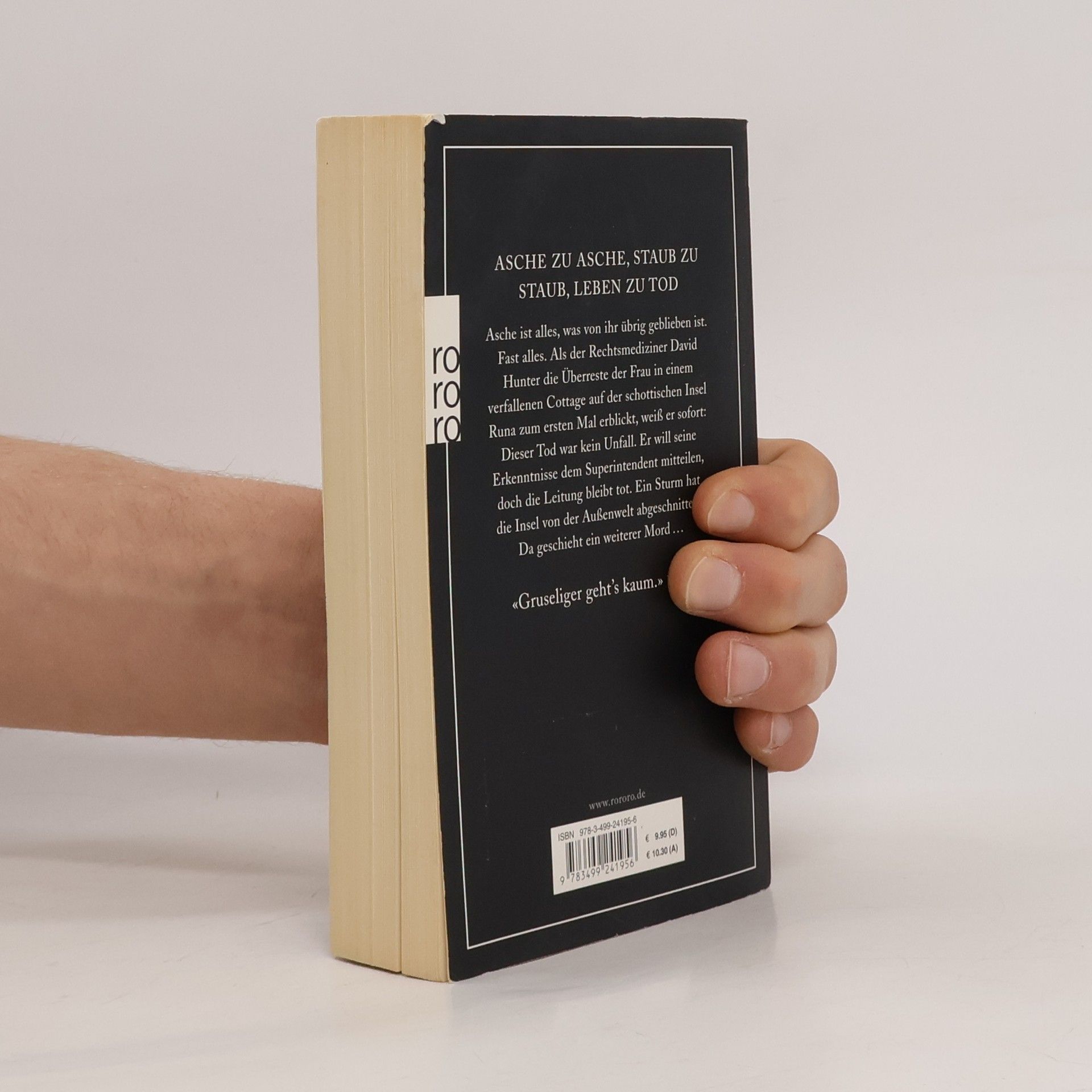 Asche zu Asche, Staub zu Staub, Leben zu Tod. Asche ist alles, was von ihr übrig geblieben ist. Fast alles. Als der Rechtsmediziner David Hunter die Überreste der Frau in einem verfallenen Cottage auf der schottischen Insel Runa zum ersten Mal erblickt, weiß er sofort: Dieser Tod war kein Unfall. Er will seine Erkenntnisse dem Superintendenten mitteilen, doch die Leitung bleibt tot. Ein Sturm hat die Insel von der Außenwelt abgeschnitten. Da geschieht ein weiterer Mord. «Gruseliger geht’s kaum.» (Bild)