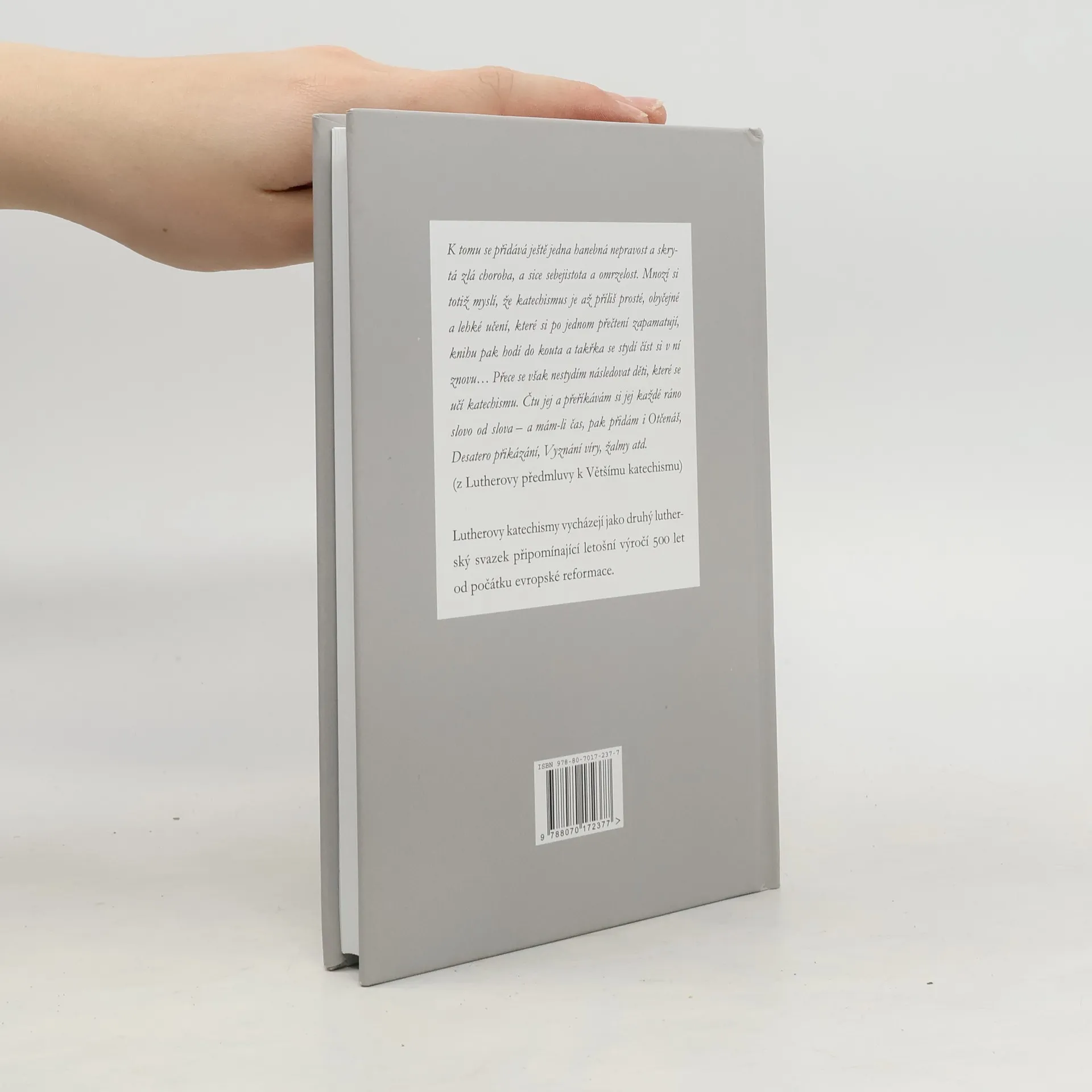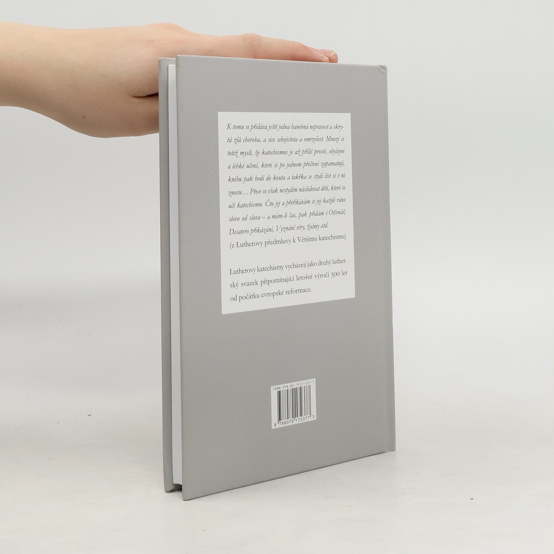 Základní Lutherovy katechetické texty. Vychází jako druhý lutherský svazek připomínající letošní výročí 500 let od počátku evropské reformace. K tomu se přidává ještě jedna hanebná nepravost a skrytá zlá choroba, a sice sebejistota a omrzelost. Mnozí si totiž myslí, že katechismus je až příliš prosté, obyčejné a lehké učení, které si po jednom přečtení zapamatují, knihu pak hodí do kouta a takřka se stydí číst si v ní znovu… Přece se však nestydím následovat děti, které se učí katechismu. Čtu jej a přeříkávám si jej každé ráno slovo od slova – a mám-li čas, pak přidám i Otčenáš, Desatero přikázání, Vyznání víry, žalmy atd. (z Lutherovy předmluvy k Většímu katechismu)