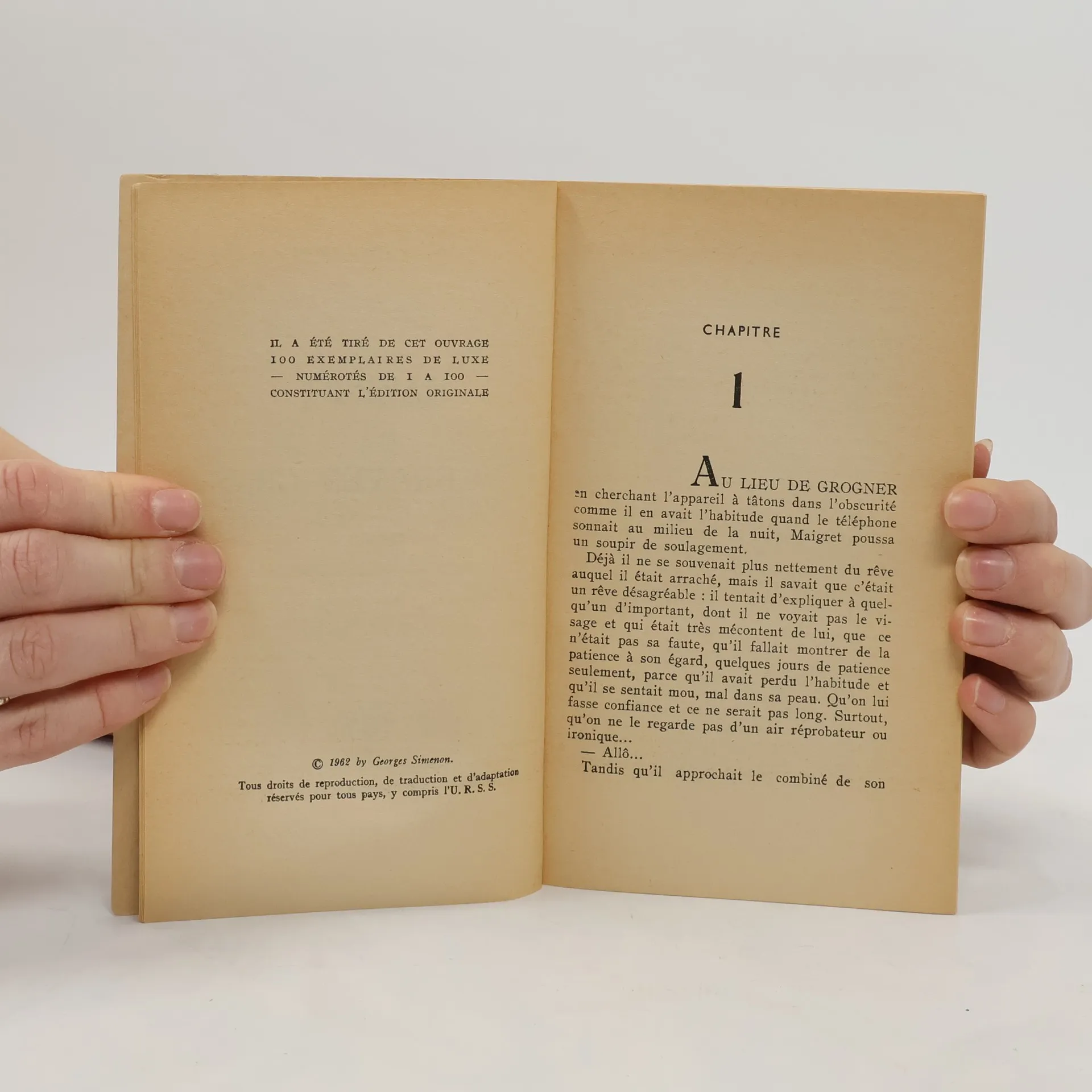 Au lieu de grogner en cherchant l’appareil à tâtons dans l’obscurité comme il en avait l’habitude quand le téléphone sonnait au milieu de la nuit, Maigret poussa un soupir de soulagement.Déjà il ne se souvenait plus nettement du rêve auquel il était arraché, mais il savait que c’était un rêve désagréable : il tentait d’expliquer à quelqu’un d’important, dont il ne voyait pas le visage et qui était très mécontent de lui, que ce n’était pas sa faute, qu’il fallait montrer de la patience à son égard, quelques jours de patience seulement, parce qu’il avait perdu l’habitude et qu’il se sentait mou, mal dans sa peau. Qu’on lui fasse confiance et ce ne serait pas long. Surtout, qu’on ne le regarde pas d’un air réprobateur ou ironique...