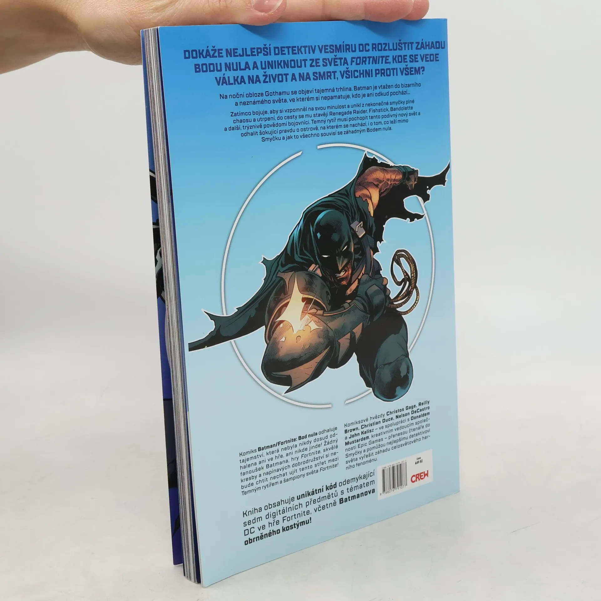 Dokáže nejlepší detektiv vesmíru DC rozluštit záhadu Bodu nula a uniknout ze světa Fortnite, kde se vede válka na život a na smrt, všichni proti všem? Na noční obloze Gothamu se objeví tajemná trhlina. Batman je vtažen do bizarního a neznámého světa, ve kterém si nepamatuje, kdo je ani odkud pochází... Zatímco bojuje, aby si vzpomněl na svou minulost a unikl z nekonečné smyčky plné chaosu a utrpení, do cesty se mu stavějí Renegade Raider, Fishstick, Bandolette a další, trýznivě povědomí bojovníci. Temný rytíř musí pochopit tento podivný nový svět a odhalit šokující pravdu o ostrově, na kterém se nachází, i o tom, co leží mimo Smyčku a jak to všechno souvisí se záhadným Bodem nula. Komiks Batman/Fortnite: Bod nula odhaluje tajemství, která nebyla nikdy dosud odhalena ani ve hře, ani nikde jinde! Žádný fanoušek Batmana, hry Fortnite, skvělé kresby a napínavých dobrodružství si nebude chtít nechat ujít tento střet mezi Temným rytířem a šampiony světa Fortnite! Batman bude muset zachránit nejen sebe, ale také další povědomé obličeje ze světa DC... a možná i celý mnohovesmír! Kniha obsahuje unikátní kód odemykající sedm digitálních předmětů s tématem DC ve hře Fortnite, včetně Batmanova obrněného kostýmu!