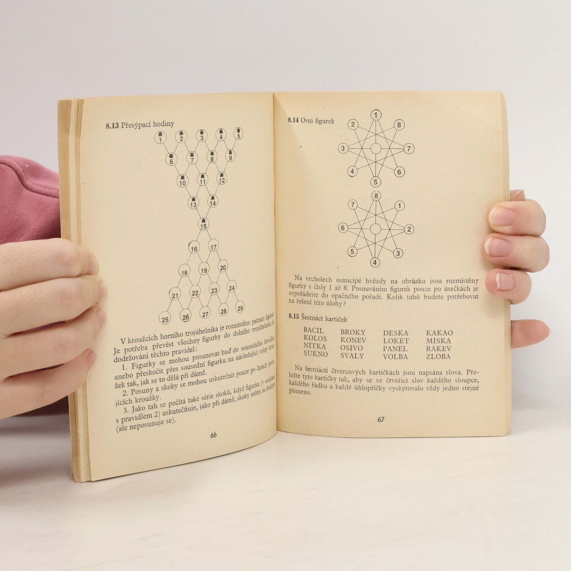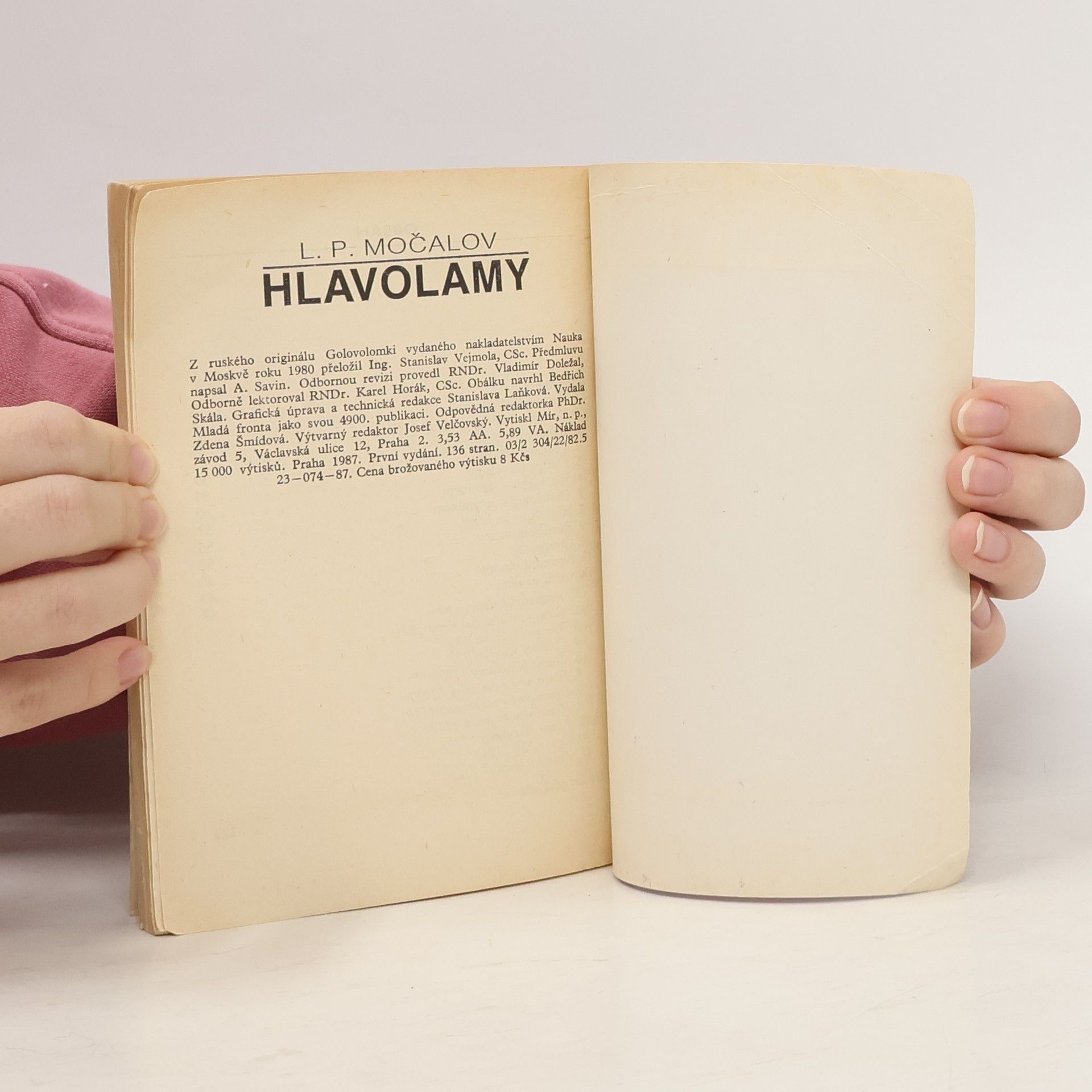 V této knížce čtenáře očekávají setkání nejenom s dobře známými druhy hlavolamů a zábavných úloh: rébusy, číselnými hlavolamy, hlavolamy s dominem, ale i s novými typy hlavolamů: čtvercovkami, abecedními bludišti, „domino-pasiánsy“ , atd. Z ruského originálu Golovolomki vydaného nakladatelstvím Nauka v Moskvě roku 1980 přeložil a doslov napsal Ing. Stanislav Vejmola, CSc. Předmluvu napsal A. Savin. Odbornou revizi provedl RNDr. Vladimír Doležal. Odborně lektoroval RNDr. Karel Horák, CSc. Ilustrace Stanislava Laňková, Bedřich Skála, Marie Suchardová, Stanislav Vejmola. První vydání.