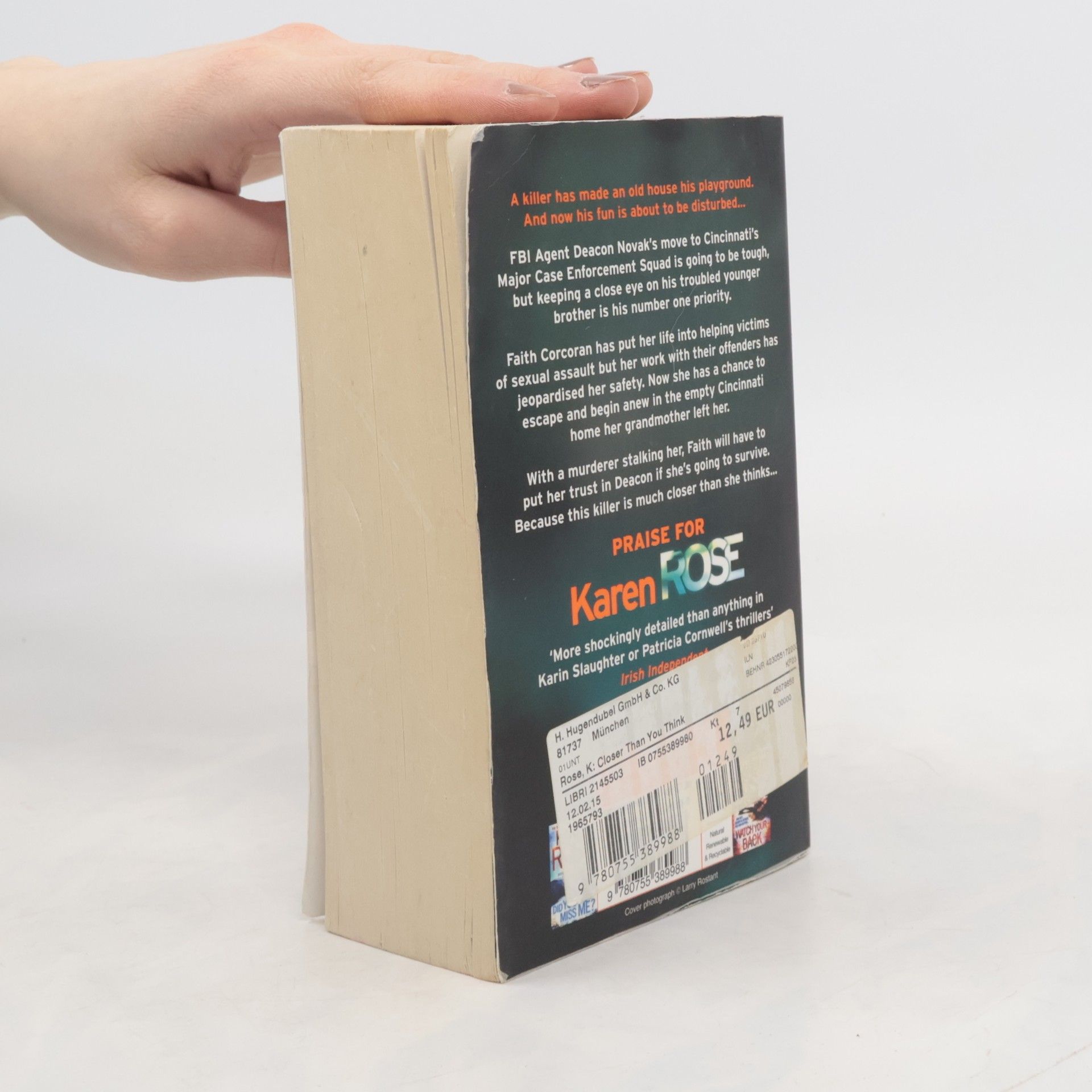 Deacon Novak has returned home. The FBI Agent knows moving to Cincinnati's Major Crime Enforcement Squad will be tough, but the greater challenge will be saving his brother from becoming someone Deacon needs to arrest. Faith Corcoran has escaped her old life. Providing therapy with victims of sexual assault was rewarding, but her work with the offenders has jeopardized her safety. This is her chance to begin anew in the empty old house her grandmother left her. But Faith doesn't know that a killer has made the house his playground. And now she's about to disturb his fun. With a murderer stalking her, Faith will have to put her trust in Deacon if she's going to survive. Because this killer is closer than she thinks.... The first in a brand new series and Karen Rose at her tense, tantalising and thrilling best.