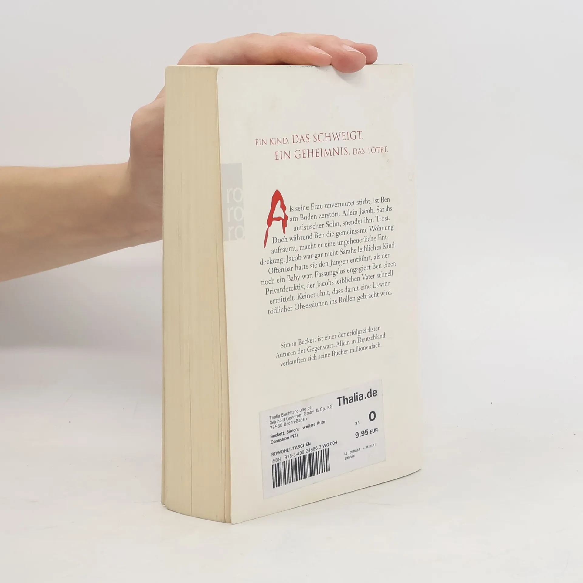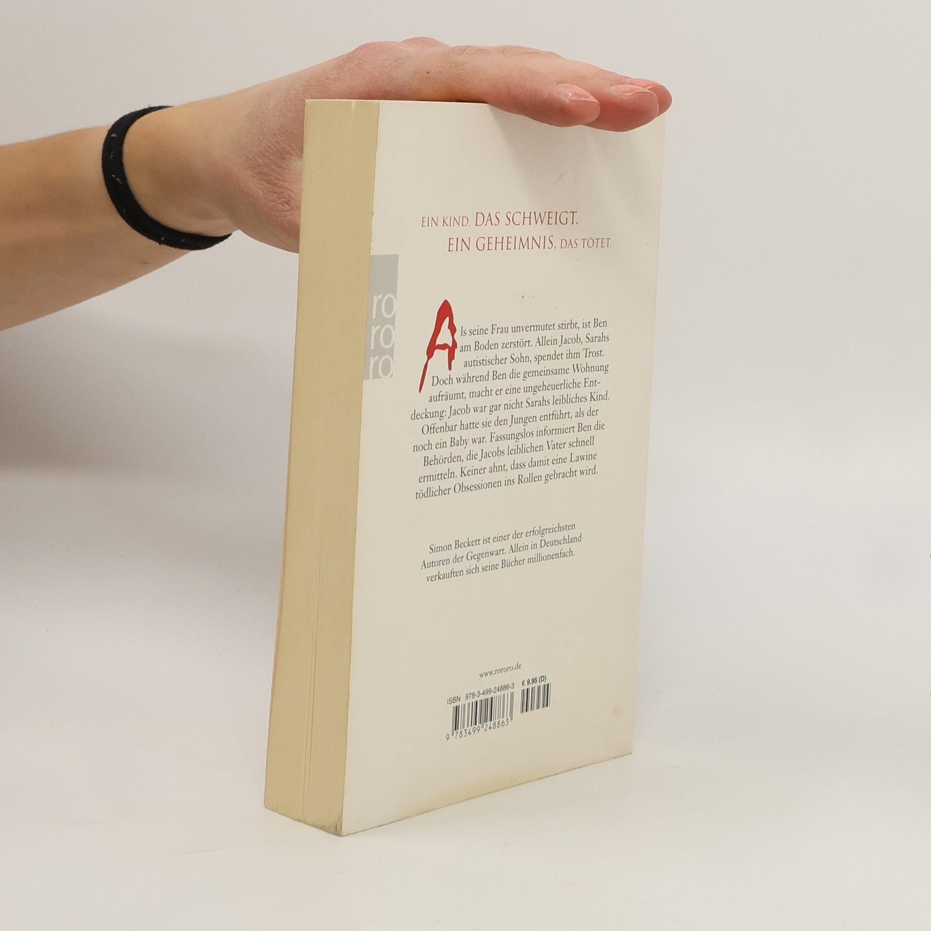 Ein Kind, das schweigt. Ein Geheimnis, das tötet.Als seine Frau unvermutet stirbt, ist Ben am Boden zerstört. Allein Jacob, Sarahs autistischer Sohn, spendet ihm Trost. Doch während Ben die gemeinsame Wohnung aufräumt, macht er eine ungeheuerliche Entdeckung: Jacob war gar nicht Sarahs leibliches Kind. Offenbar hatte sie den Jungen entführt, als der noch ein Baby war. Fassungslos engagiert Ben einen Privatdetektiv, der Jacobs leiblichen Vater schnell ermittelt. Keiner ahnt, dass damit eine Lawine tödlicher Obsessionen ins Rollen gebracht wird. Simon Beckett ist einer der erfolgreichsten Autoren der Gegenwart. Allein in Deutschland verkauften sich seine Bücher millionenfach.