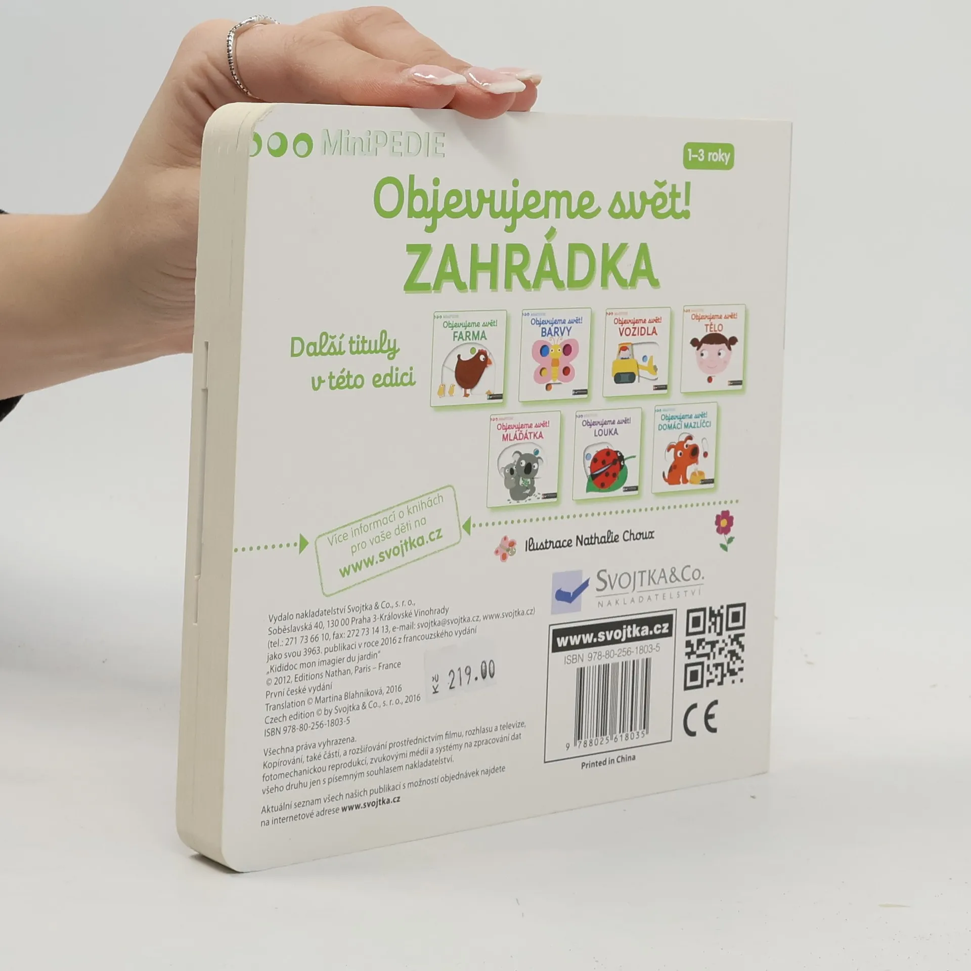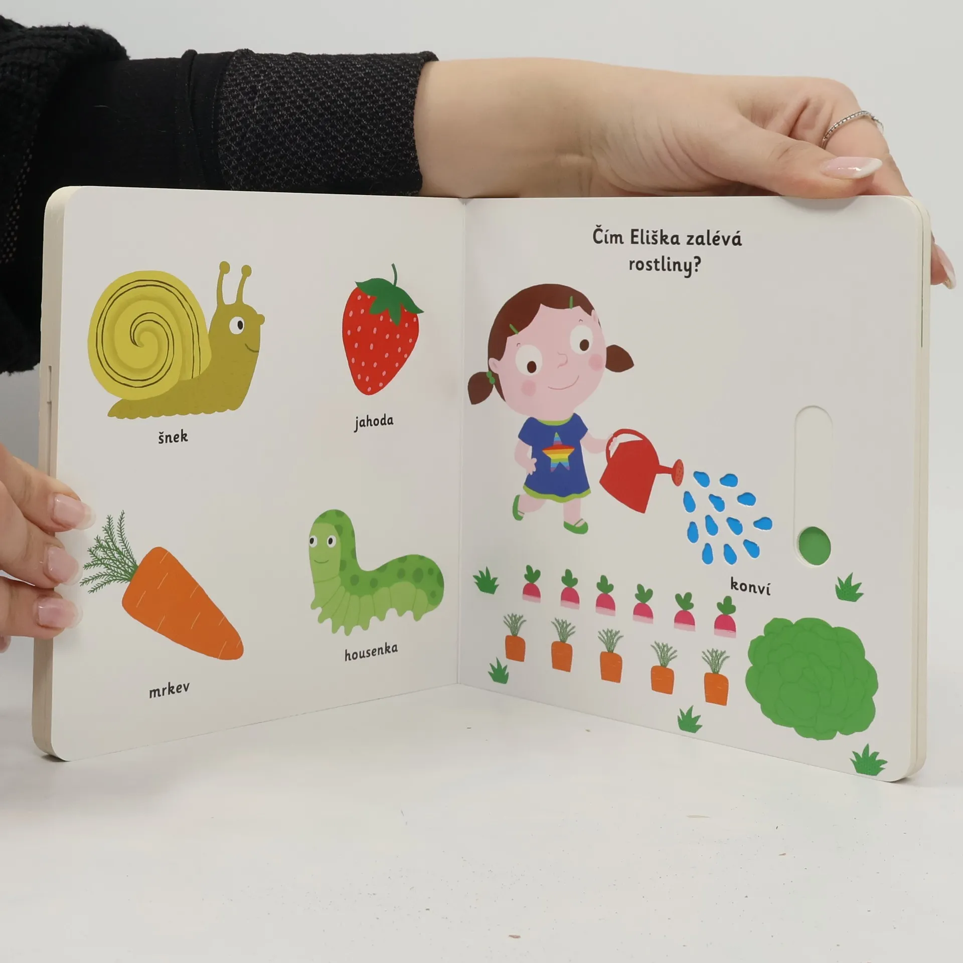 Objevovat, co všechno lze vidět na zahrádce, je s tímto leporelem tak zábavné! Kdo létá z květu na květ? Kdo žije pod zemí? Čím Eliška zalévá rostliny? Co dělá Péťa na houpačce? Stačí jen vložit prstík do správného otvoru, lehce posunout nebo otočit ve směru šipky a hned bude váš malý objevitel nebo objevitelka znát odpovědi. Leporelo je určeno pro nejmenší děti od jednoho roku a má pevné stránky s posuvnými prvky, a tak si naši nejmenší mohou při prohlížení a pojmenovávání procvičit i jemnou motoriku.