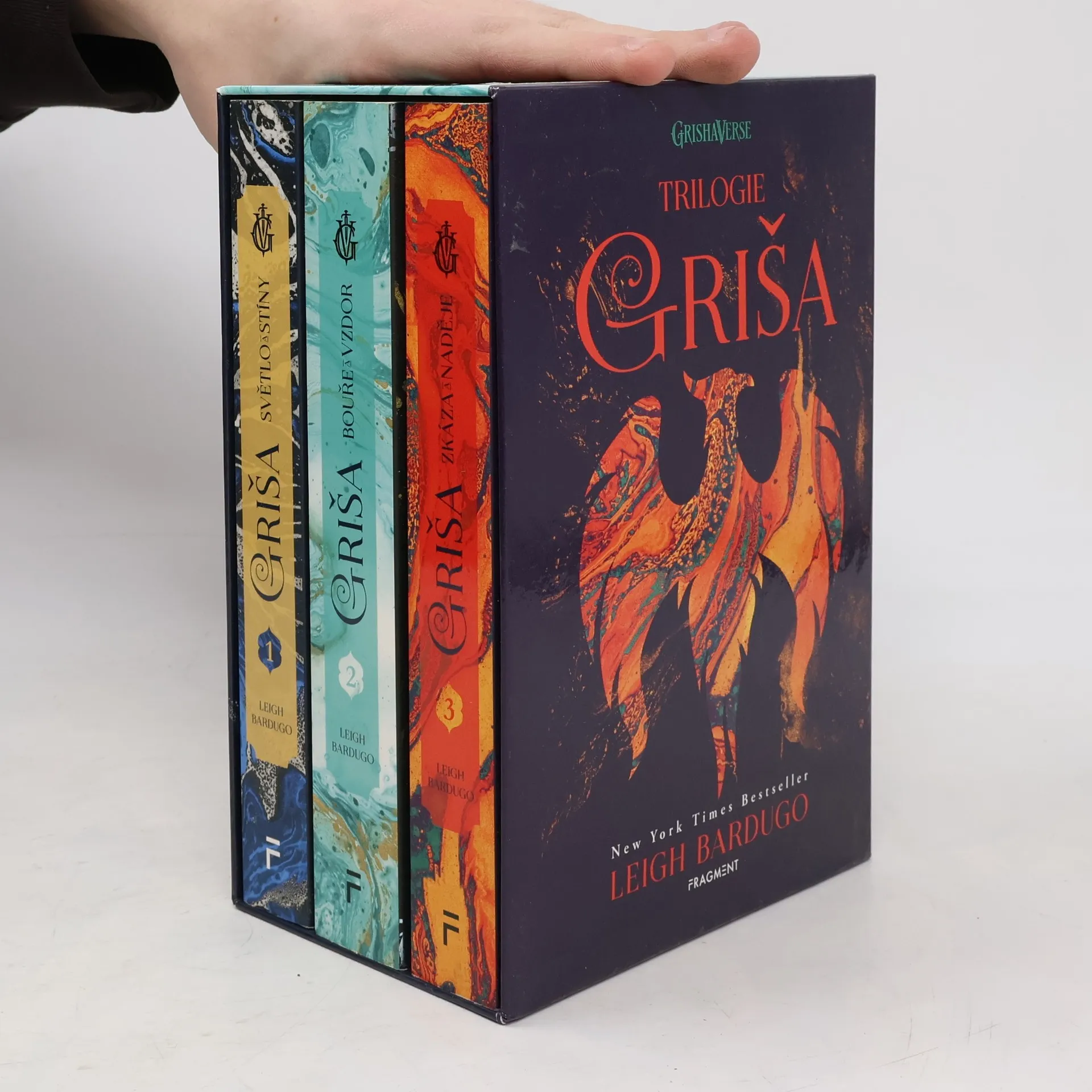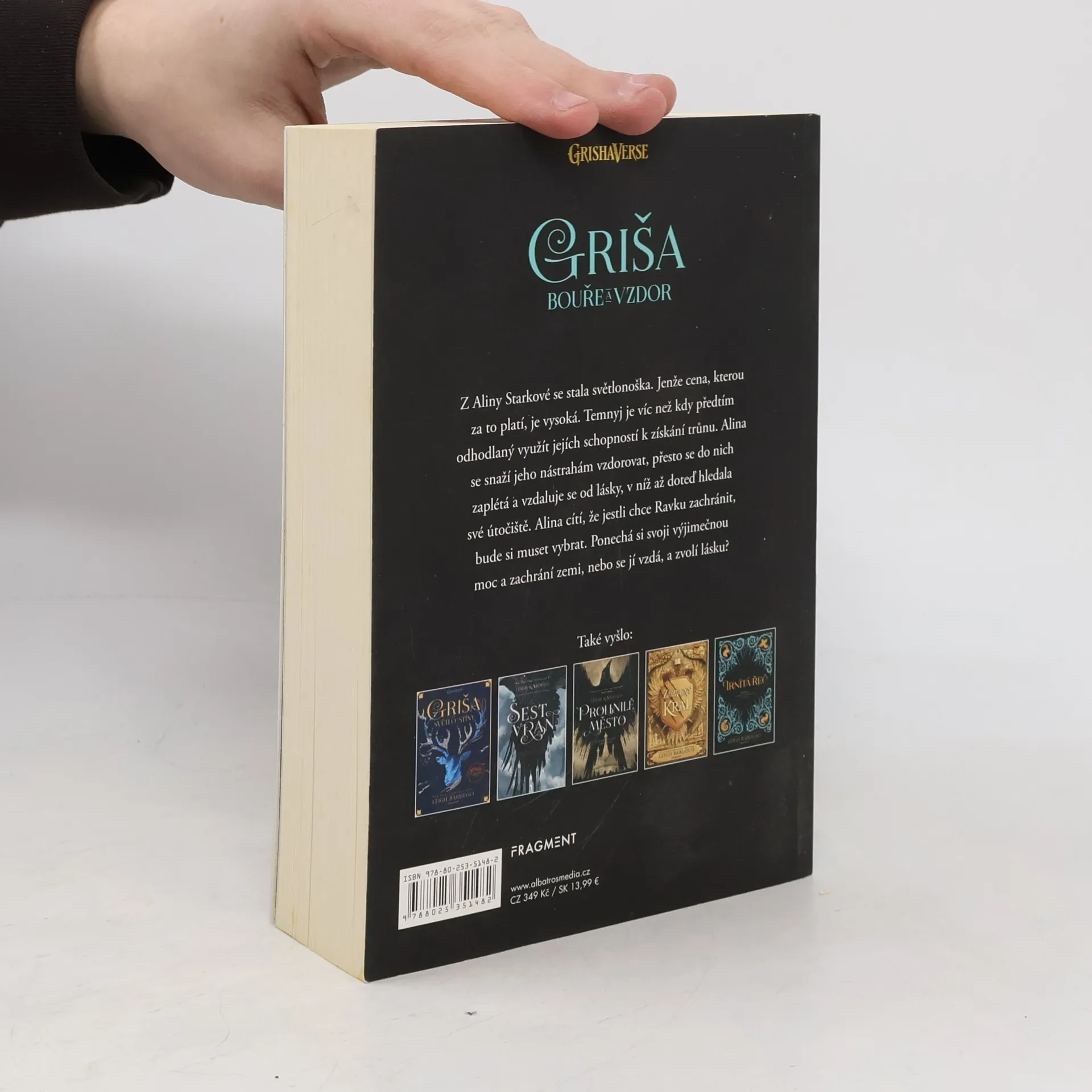 „Kompletní vydání bestsellerové trilogie Griša. Nyní také jako seriál na Netflixu!“ Ravka byla kdysi mocná země, ale nyní je zpustošena válkami, obklopena nepřáteli a všude panuje strach. Když je regiment Aliny Starkové napaden a jejímu nejlepšímu kamarádovi hrozí smrt, odhaluje v sobě Alina skrytou sílu. Sílu, která by mohla být klíčem k osvobození rozvrácené země. Opouští tak svět, který znala, aby se stala grišou – příslušnicí mocného řádu kouzelníků, kterému vládne záhadný Temnyj. Jenže v tomhle světě nic není, jak se zdá…