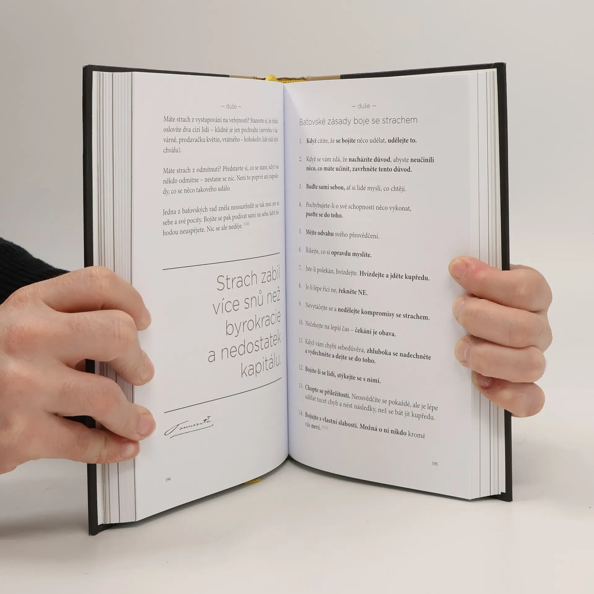 Tomáš Baťa, známý podnikatel, vytvořil světové obuvnické impérium a vyvinul propracovaný systém, který podporoval efektivní podnikání a duševní zdraví svých zaměstnanců. Kniha je rozdělena do čtyř částí, které se zaměřují na tělo, mysl, duši a vztahy. Baťa dlouhodobě podporoval rozvoj svých spolupracovníků, aby se zdokonalovali nejen profesně, ale i osobnostně. Publikace nabízí nový pohled na baťovskou filozofii a praktické rady, jak budovat sebe sama a měnit životní postoje podle jeho principů. Obsahuje také baťovská desatera, jako jsou zásady duševního zdraví a zdravého spánku, doplněné krátkými příběhy, které odhalují podstatu Baťovy osobnosti. Mnoho zásad vychází z jeho osobních zkušeností, které ukazují jeho vize a emoce. Autorka Gabriela Končitíková, která se výzkumu baťovské historie věnuje čtrnáct let, přibližuje, jak propojit pracovní a osobní sféru podle baťovských principů. Baťa věřil, že lidé na vedoucích pozicích by měli mít přehled o osobním životě svých zaměstnanců, aby je mohli inspirovat. Dnes se často diskutuje o rovnováze mezi pracovním a osobním životem, a Baťa měl jasný názor na potřebu vymezeného času na práci i odpočinek.