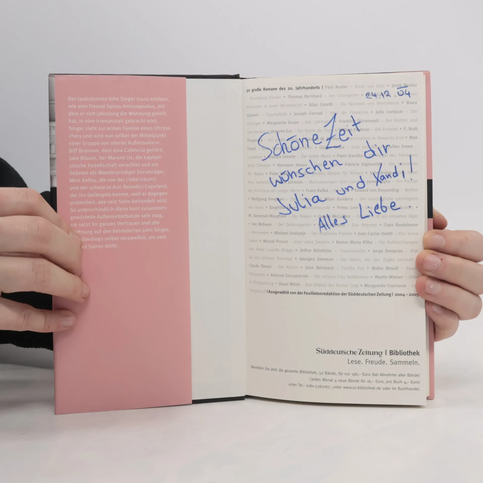 Tief im Süden, in einer kleinen Stadt in Georgia, scheint inmitten der Sommerhitze und des ewigen Surrens der Baumwollspinnereien die Zeit erstarrt – wie die Träume ihrer Bewohner. Das ist Mick, ein Mädchen, das endlich erwachsen werden will und den Kopf voll klassischer Musik hat; doch im Elternhaus dreht sich alles nur um das Geld, das zum Leben nicht reicht. Eines Tages taucht aus dem Nichts Jake Blount auf, der von der Revolution träumt, einer gerechten Welt – aber er trinkt und neigt zu Gewaltausbrüchen. Und da ist Dr. Copeland, ein farbiger Arzt, der ebenfalls träumt – vom Ende der Unterdrückung der Schwarzen – und daran zerbricht. Der Cafébesitzer Biff Brannon schließlich ist nach dem Tod seiner Frau wie von allen Wünschen leergespült. In seinem Café kreuzen sich die Wege dieser Menschen, die unterschiedlicher nicht sein könnten. Halt und Vertrauen gibt all diesen Außenseitern ein Mann namens John Singer, der täglich im Café sein Abendessen einnimmt. Er ist es, der ihnen allen zuhört und ihnen Trost spendet – obwohl er taubstumm ist. Ein unsterbliches Meisterwerk.