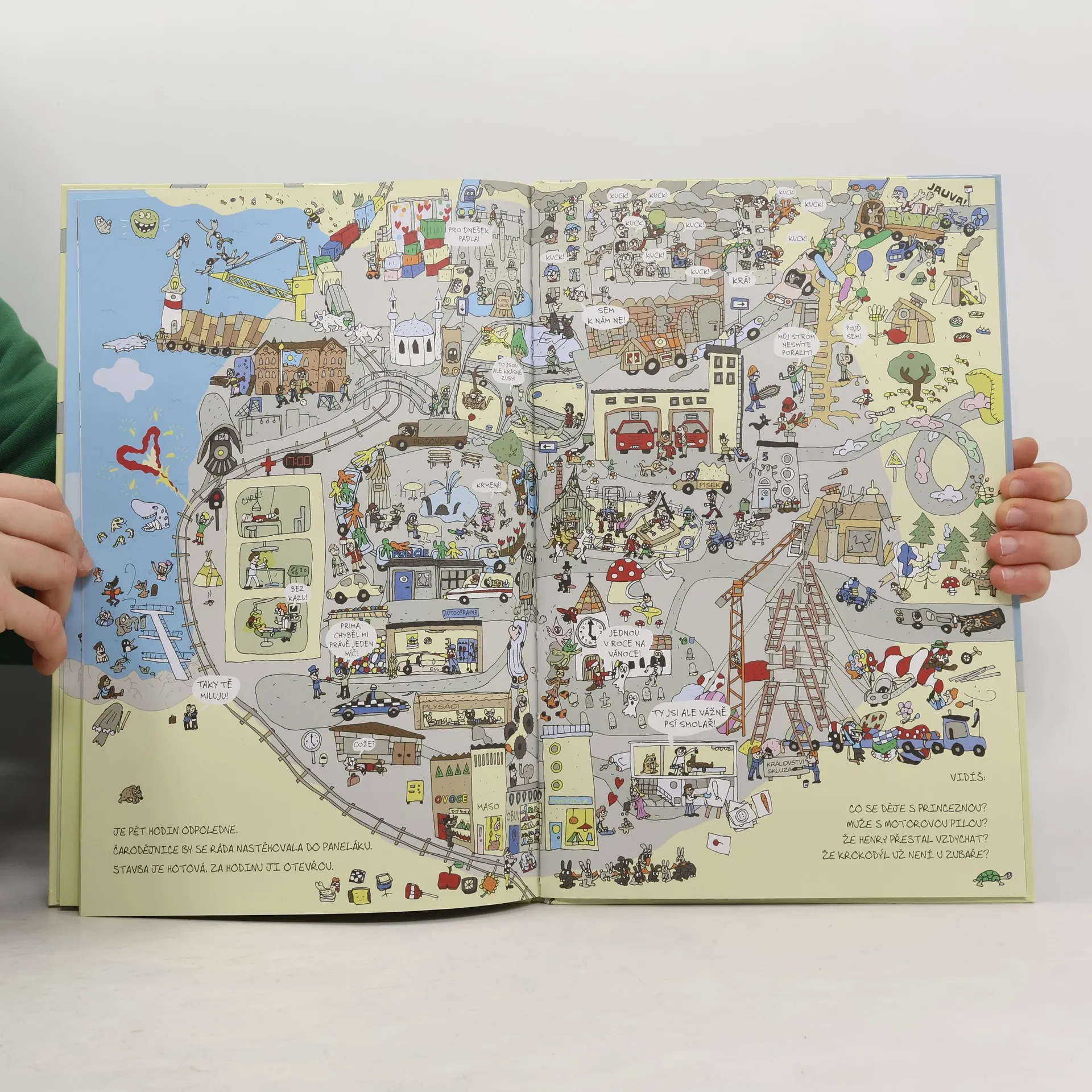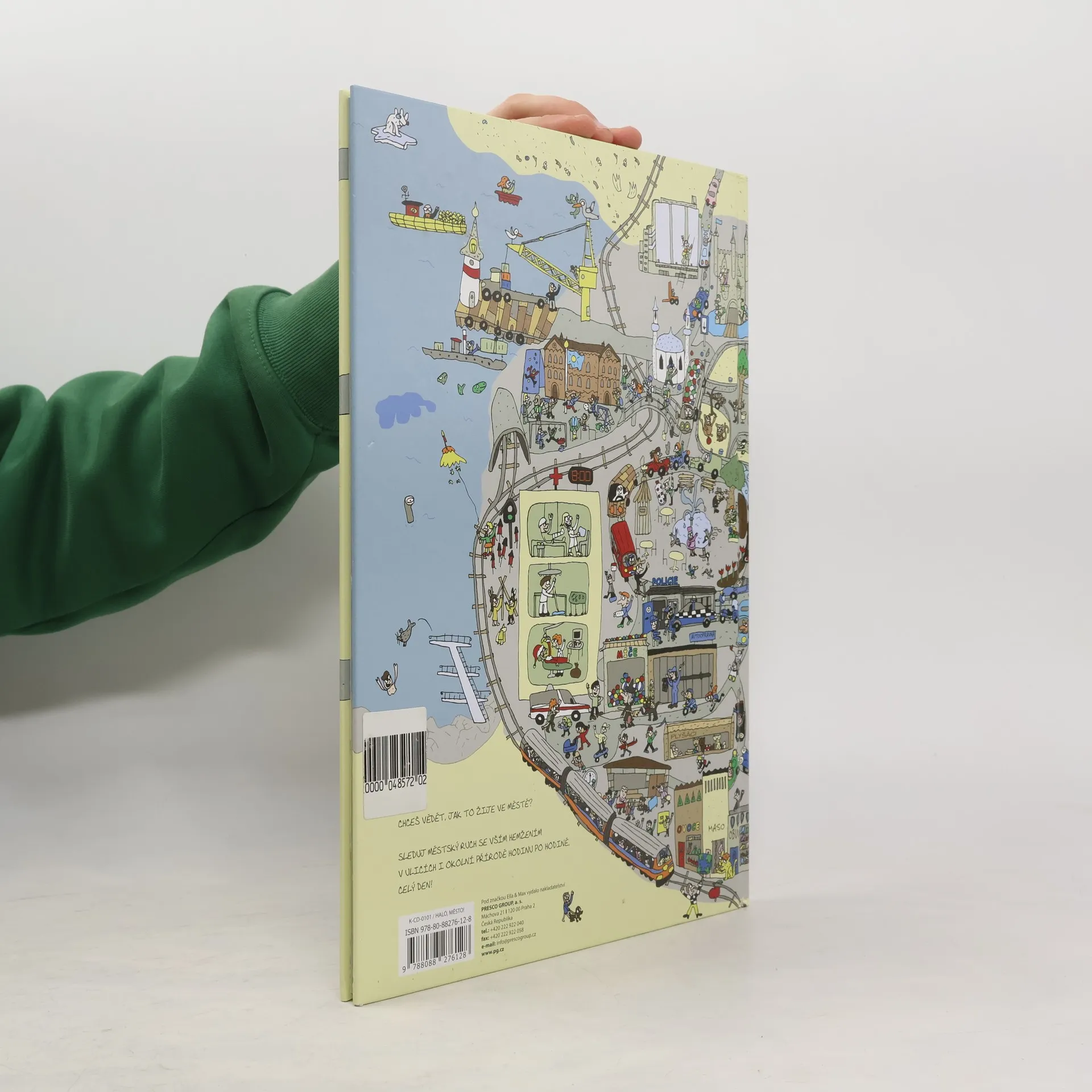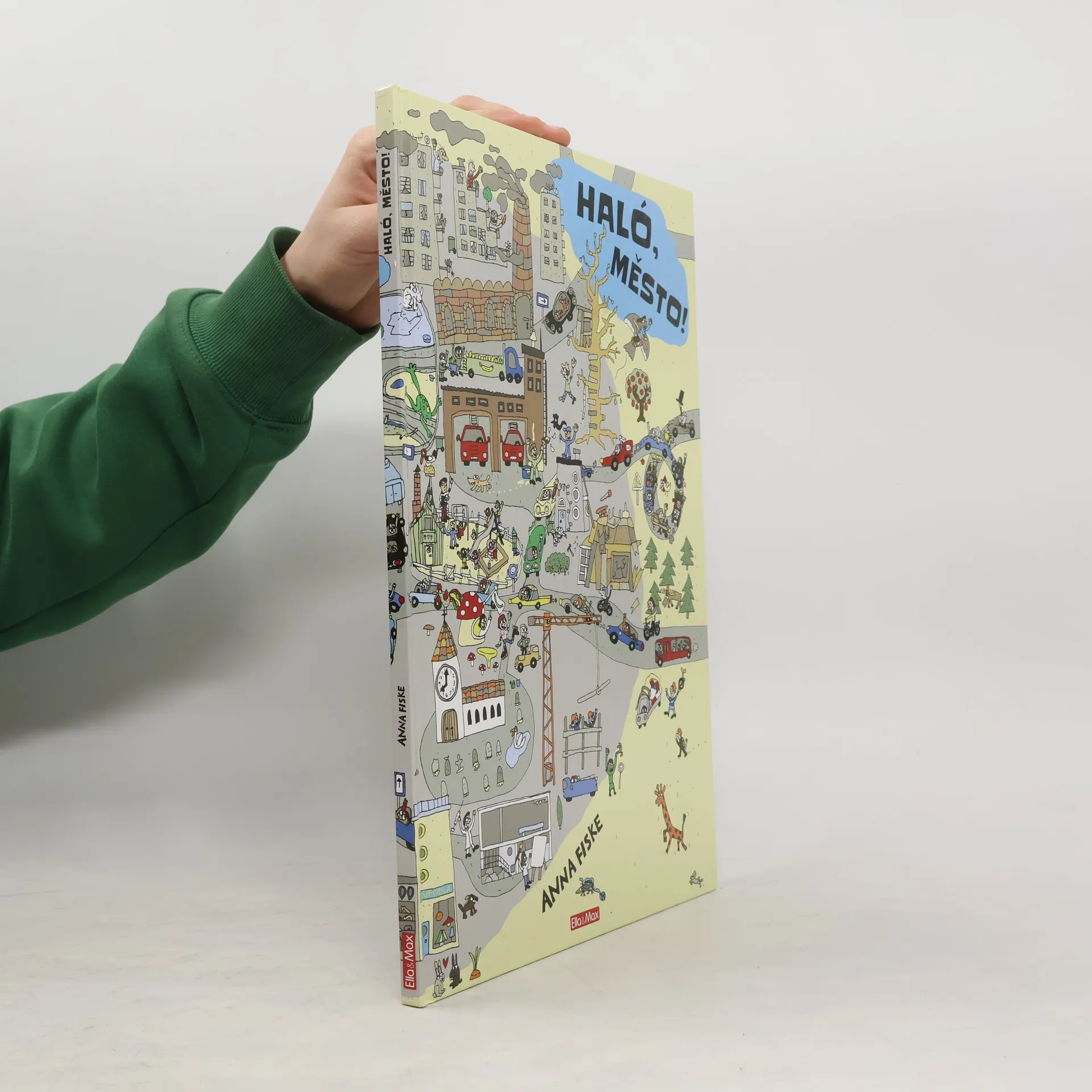Tato velkoformátová, bohatě ilustrovaná kniha je vhodným nástrojem pro uvědomělé rodiče, kteří chtějí své ratolesti kultivovat a rozvíjet, ale občas je také potřebují prostě nějak smysluplně zabavit, aby se mohli věnovat svým záležitostem. Titulem Haló, město provede malé i velké čtenáře šest postaviček, které můžete hledat na každé dvoustraně znovu a znovu – a není to vůbec jednoduché! V záplavě dalších svérázných osob a osůbek, zvířat, rostlin, městských staveb, dopravních prostředků a jiných strojů se totiž snadno ztratí… Sledujte městský ruch se vším hemžením v ulicích i okolní přírodě hodinu po hodině, celý den – zjistíte, že jste neustále překvapováni nově objevenými souvislostmi, momenty a vtipnými detaily, kterých jste si předtím nevšimli. S touhle knihou se rozhodně nudit nebudete. A nejlepší na ní je, že abyste se dozvěděli, o čem pojednává, vůbec nemusíte umět číst! Propracované a přehledné kresby totiž tvoří příběhy samy o sobě – stačí se jen pozorně dívat a nechat představivost a fantazii běžet na plné obrátky. Malí čtenáři tu dostávají příležitost seznámit se se světem knihy, který se jim nenásilně představí jako zdroj informací i zábavy, a ti velcí zase jednou dostanou možnost podívat se na svět očima dítěte.