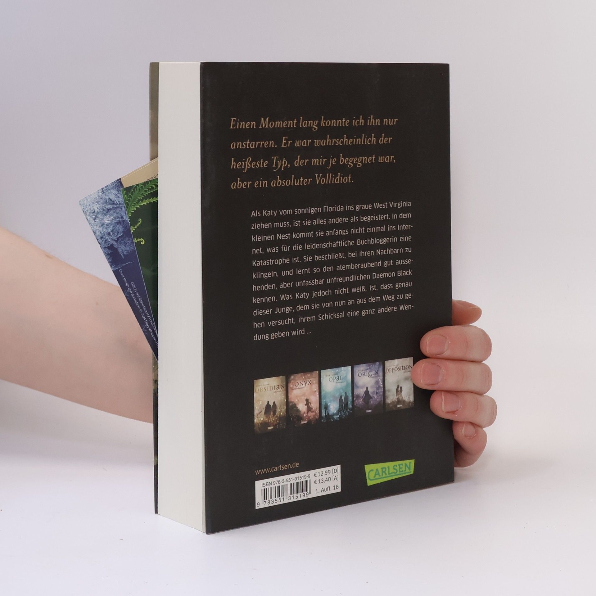 Als Katy vom sonnigen Florida ins graue West Virginia ziehen muss, ist sie alles andere als begeistert. In dem kleinen Nest kommt sie anfangs nicht einmal ins Internet, was für die leidenschaftliche Buchbloggerin eine Katastrophe ist. Sie beschließt, bei ihren Nachbarn zu klingeln, und lernt so den atemberaubend gut aussehenden, aber unfassbar unfreundlichen Daemon Black kennen. Was Katy jedoch nicht weiß, ist, dass genau dieser Junge, dem sie von nun an aus dem Weg zu gehen versucht, ihrem Schicksal eine ganz andere Wendung geben wird … Dies ist der erste Band der Obsidian-Serie von Jennifer L. Armentrout. Alle Bände der unwiderstehlichen Bestsellerserie: Obsidian. SchattendunkelOnyx. SchattenschimmerOpal. SchattenglanzOrigin. SchattenfunkeOpposition. Schattenblitz Alle Bände der dazugehörigen Oblivion-Serie:Oblivion 1: Lichtflüstern (Obsidian aus Daemons Sicht erzählt)Oblivion 2: Lichtflimmern (Onyx aus Daemons Sicht erzählt)Oblivion 3: Lichtflackern (Opal aus Daemons Sicht erzählt) Alle bisher erschienenen Bände der Spin-off-Serie »Revenge«:Revenge. SternensturmRebellion. SchattensturmRedemption. Nachtsturm