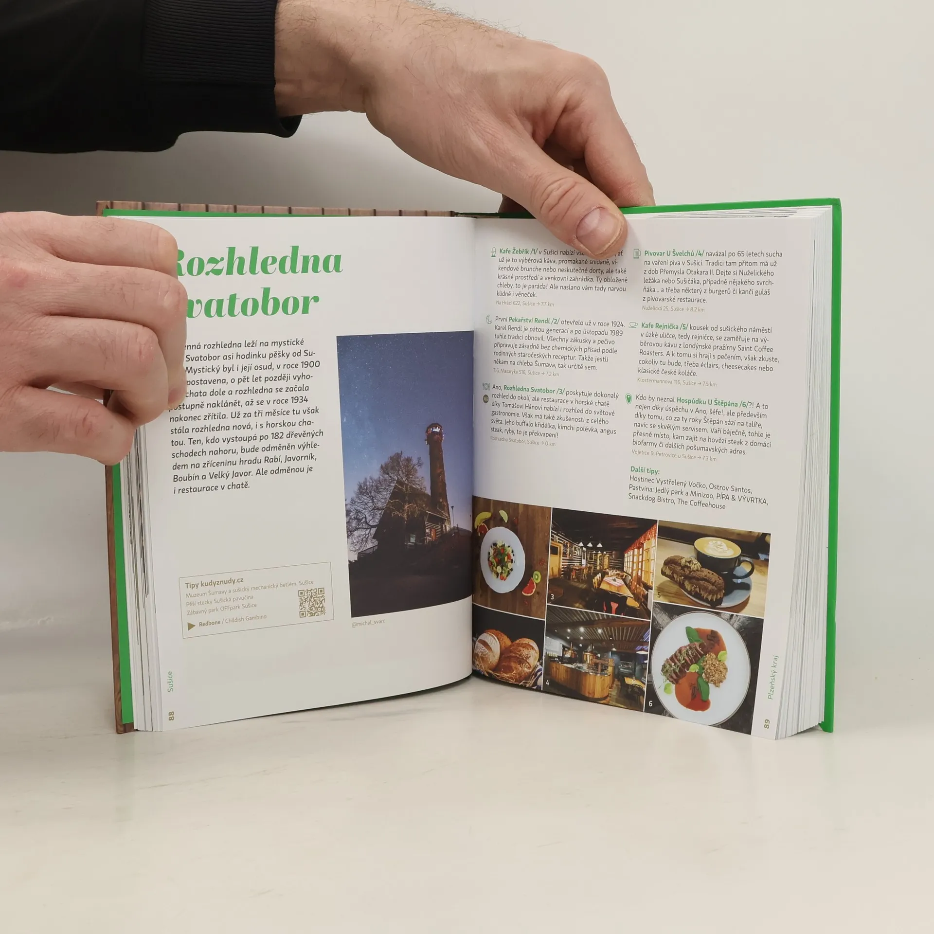 Autor v knize 555 – Výlety s Gastromapou Lukáše Hejlíka vyráží na 100 nádherných míst po celé České republice a mapuje v jejich okolí dostupné podniky, kam můžete zajít na fajn jídlo, kafe, sladký, pivo nebo třeba večerní drink. A co všechno kromě 555 gastrotipů pro vás Lukáš vysype ze svého cestovatelského báglu? Každý výlet popíše a vždy ho doprovodí fotografií od respektovaných českých fotografů a cestovatelů. Partner Kudyznudy.cz přihodí další možnosti, kam se v dané lokalitě podívat. Pomocí QR kódu Mapy.cz si budete moct stáhnout celý výlet i Lukášovy tipy do navigace. A mimochodem, každý z výletů bude mít v knize napárovanou skladbu, kterou lze načíst v aplikaci Spotify. A co je hlavní? I s novou knihou můžete vyrazit sbírat razítka ze svých návštěv, však všechny ty skvělé podniky se na vás už netrpělivě těší! Gastroturistika může začít!