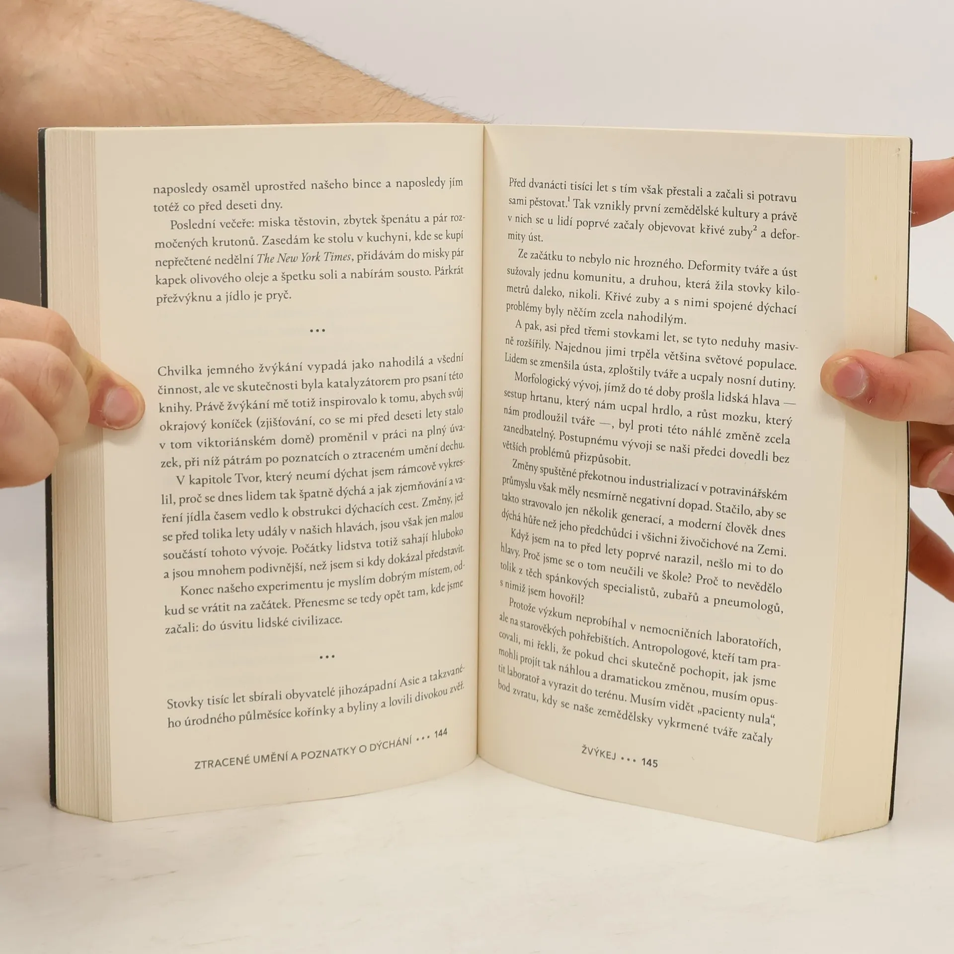 Nádech, výdech a znovu. Zapomněli jsme tu nejpřirozenější věc na světě? Minimálně v posledních letech se zdá, že lidé jsou čím dál posedlejší zdravým životním stylem. Více sportujeme, zajímáme se o správné stravovací návyky, studujeme spánek, otužujeme se, každou tělesnou funkci digitálně zaznamenáváme. Je tu však jeden proces, k němuž obracíme pozornost až ve chvíli potíží: dýchání. Novinář James Nestor si prošel podobnou zkušeností. Jeho dlouhodobé zdravotní problémy se vyřešily až díky dechovým cvičením, k nimž se zpočátku stavěl nedůvěřivě. Poté co se Nestor znovu naučil dýchat, vyrazil na cesty, aby našel odpověď na otázku: Zapomíná lidstvo tu zdánlivě nejjednodušší věc na světě? Autor nehledá jen v plicních laboratořích, ale rovněž u pěveckých sborů, na starověkých pohřebištích, sovětských výzkumných základnách nebo v ulicích Săo Paula. Porovnává vědecké poznatky z oblasti fyziologie, biochemie či psychologie s jogínskými a dalšími tradicemi a ukazuje, že dýchání je naprostý základ našeho bytí. Jen možná trochu jinak, než by se dalo čekat.