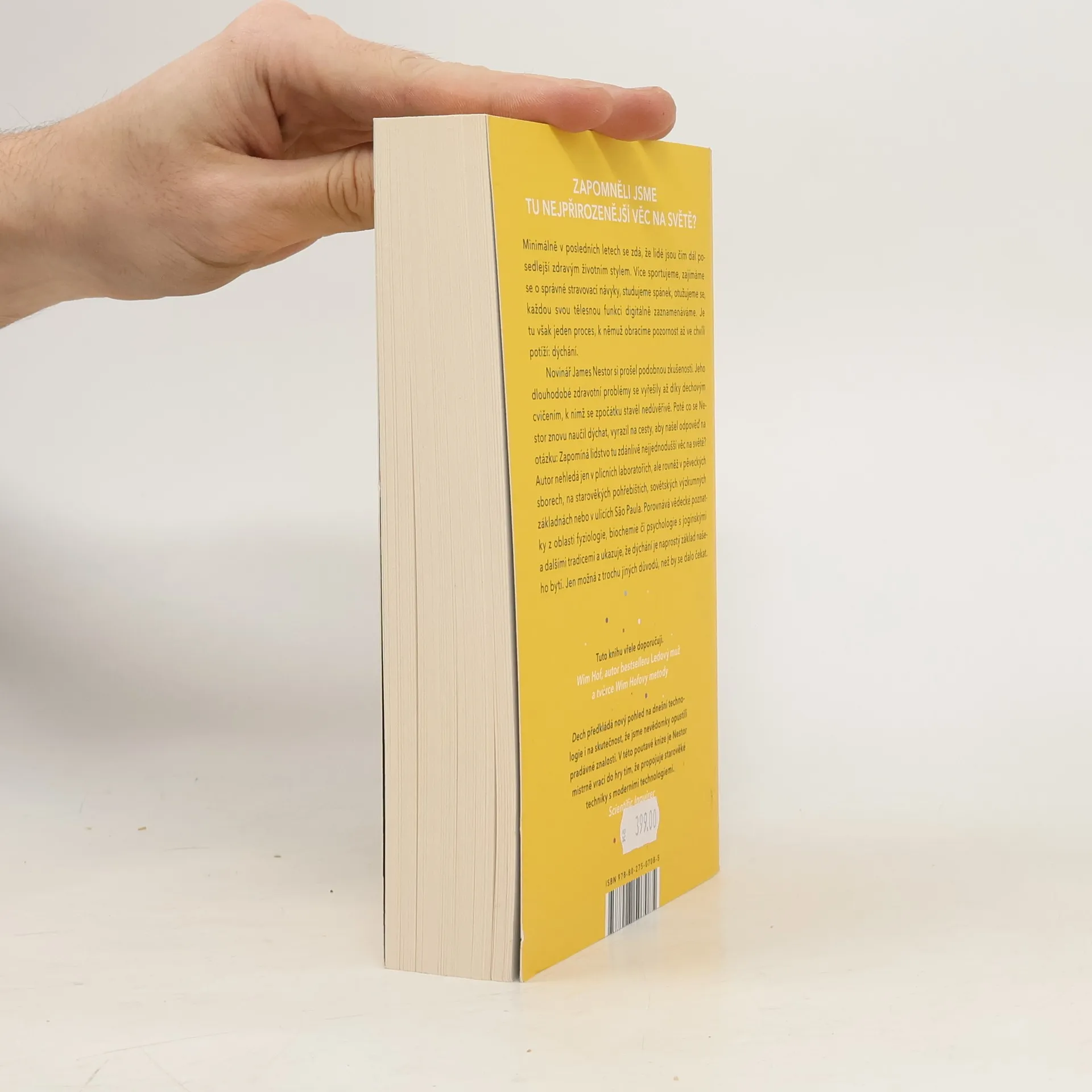 Nádech, výdech a znovu. Zapomněli jsme tu nejpřirozenější věc na světě? Minimálně v posledních letech se zdá, že lidé jsou čím dál posedlejší zdravým životním stylem. Více sportujeme, zajímáme se o správné stravovací návyky, studujeme spánek, otužujeme se, každou tělesnou funkci digitálně zaznamenáváme. Je tu však jeden proces, k němuž obracíme pozornost až ve chvíli potíží: dýchání. Novinář James Nestor si prošel podobnou zkušeností. Jeho dlouhodobé zdravotní problémy se vyřešily až díky dechovým cvičením, k nimž se zpočátku stavěl nedůvěřivě. Poté co se Nestor znovu naučil dýchat, vyrazil na cesty, aby našel odpověď na otázku: Zapomíná lidstvo tu zdánlivě nejjednodušší věc na světě? Autor nehledá jen v plicních laboratořích, ale rovněž u pěveckých sborů, na starověkých pohřebištích, sovětských výzkumných základnách nebo v ulicích Săo Paula. Porovnává vědecké poznatky z oblasti fyziologie, biochemie či psychologie s jogínskými a dalšími tradicemi a ukazuje, že dýchání je naprostý základ našeho bytí. Jen možná trochu jinak, než by se dalo čekat.