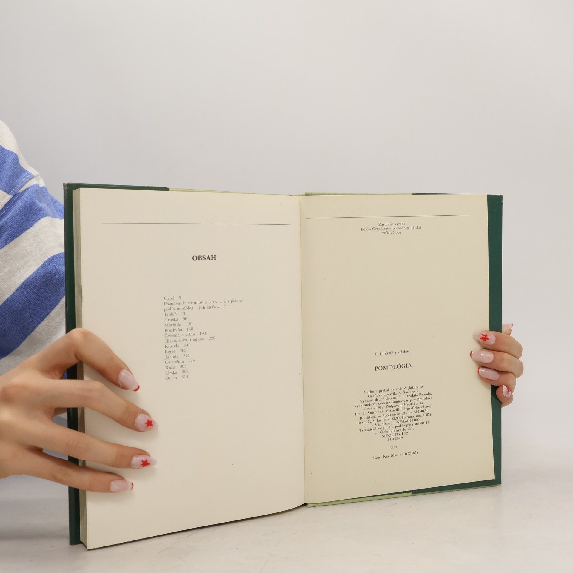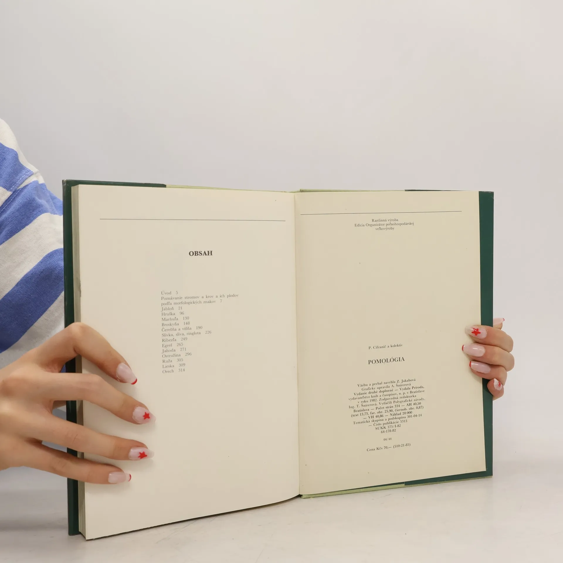 Kapitoly: Poznávanie stromov a krov a ich plodov podľa morfologických znakov, Jabloň, Hruška, Marhuľa, Broskyňa, Čerešňa a višňa, Slivka, Sliva, Ringlota, Ríbezľa, Egreš, Jahoda, Ostružina, Ruža, Lieska, Orech. Cena knihy v čase vydania: 70 Kčs.