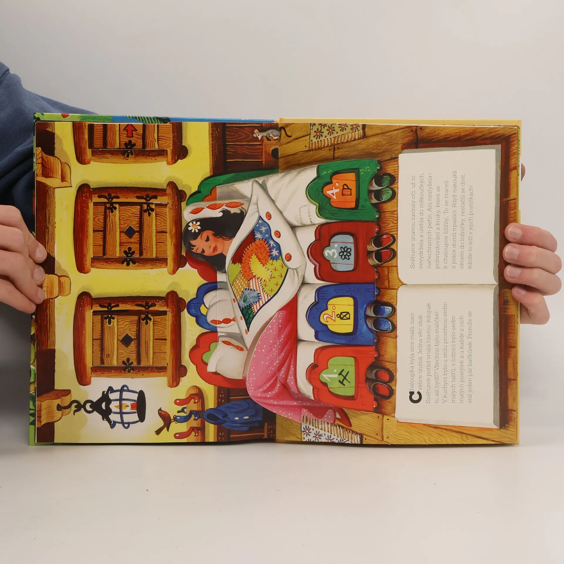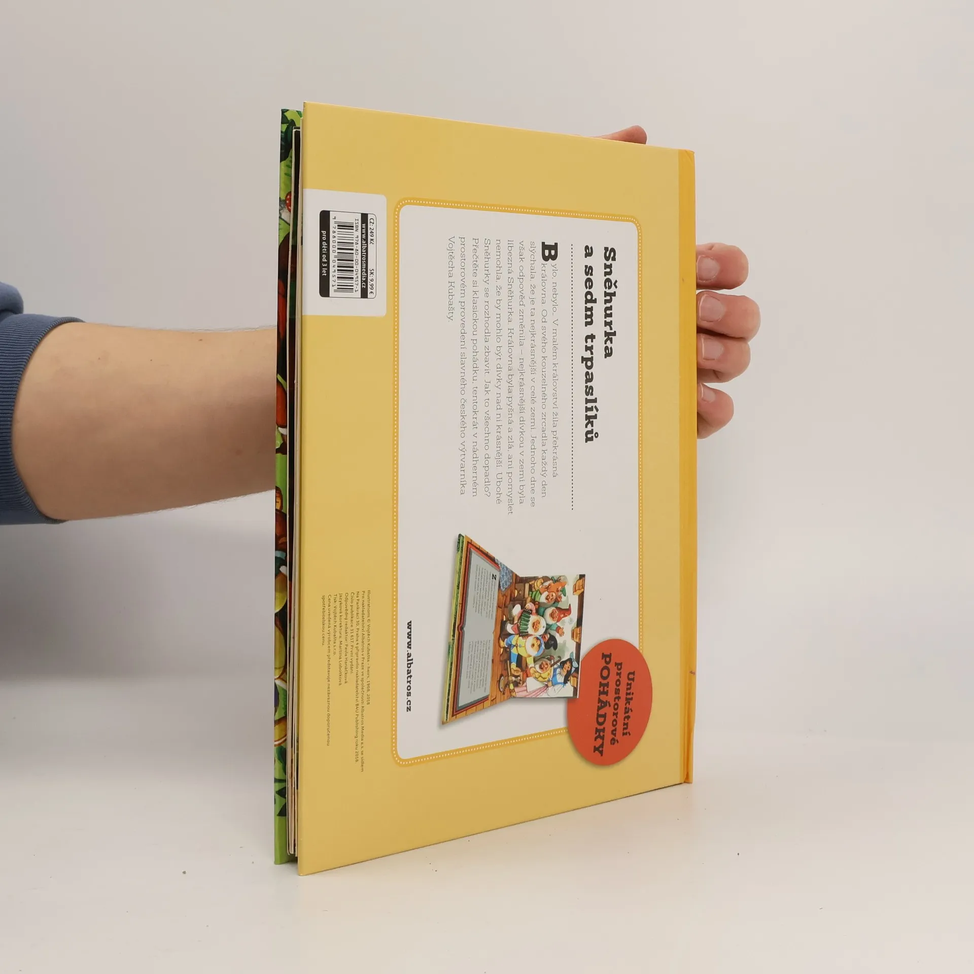 Bylo, nebylo. V malém království žila překrásná královna. Od svého kouzelného zrcadla každý den slýchala, že je ta nejkrásnější v celé zemi. Jednoho dne se však odpověď změnila - nejkrásnější dívkou v zemi byla líbezná Sněhurka. Královna byla pyšná a zlá, ani pomyslet nemohla, že by mohlo být dívky nad ni krásnější. Ubohé Sněhurky se rozhodla zbavit. Jak to všechno dopadlo? Přečtěte si klasickou pohádku, tentokrát v nádherném prostorovém provedení slavného českého výtvarníka Vojtěcha Kubašty.