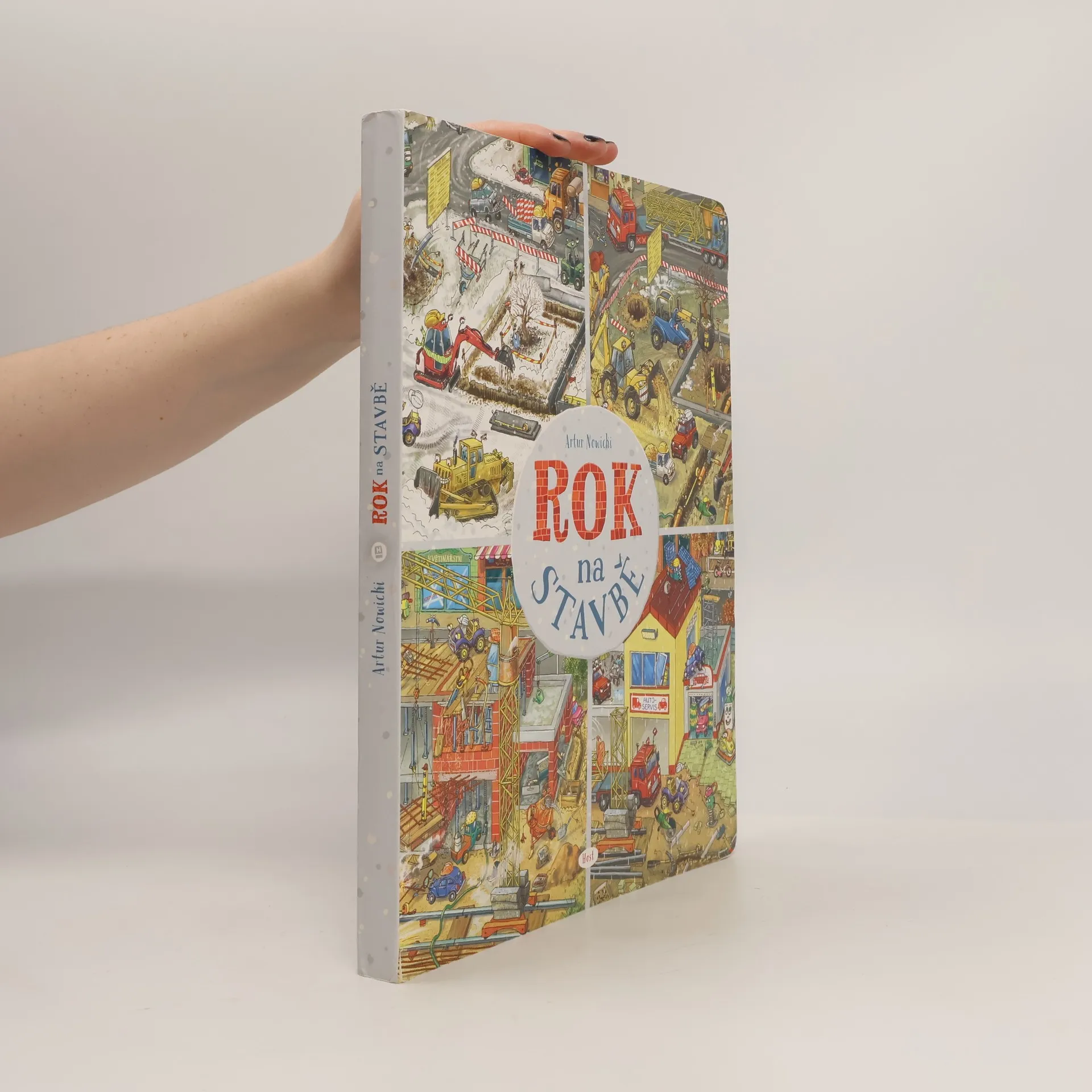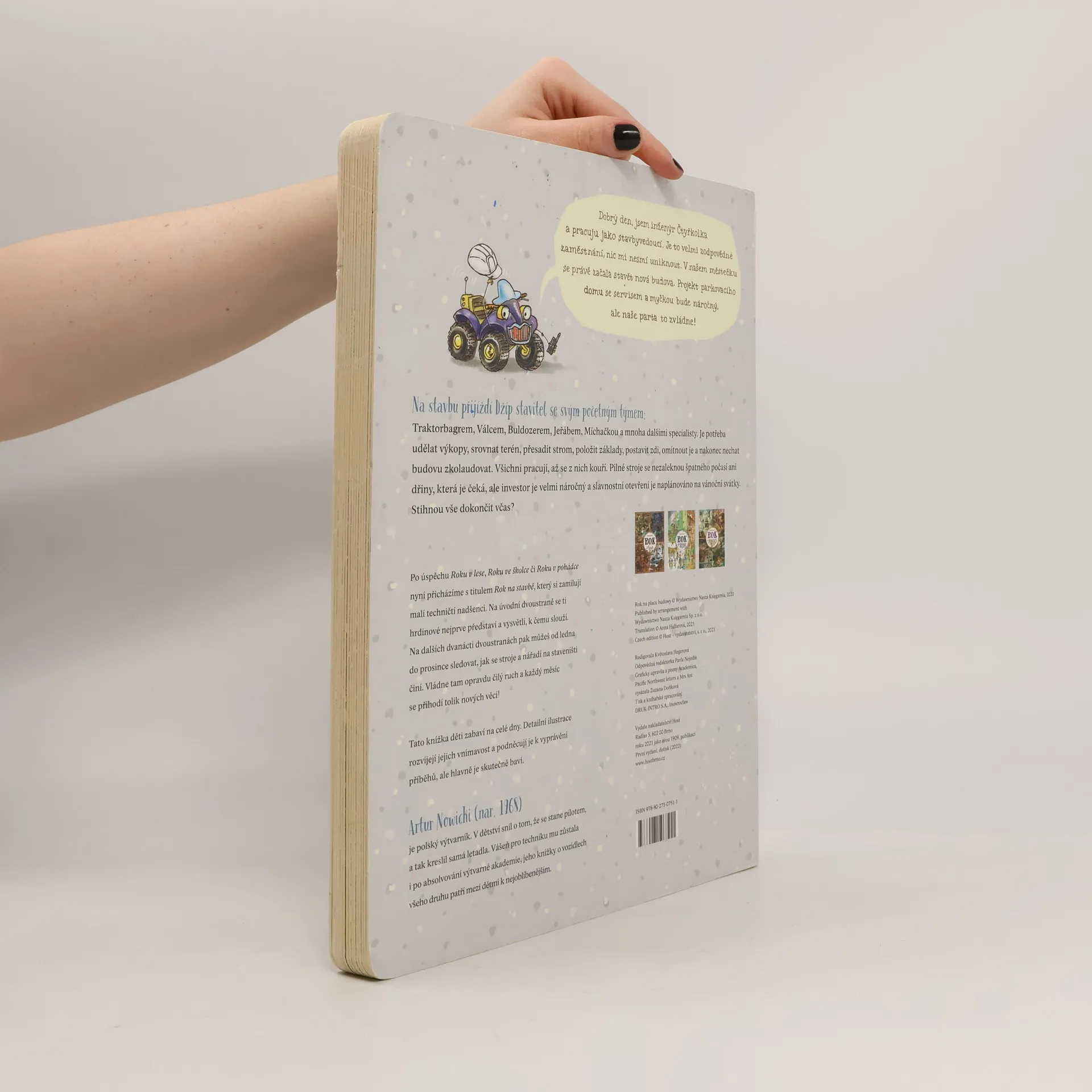 Konečně přírůstek do rodiny Roků, který uspokojí malé technické nadšence! S vášní pro vozidla se některé děti rodí. A zejména stavební stroje v nich vzbuzují úžas srovnatelný s fascinací jiného dětského kmene — pro dinosaury. Poznáte je snadno. Jejich první slovo není „máma“, ale „moto“. Hřiště je nebaví, zato na nedalekém staveništi dokážou dělat odborný stavební dozor klidně půl směny. Ve dvou letech vám vysvětlí rozdíl mezi bagrem pásovým a kolovým a na rozdíl od vás vědí, že žába neskáče jen po blátě, ale taky na stavbě a ve skutečnosti se jí říká vibrační pěch. Po úspěšném Roku v lese, Roku ve školce či Roku v pohádce přibude do této série další svazek — Rok na stavbě. Od ledna do prosince můžete sledovat čilý ruch na staveništi: od vyměřování přes terénní úpravy a výstavbu až po závěrečnou kolaudaci. Polidštěné stavební stroje a další užitečné nástroje mají osobitý charakter a jejich pracovní nasazení lze sledovat v rámci daného měsíce i napříč celým rokem. Přehledně je představí úvodní dvoustrana, která dětem (i vám! ) osvětlí mnohé technické procesy související se stavbou.