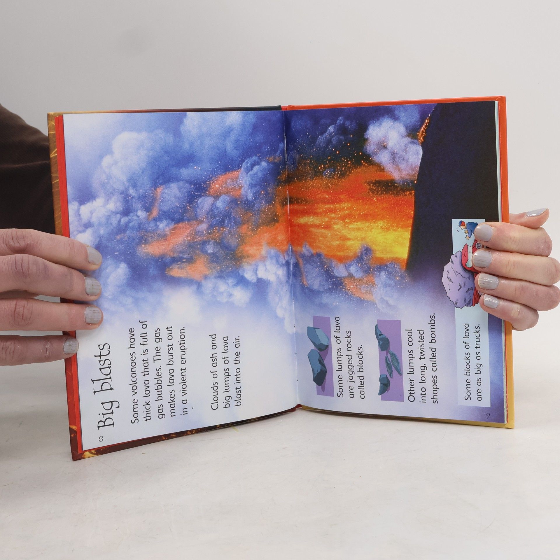 Text and pictures describe many aspect of volcanoes including eruptions, lava rivers, ash clouds, steaming springs, and more.
