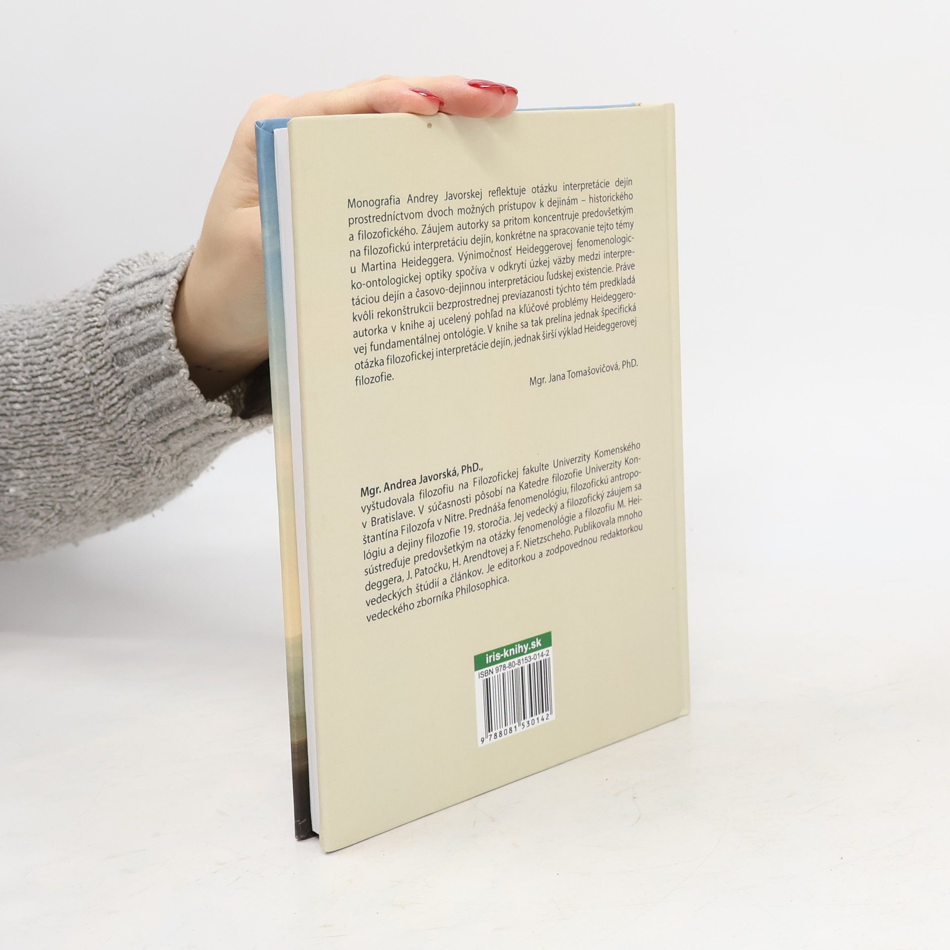Monografia reflektuje otázku interpretácie dejín prostredníctvom historického a filozofického prístupu, pričom sa koncentruje na filozofickú interpretáciu dejín u Martina Heideggera. Výnimočnosť Heideggerovej fenomenologicko- ontologickej optiky spočíva v odkrytí úzkej väzby medzi interpretáciou dejín a časovo-dejinnou interpretáciou ľudskej existencie. Kvôli rekonštrukcii bezprostrednej previazanosti týchto tém predkladá autorka ucelený pohľad na kľúčové problémy Heideggerovej fundamentálnej ontológie.