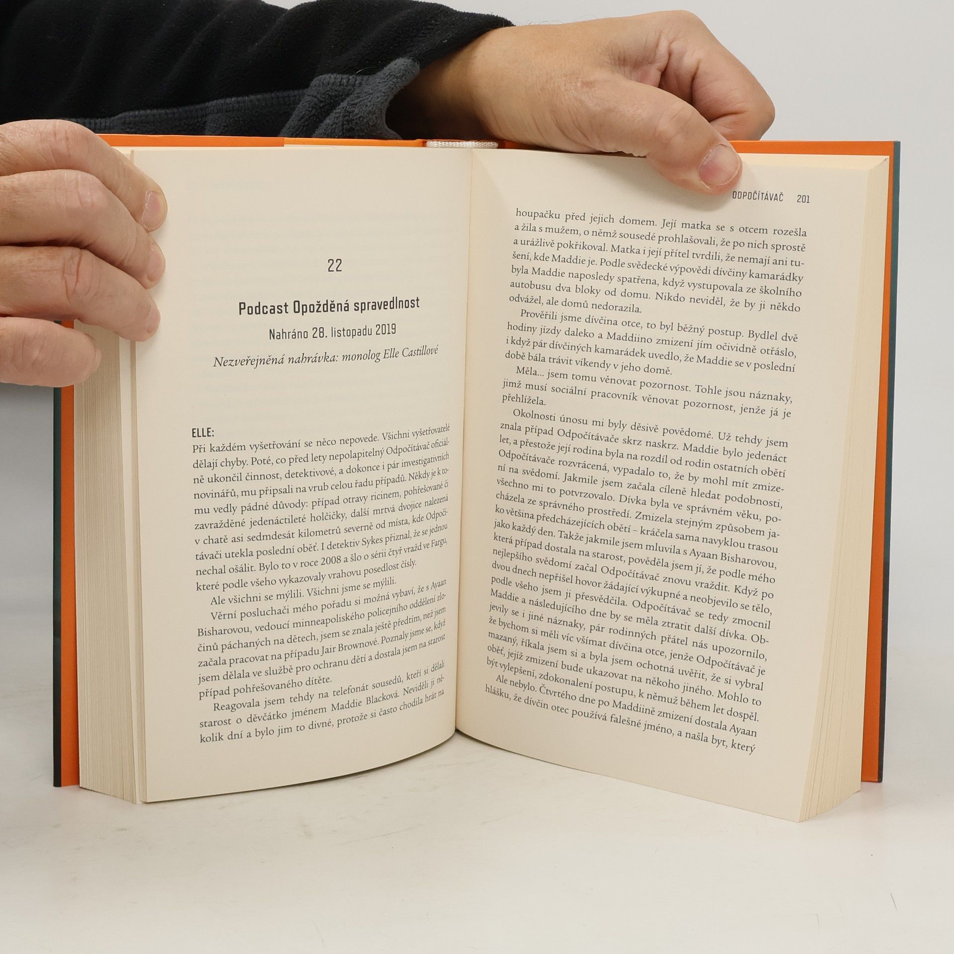 Strhující debutový thriller o sérii rituálních vražd, která zůstala nevyřešená – a nedokončená. Elle Castillová se ve svém podcastu Odložená spravedlnost už dvě desetiletí úspěšně věnuje starým kriminálním případům. Teď otevřela ten, který ji zajímá nejvíc: případ Odpočítávače, jenž před zhruba dvaceti lety unesl a následně brutálně zabil vždy trojici dívek; každá z nich byla o rok mladší než ta předchozí. U jedenácté oběti, jedenáctileté dívky, se však hrůzný řetězec přerušil. Nikdo nevěděl proč. Policie měla zato, že vrah spáchal sebevraždu, ale Elle tomu nevěří a pouští se do pátrání. Pak však zmizí jedenáctiletá Amanda...