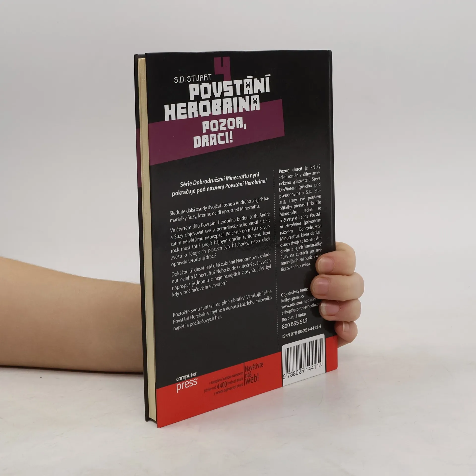 Série Dobrodružství Minecraftu nyní pokračuje pod názvem Povstání Herobrina! Sledujte další osudy dvojčat Joshe a Andrého a jejich kamarádky Suzy, kteří se ocitli uprostřed Minecraftu. V čtvrtém dílu Dobrodružství Minecraftu budou Josh, André a Suzy objevovat své superhrdinské schopnosti a čelit zatím největšímu nebezpečí. Po cestě do města Silverrock musí totiž projít bájným dračím teritoriem. Jsou zvěsti o létajících plazech jen báchorky nebo okolí opravdu terorizují draci? Dokážou tři desetileté děti zabránit Herobrinovi v ovládnutí celého Minecraftu? Nebo bude skutečný svět vydán napospas jednomu z nejmocnějších zlosynů, jaký byl kdy v počítačové hře stvořen? Roztočte svou fantazii na plné obrátky! Vzrušující série Dobrodružství Minecraftu chytne a nepustí každého milovníka napětí a počítačových her. Pozor, draci! je krátký sci-fi román z dílny amerického spisovatele Steva DeWintera (píšícího pod pseudonymem S.D. Stuart), který své poutavé příběhy přenáší i do říše Minecraftu. Jedná se o čtvrtý díl série Povstání Herobrina (původním názvem Dobrodružství Minecraftu), která sleduje osudy dvojčat Joshe a Andrého a jejich kamarádky Suzy na cestách po nejtemnějších zákoutích kostičkovaného světa.