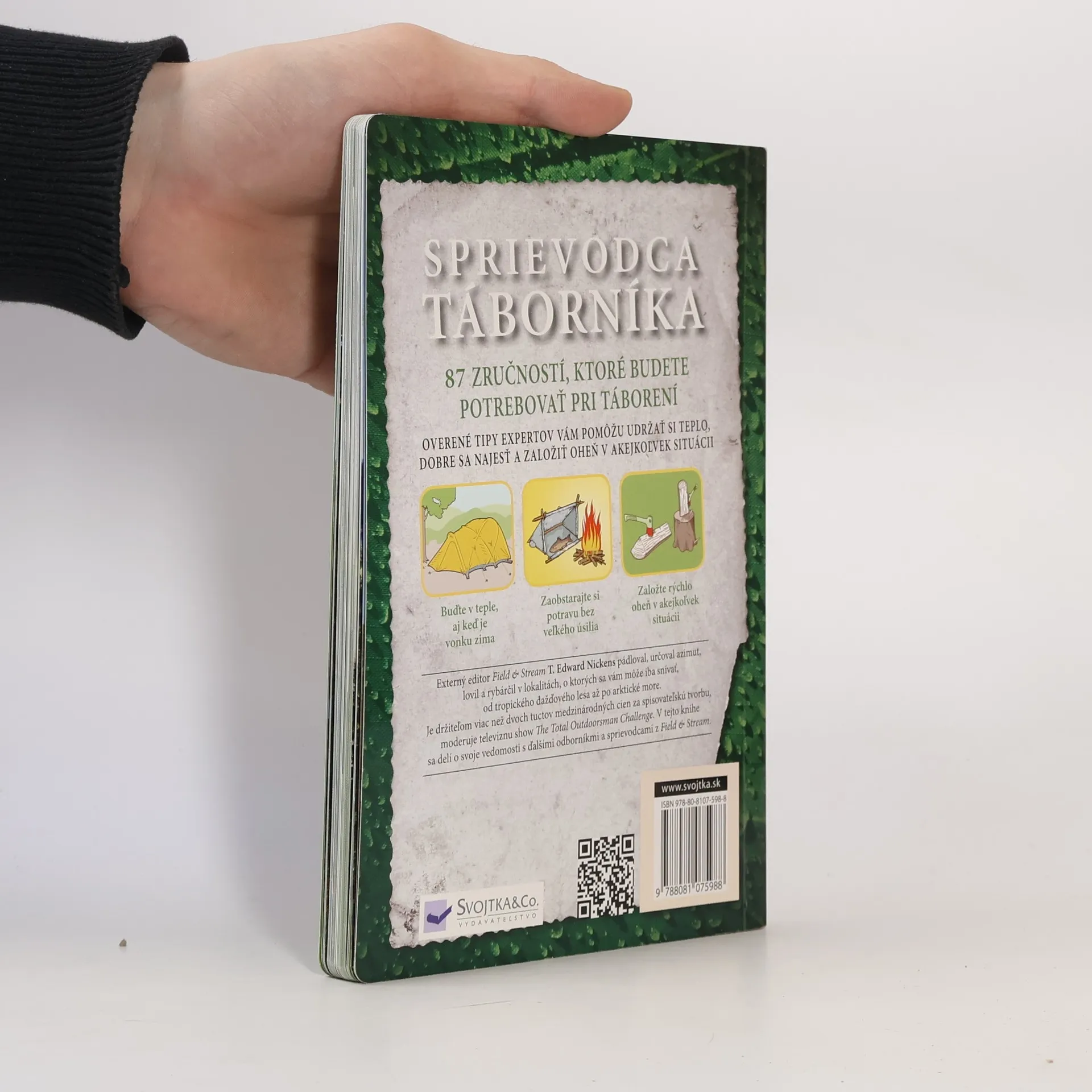 Externý editor Field & Stream T. Edward Nickens pádloval, určoval azimut, lovil a rybárčil v lokalitách, o ktorých sa Vám môže iba snívať. Od tropického dažďového lesa až po arktické more. Je držiteľom viac než dvoch tuctov medzinárodných cien za spisovateľskú tvorbu, moderuje televíznu show "The total Outdoorsman Challenge." V tejto knihe sa delí o svoje vedomosti s ďalšími odborníkmi a sprievodcami z Field & Stream. Naučíte sa, ako sa udržať v teple, aj keď je vonku zima, ako si zaobstarať potravu bez veľkého úsilia a ako založiť rýchlo oheň v akejkoľvek situácii. A mnoho ďalšieho. (anotácia knihy)