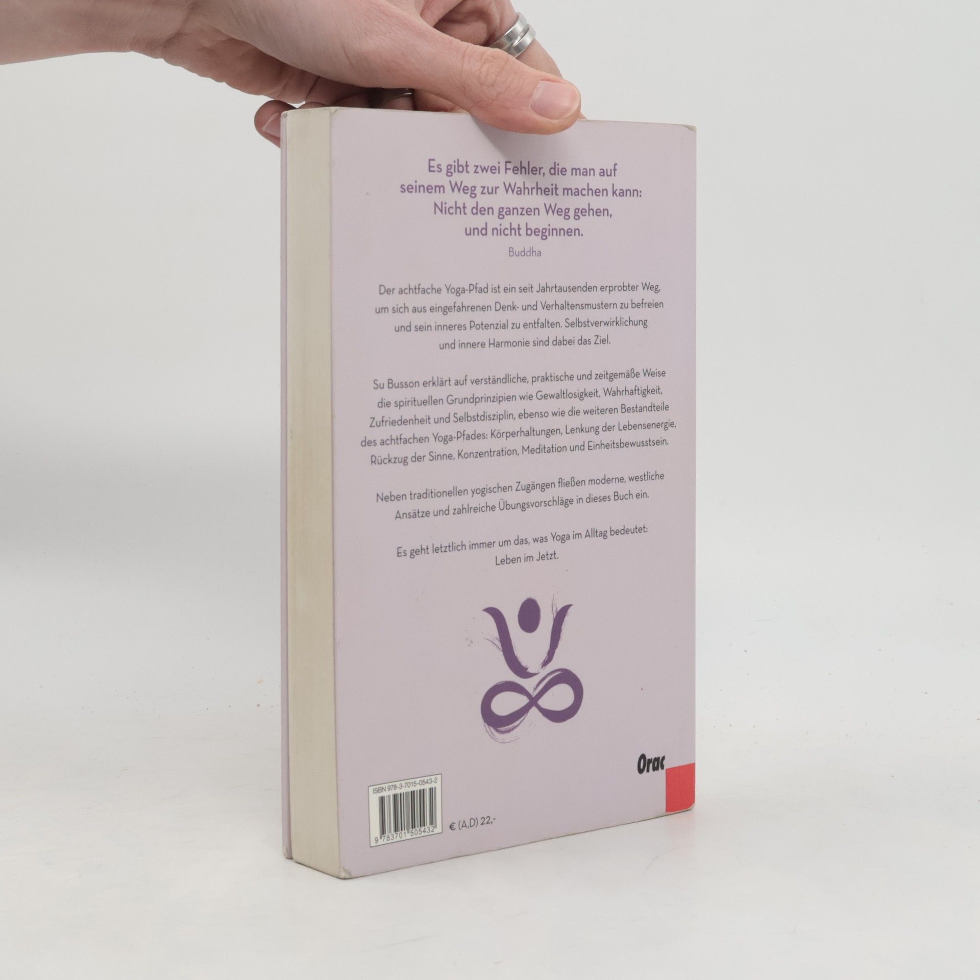 Ein Buch für Menschen auf der Suche nach sich selbst: Der achtfache Yoga-Pfad ist ein seit Jahrtausenden erprobter Weg, um sich aus eingefahrenen Denk- und Verhaltensmustern zu befreien und sein inneres Potenzial zu entfalten. Die einzelnen Glieder sind ein Schlüssel für einen besseren Umgang mit anderen Menschen, mit der Umwelt und mit sich selbst. Auf verständliche, praktische und zeitgemäße Weise erklärt Su Busson in ihrem neuen Buch die spirituellen Grundprinzipien des Yoga – etwa Gewaltlosigkeit, Wahrhaftigkeit, Zufriedenheit und Selbstdisziplin – ebenso wie die weiteren Bestandteile des Yoga-Weges: Körperhaltungen, Lenkung der Lebensenergie, Rückzug der Sinne, Konzentration, Meditation und Einheitsbewusstsein. Neben traditionellen yogischen Zugängen fließen moderne, westliche Ansätze und zahlreiche Übungsvorschläge in dieses Buch ein. Es geht darin letztlich immer um das, was Yoga im Alltag bedeutet: Leben im Jetzt.
