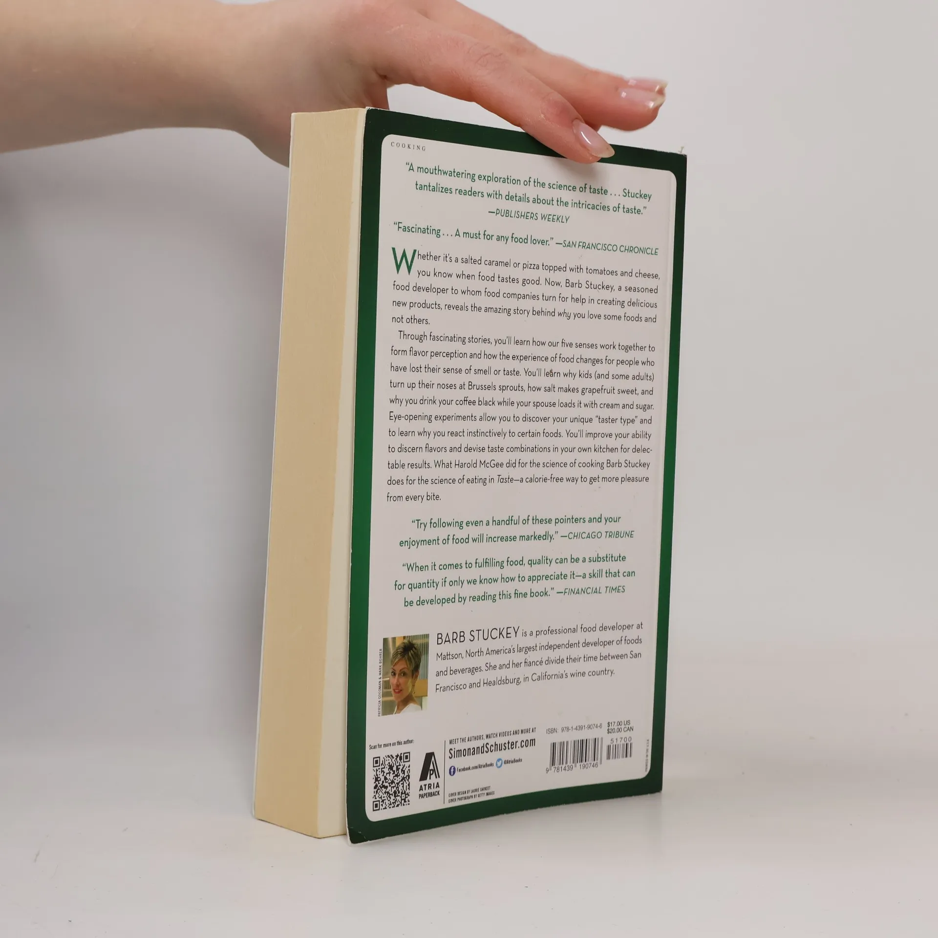 Whether it's a grilled cheese sandwich with tomato soup or a salted caramel coated in dark chocolate, you know when food tastes good. Now here's the amazing story behind why you love some foods and can't tolerate others. Whether it's a salted caramel or pizza topped with tomatoes and cheese, you know when food tastes good. Now, Barb Stuckey, a seasoned food developer to whom food companies turn for help in creating delicious new products, reveals the amazing story behind why you love some foods and not others. Through fascinating stories, you'll learn how our five senses work together to form flavor perception and how the experience of food changes for people who have lost their sense of smell or taste. You'll learn why kids (and some adults) turn up their noses at Brussels sprouts, how salt makes grapefruit sweet, and why you drink your coffee black while your spouse loads it with cream and sugar. Eye-opening experiments allow you to discover your unique "taster type" and to learn why you react instinctively to certain foods. You'll improve your ability to discern flavors and devise taste combinations in your own kitchen for delectable results. What Harold McGee did for the science of cooking Barb Stuckey does for the science of eating in Taste--a calorie-free way to get more pleasure from every bite.