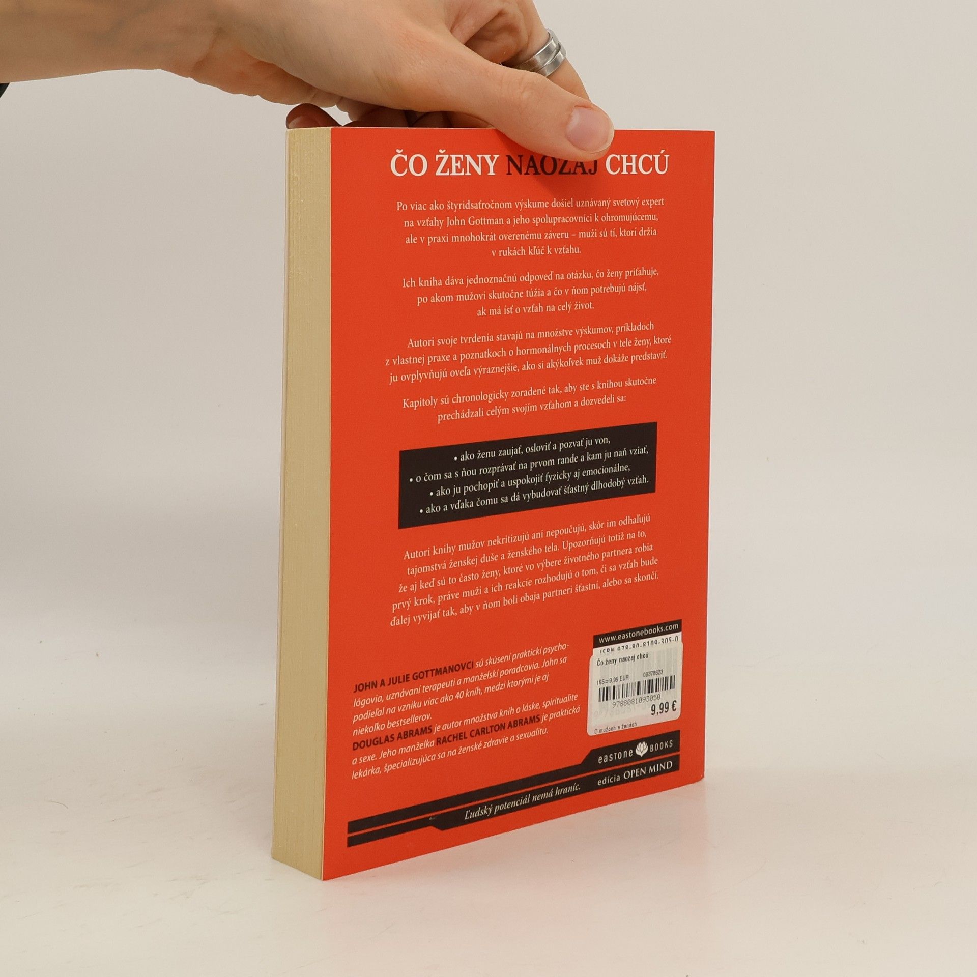 Po viac ako štyridsaťročnom výskume došiel uznávaný svetový expert na vzťahy John Gottman a jeho spolupracovníci k ohromujúcemu, ale v praxi mnohokrát overenému záveru – muži sú tí, ktorí držia v rukách kľúč k vzťahu. Autori svoje tvrdenia stavajú na množstve výskumov, príkladoch z vlastnej praxe a poznatkoch o hormonálnych procesoch v tele ženy, ktoré ju ovplyvňujú oveľa výraznejšie, ako si akýkoľvek muž dokáže predstaviť. Kapitoly sú chronologicky zoradené tak, aby ste s knihou skutočne prechádzali celým svojím vzťahom a dozvedeli sa, ako ženu zaujať, osloviť a pozvať ju von, o čom sa s ňou rozprávať na prvom rande a kam ju naň vziať, ako ju pochopiť a uspokojiť fyzicky aj emocionálne a vďaka čomu sa dá vybudovať šťastný dlhodobý vzťah.